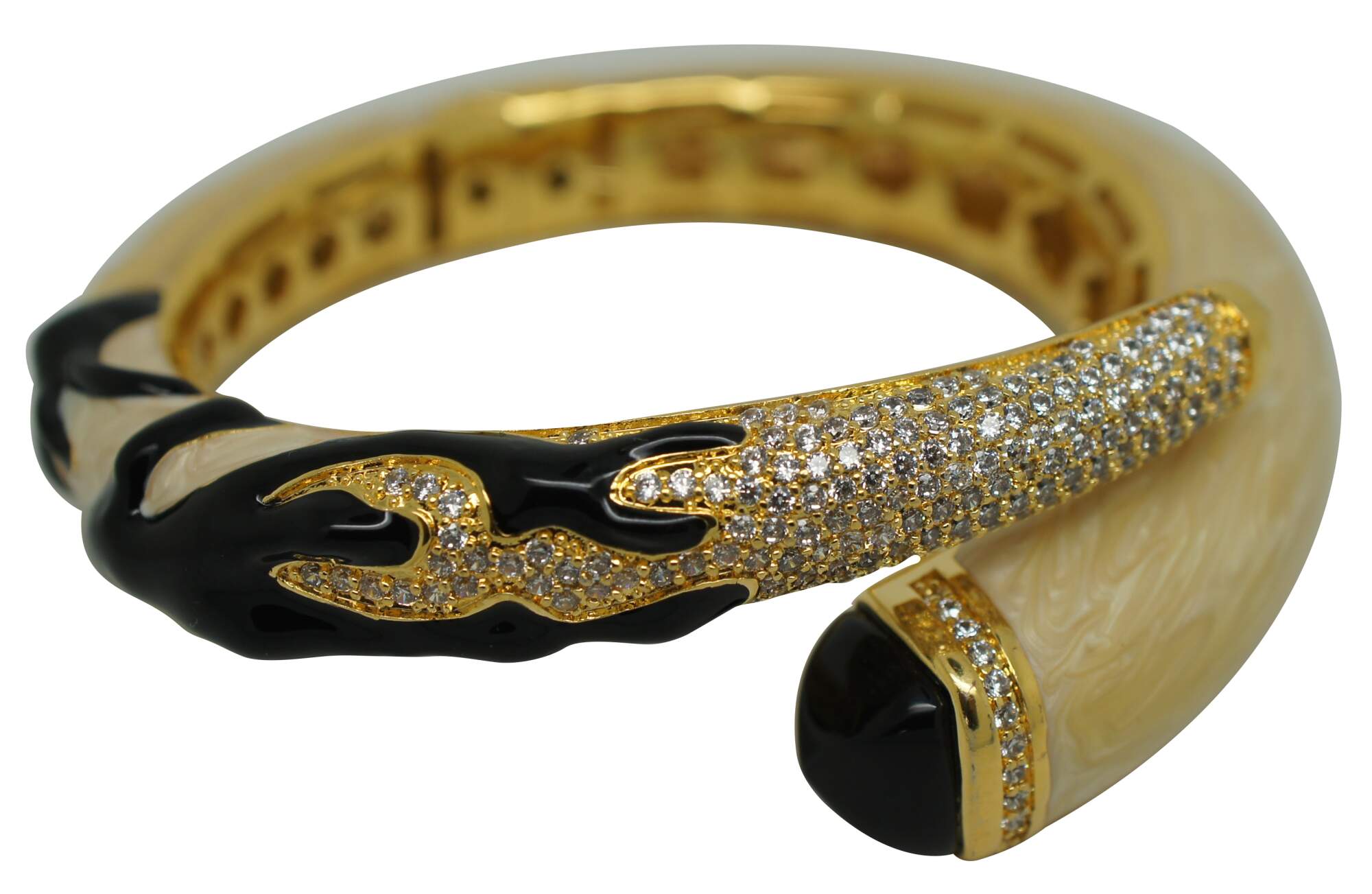 Elegant spring hinge bangle bracelet by Lauren G. Adams featuring swirling off white enamel with coral shaped black enamel accents, encrusted with white pave cubic zirconia and tipped with faceted black onyx on a brass and 18K gold plated frame.