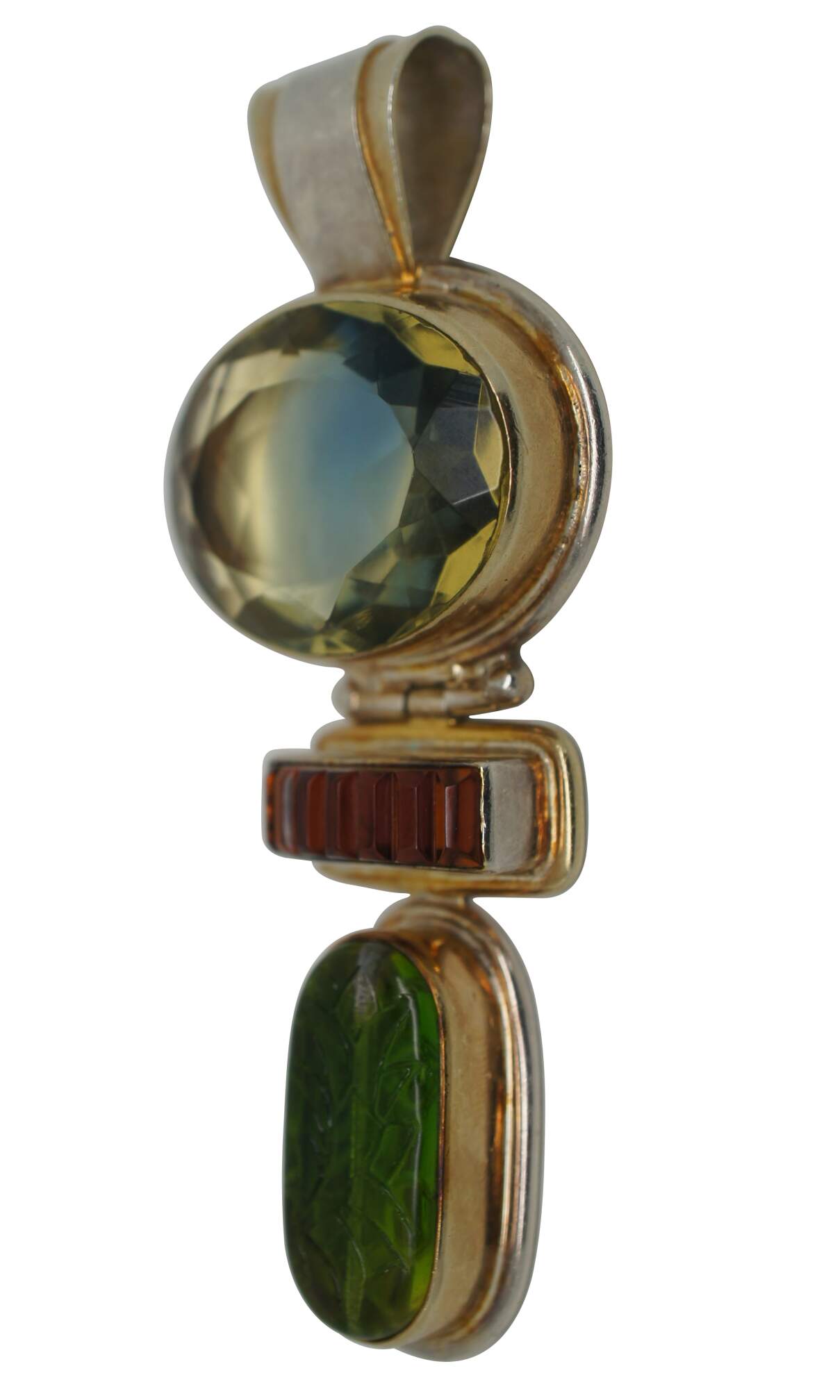 Vintage sterling silver 925 tiered or stacked pendant featuring an oval yellow bluish hue rhinestone, geometric carved amber stone, and green leaf pattern stone. Marked AM.