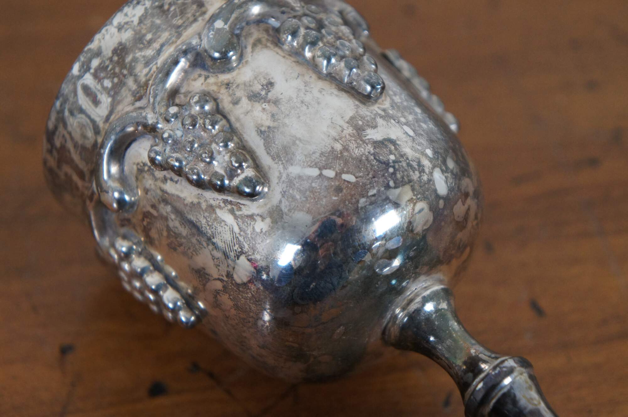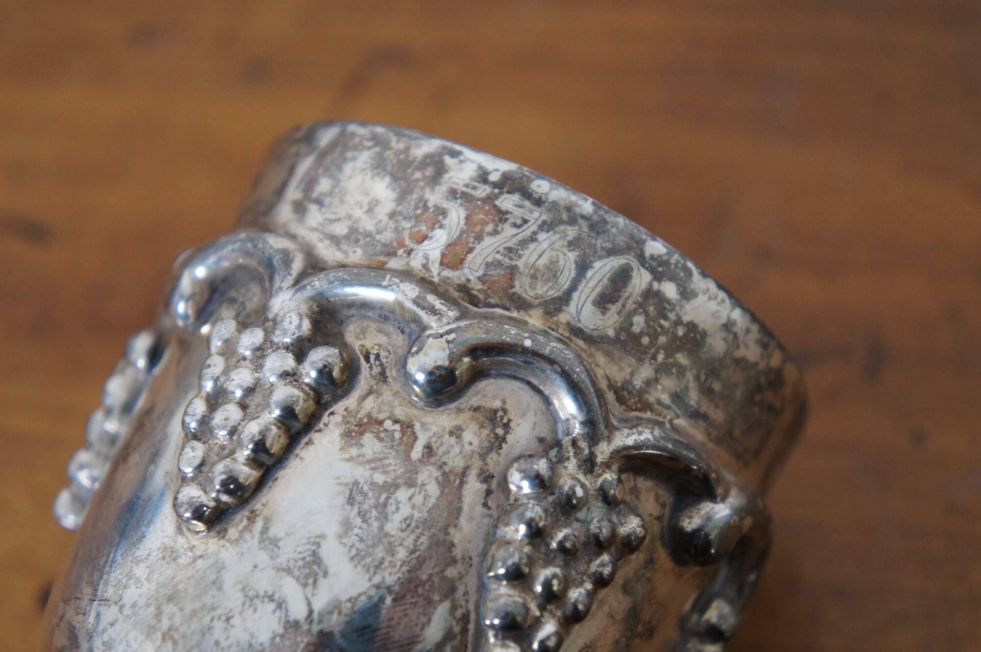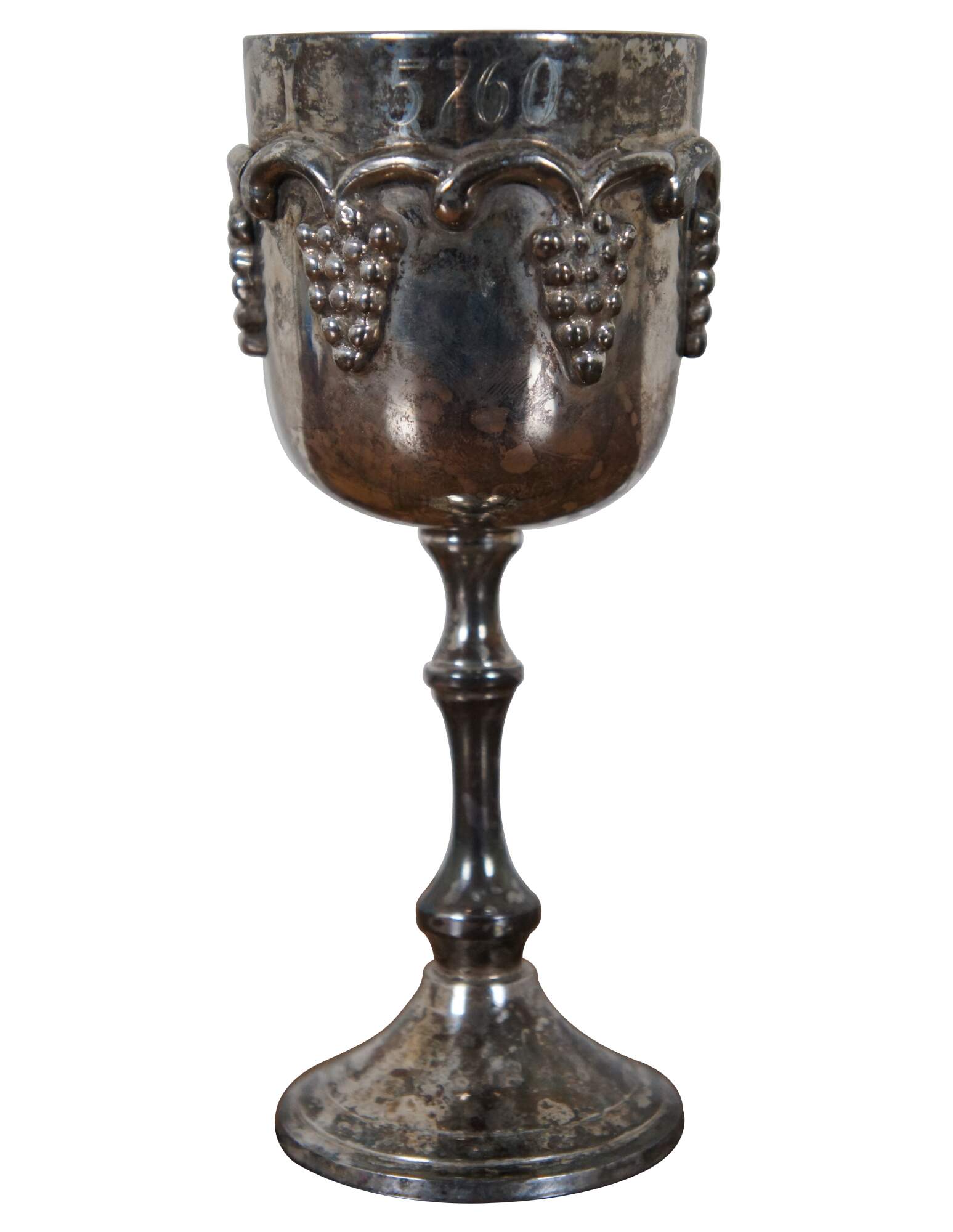 Vintage silver plated wine goblet / chalice / kiddush cup with raised relief vine and bunches of grapes, engraved at the upper edge with the Jewish year 5760. 5760 is the year circa 1999-2000.