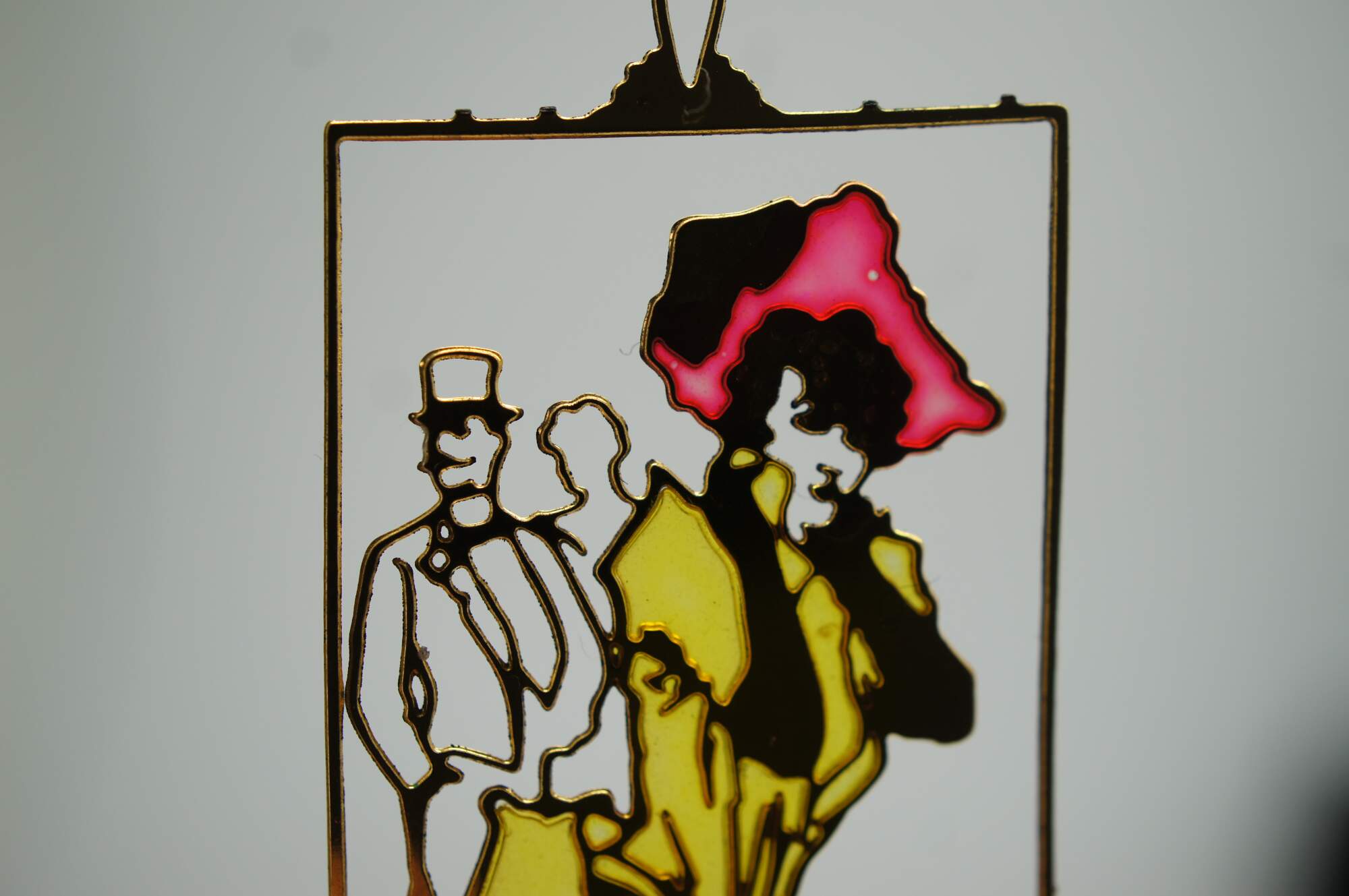 Pair of two rare Toulouse Lautrec silhouette necklace charms or pendants featuring a pierced gold plated frame with red and yellow enameled accents.