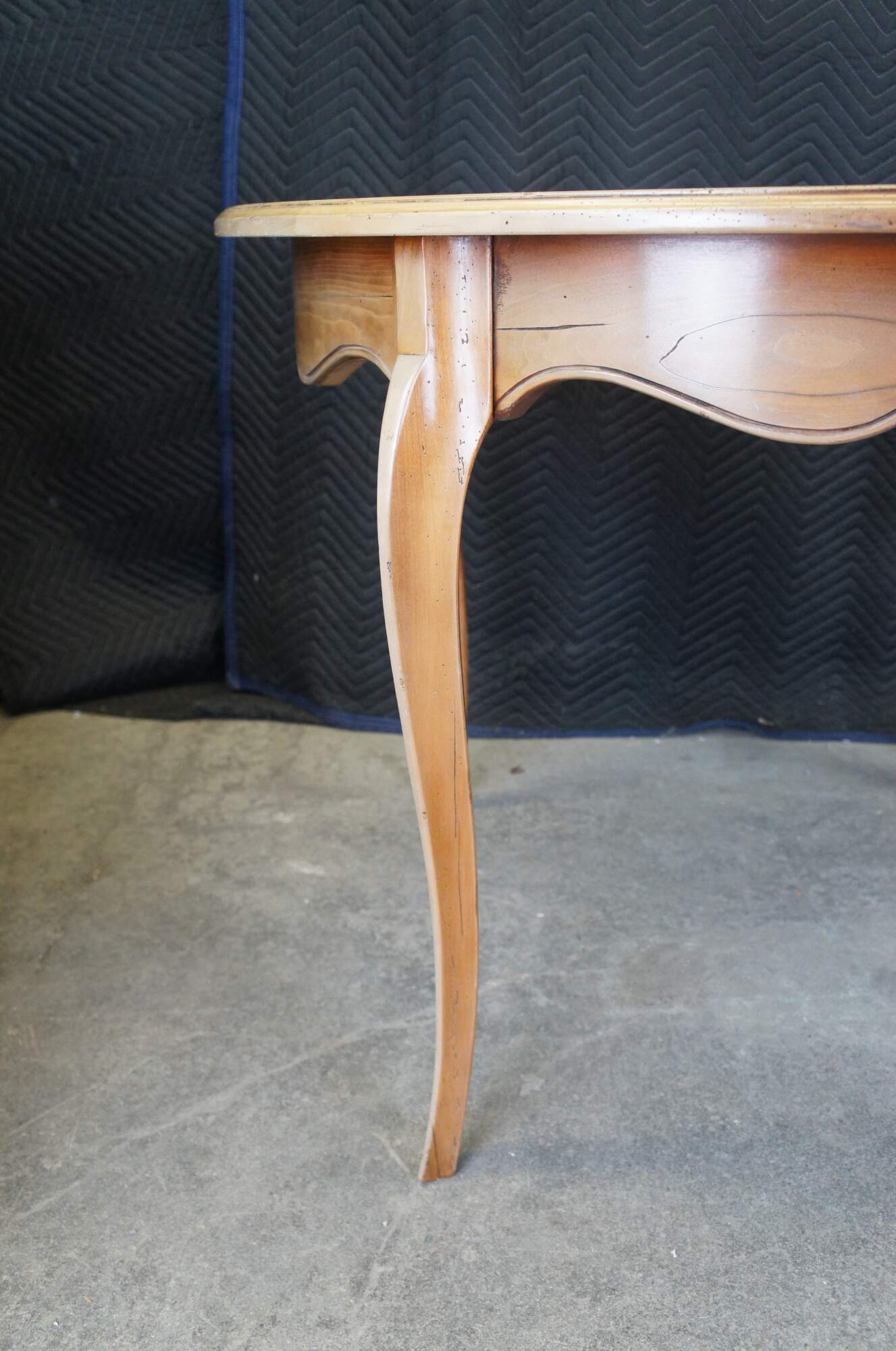 Good Overall; The table was in a sun room so there is heavy fading turning to a light walnut which some may prefer to the original finish which can be seen on the leaves. The leaves were in storage and rarely used on the table. a few scratches along top