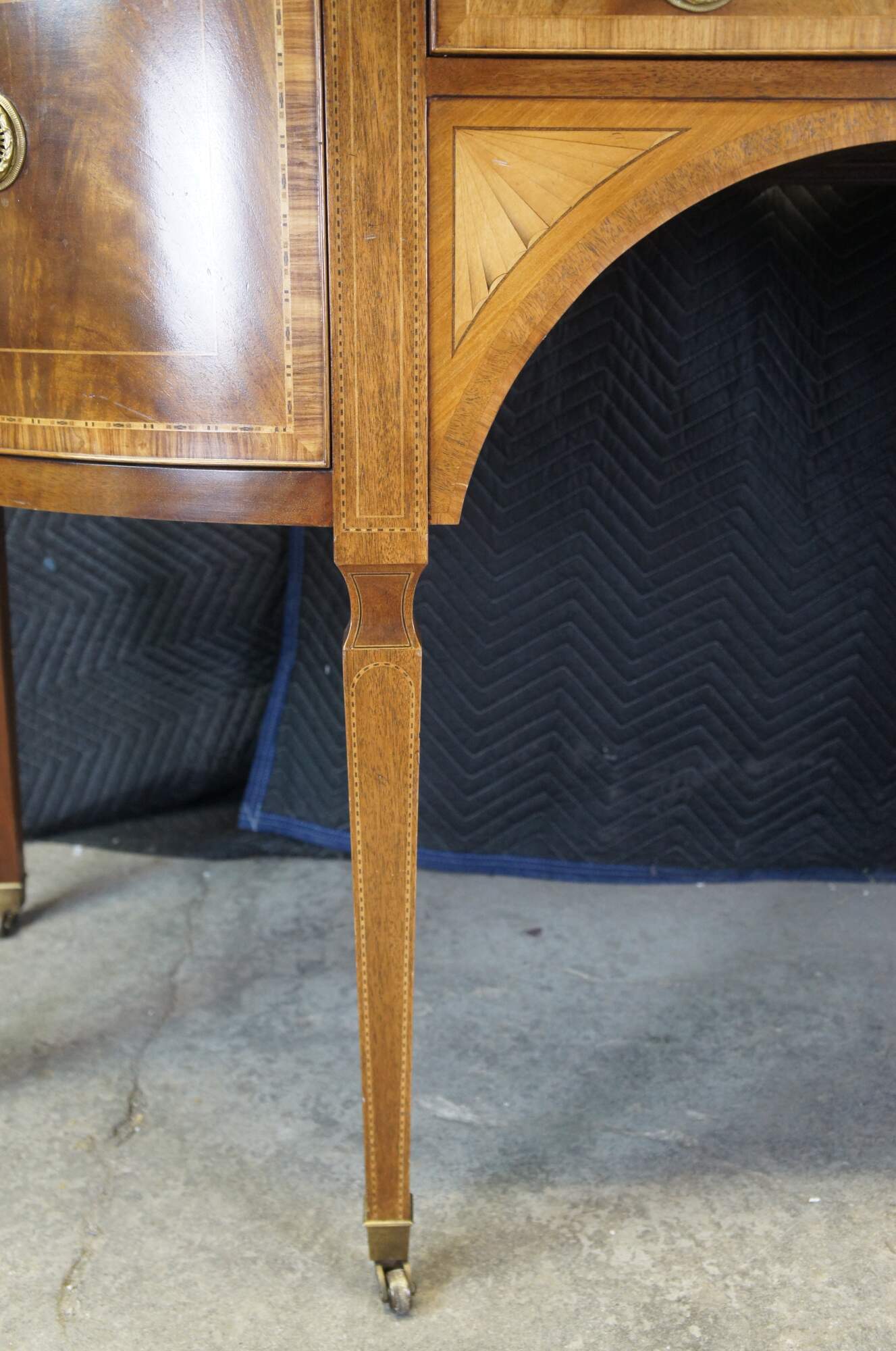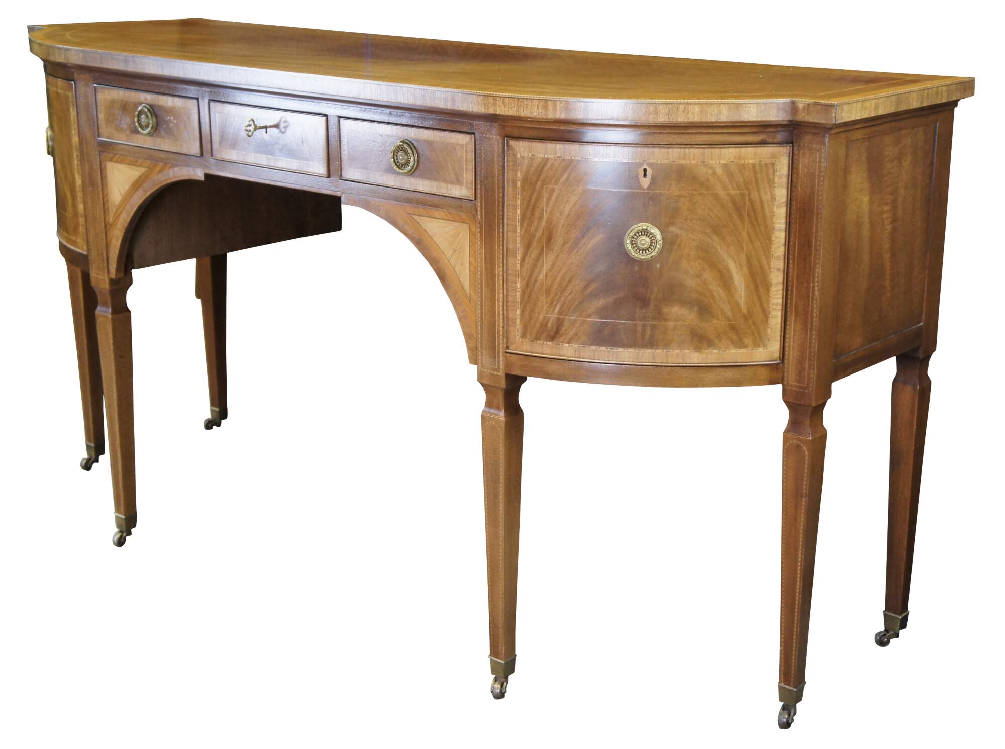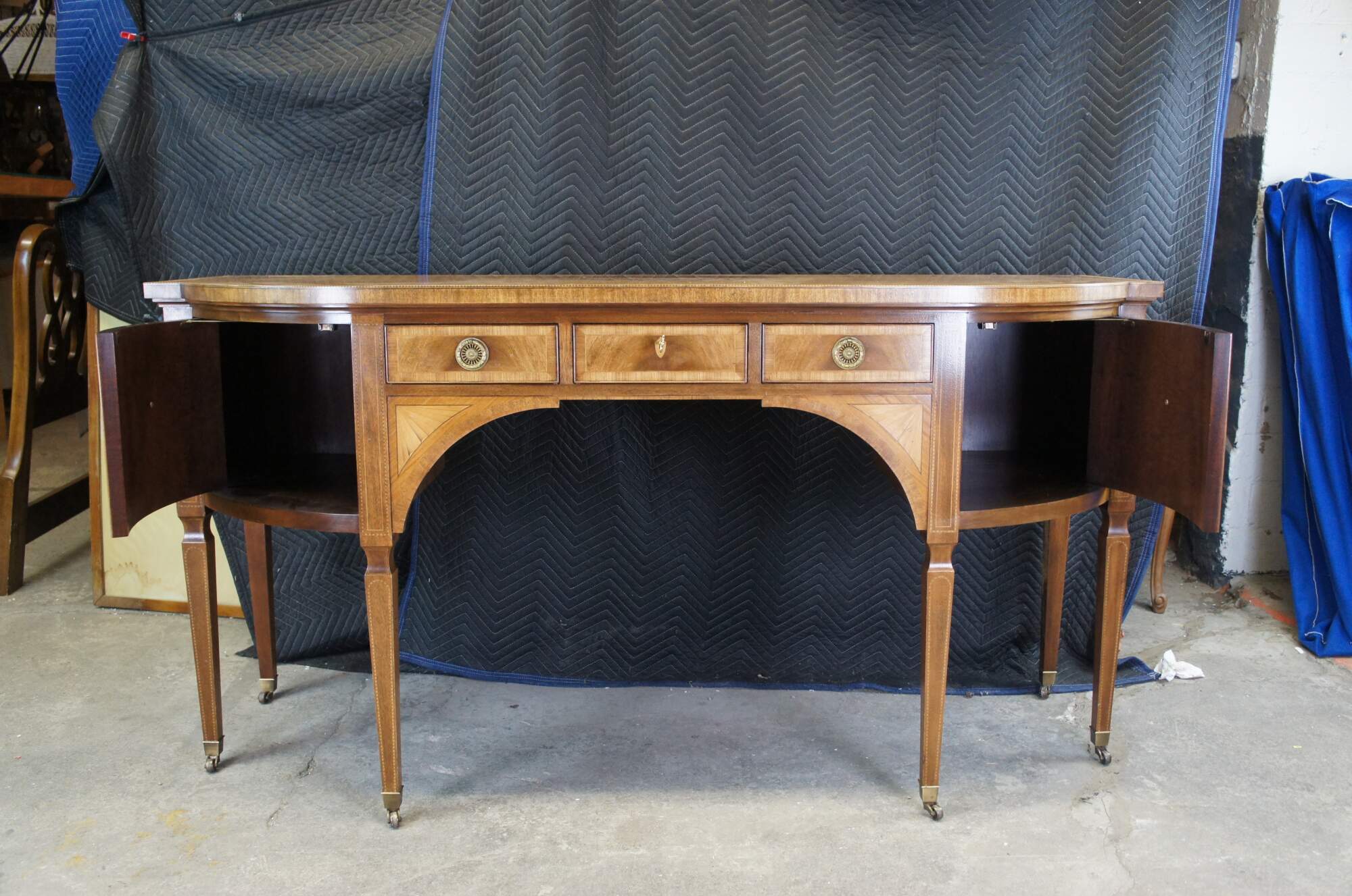 A rare and impressive Hepplewhite style buffet or sideboard from the noteworthy Stately Homes Collection by Baker Furniture, circa 1980s. Made from Mahogany with crotch veneer drawer fronts, cross banded with satinwood and tulip wood inlays. Featuring classical fan patterned medallions, stringing and checker framework. The sideboard has a bow front or demilune form with 3 dovetailed drawers within the frieze, two outer cabinets for storage and a knee hole at the center. Includes inlaid escutcheons, original key and pierced brass neoclassical style ring pulls. The case is supported by long square tapered legs leading to brass capped feet and casters.