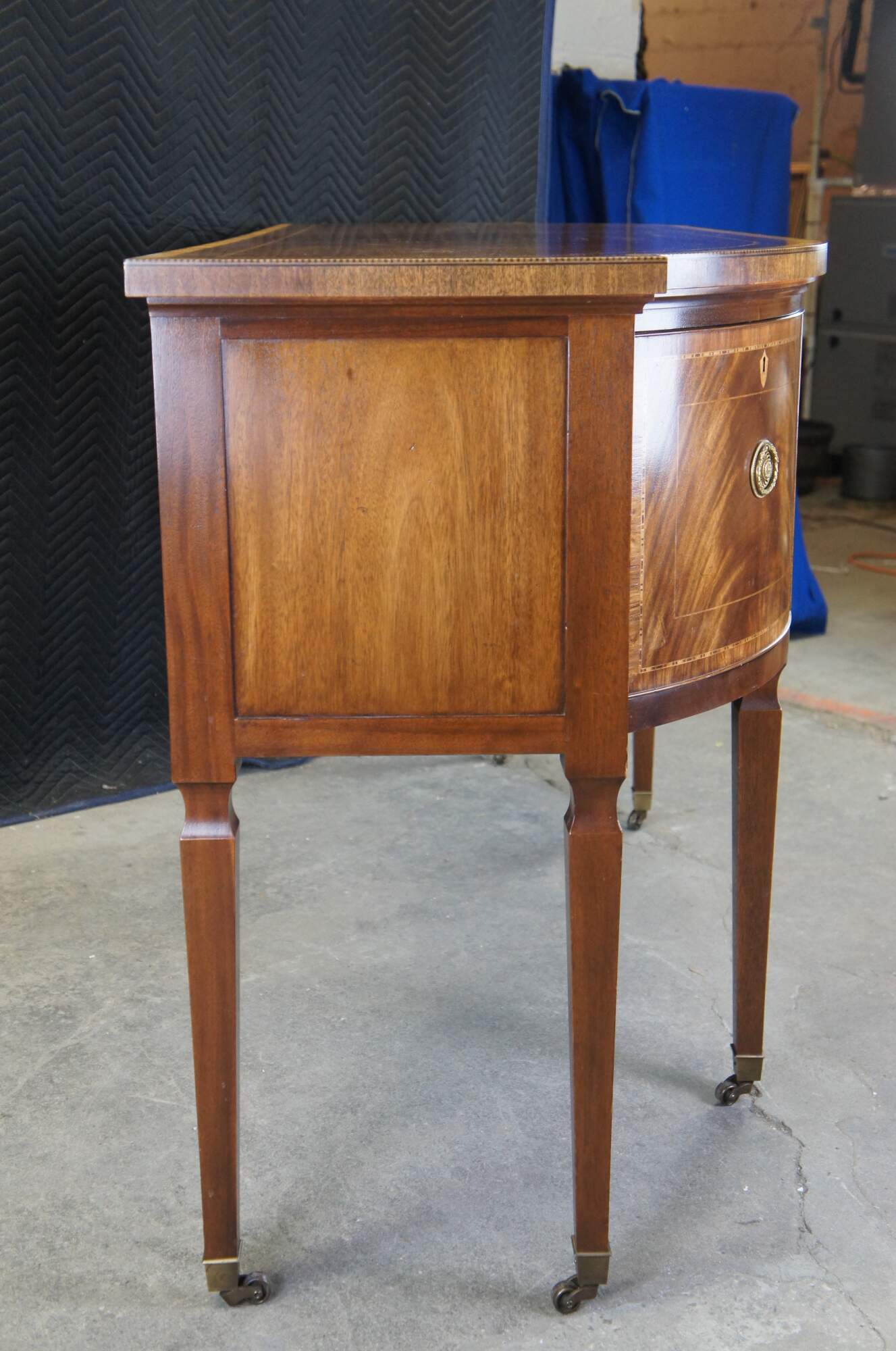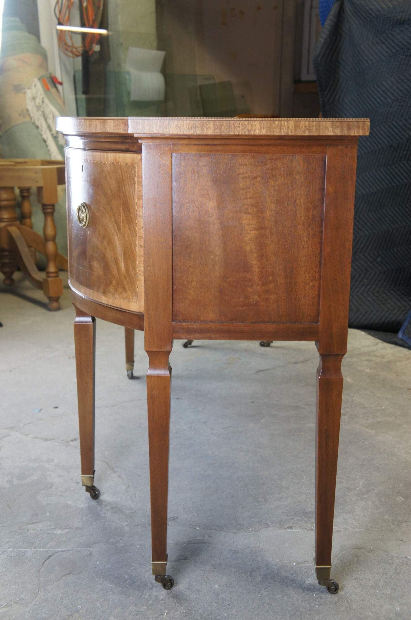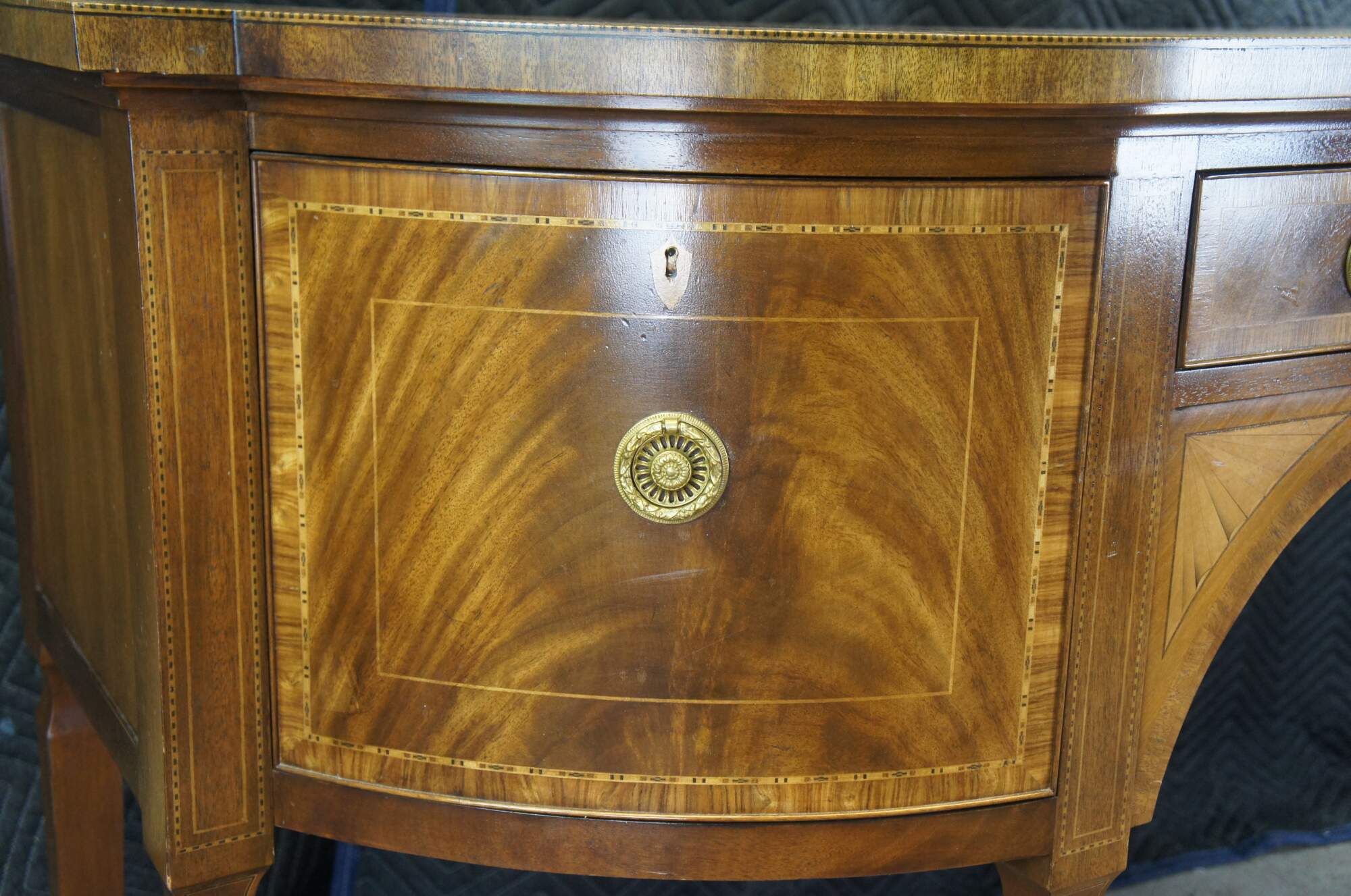 A rare and impressive Hepplewhite style buffet or sideboard from the noteworthy Stately Homes Collection by Baker Furniture, circa 1980s. Made from Mahogany with crotch veneer drawer fronts, cross banded with satinwood and tulip wood inlays. Featuring classical fan patterned medallions, stringing and checker framework. The sideboard has a bow front or demilune form with 3 dovetailed drawers within the frieze, two outer cabinets for storage and a knee hole at the center. Includes inlaid escutcheons, original key and pierced brass neoclassical style ring pulls. The case is supported by long square tapered legs leading to brass capped feet and casters.