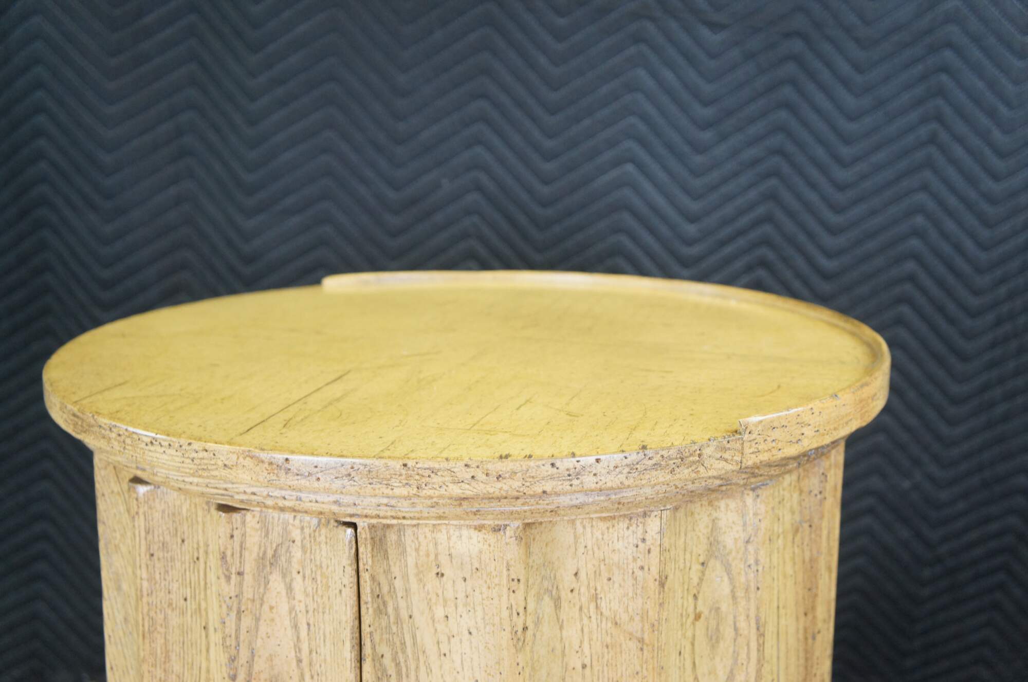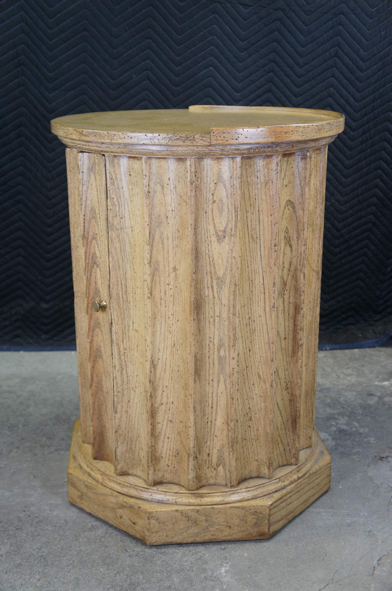 Classical pair of Baker Furniture Corinthian column style side tables, circa 1970s. Made from oak with with a round Matchbook veneer top, scalloped center and octagonal shaped base. Each cabinet opens to an interior shelf. Marked #2759 along underside. Perfect for use as end tables, nightstands, sculpture stands or stand along tables.