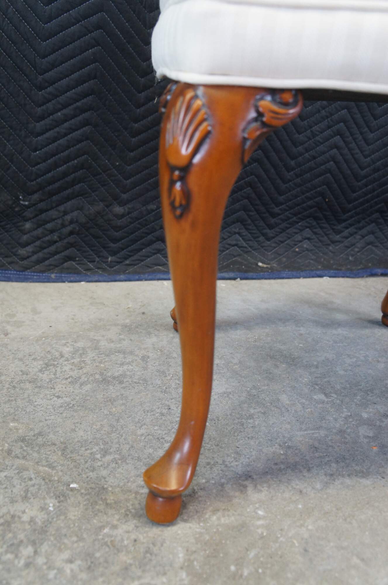 An exquisite set of 6 dining chairs from the Stately Homes Collection by Baker Furniture, circa 1980s. Made from mahogany with a vase shaped splat flanked by scrolled accents, an upholstered and striped seat and cabriole legs with scalloped knees.
