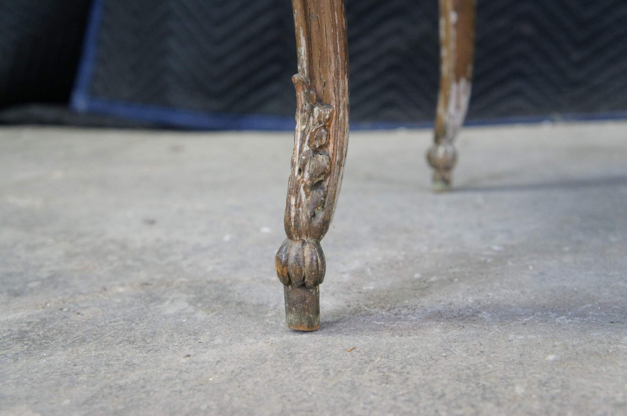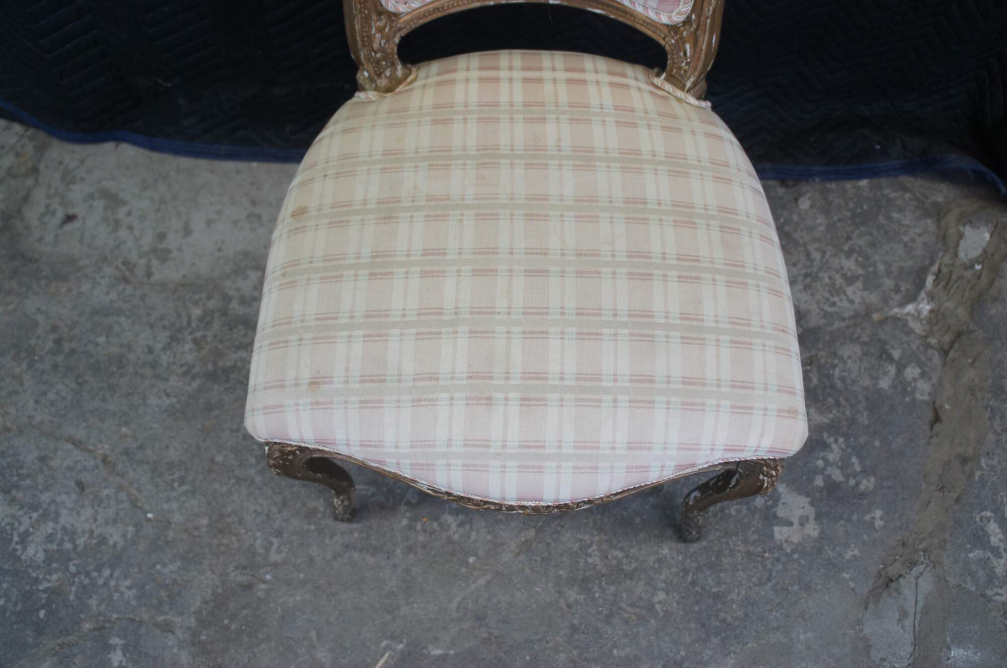 Antique French Louis XVI vanity chair featuring Neoclassical styling with carved ribbon crest, beaded and foliate accents, and serpentine legs with cabriole feet.