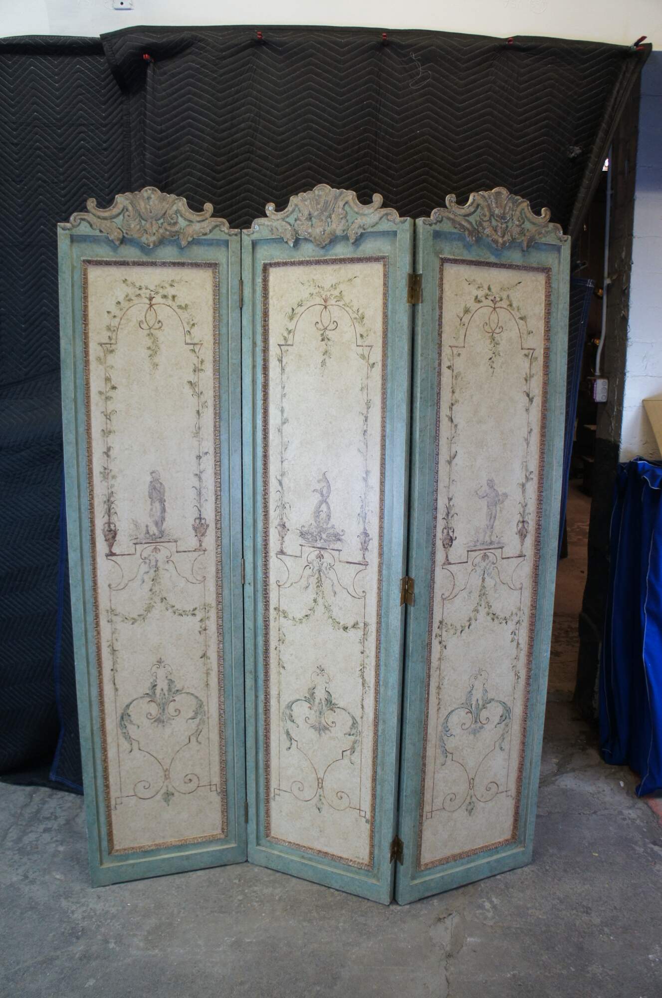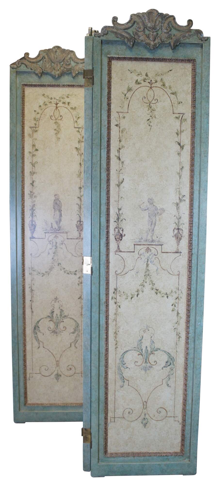 Vintage French Neoclassical three panel folding screen or room divider featuring a painted design of figures surrounded by foliate, trophy urns / vases and ribbons.