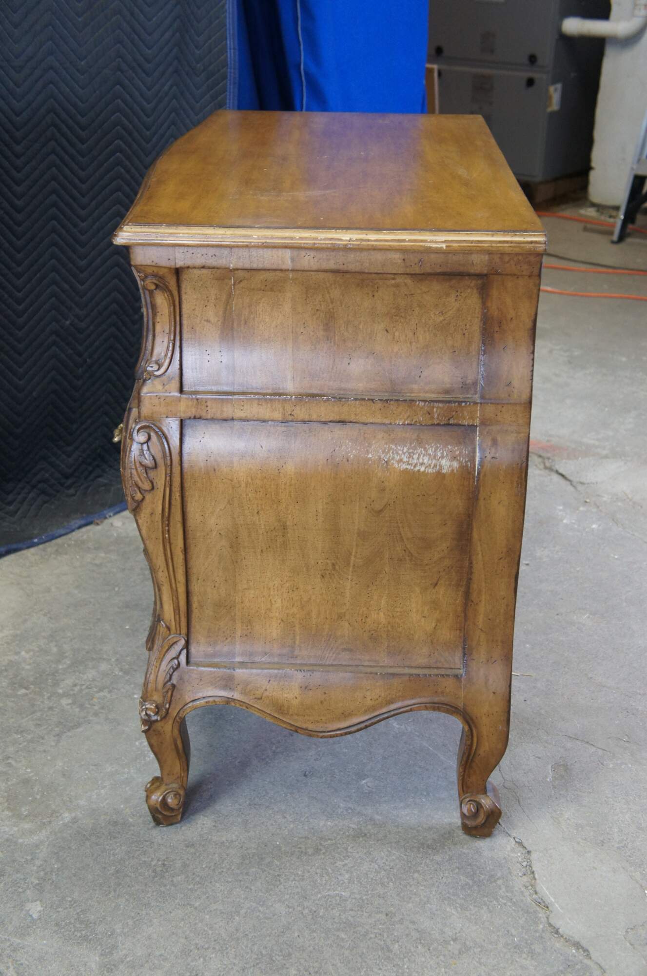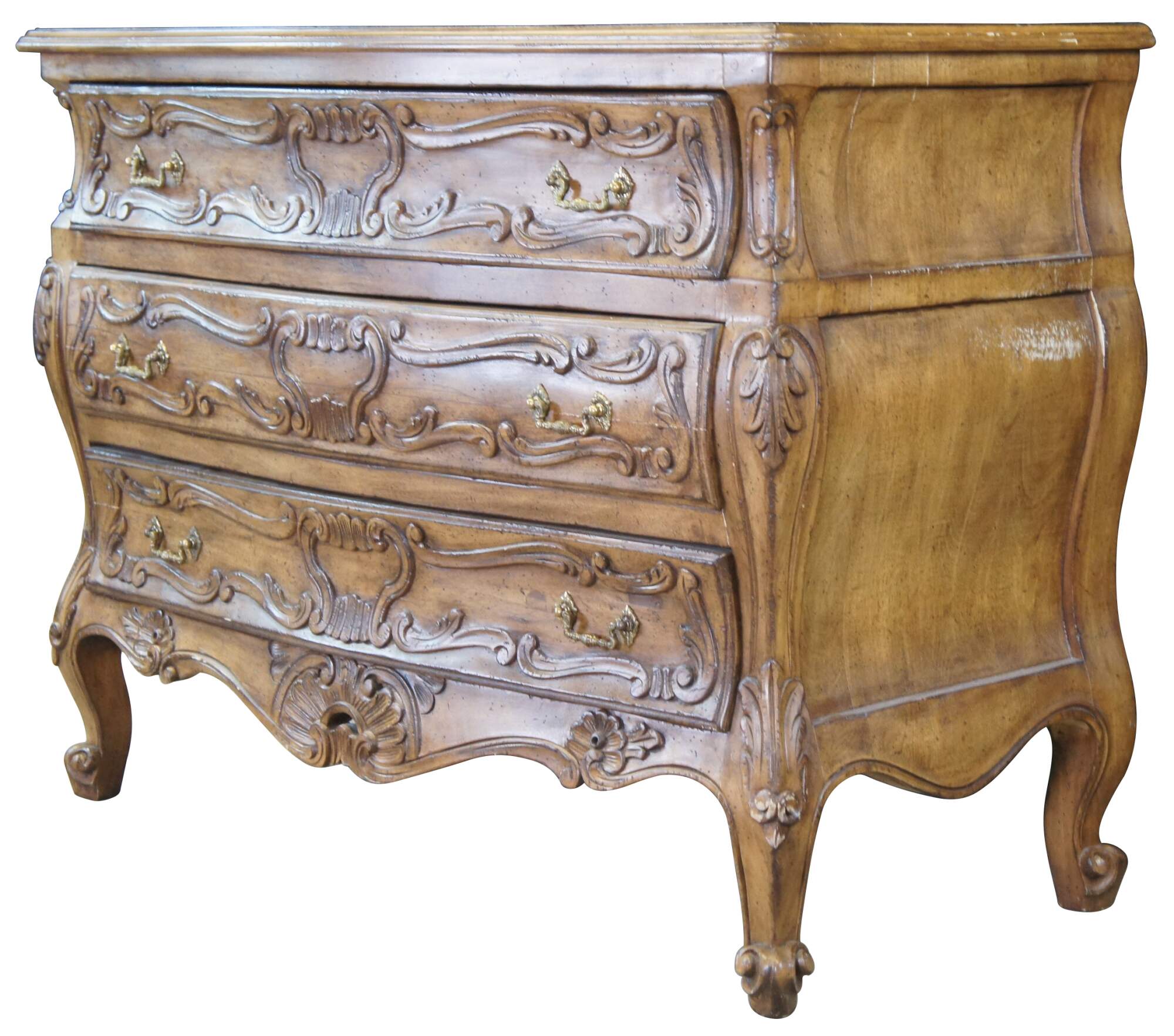 Vintage Italian Lewis Mittman chest of drawers or bombe style dresser. Made of walnut featuring rectangular serpentine form with carved Provincial / Louis XV styling. Made in Italy.