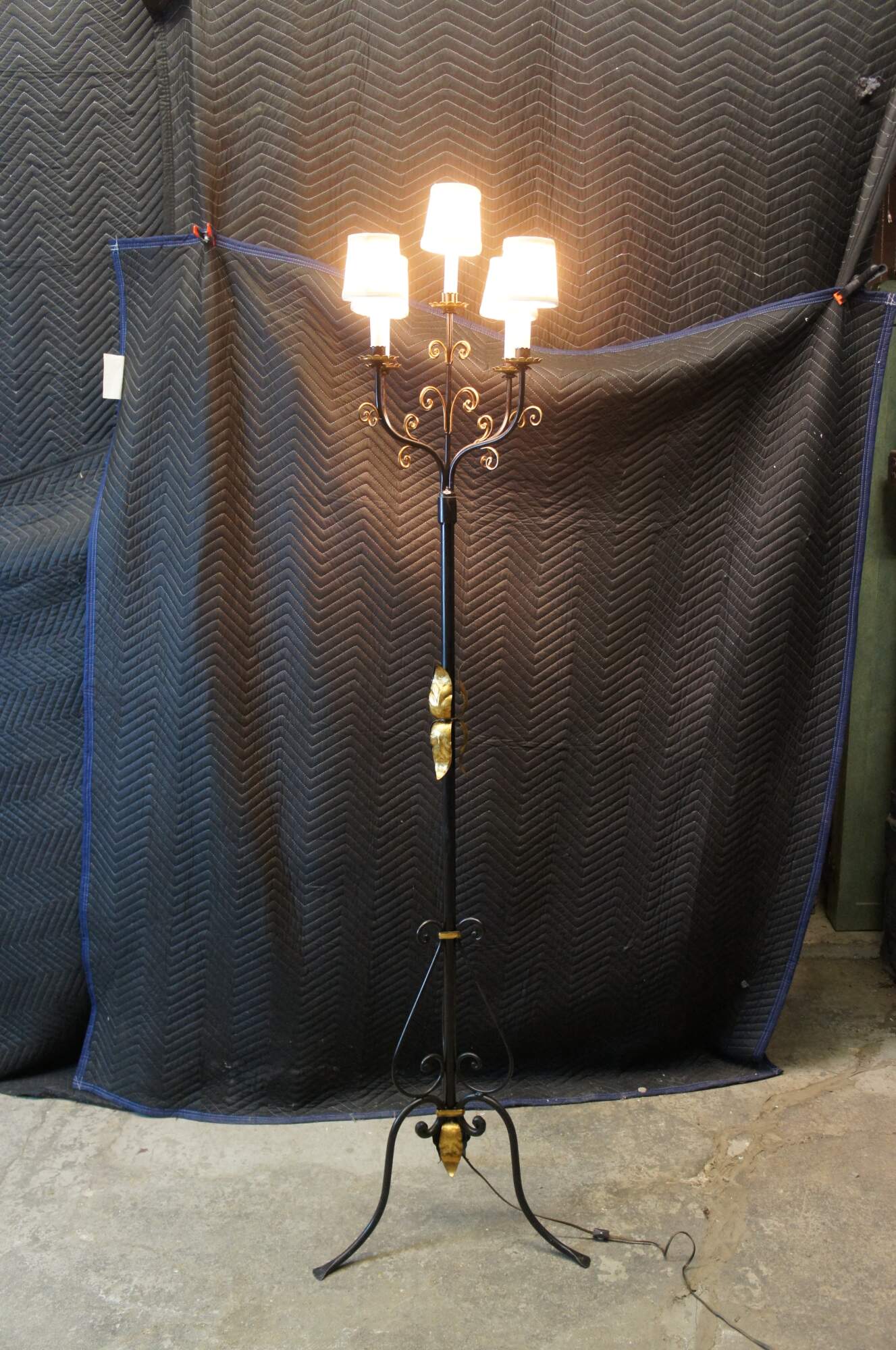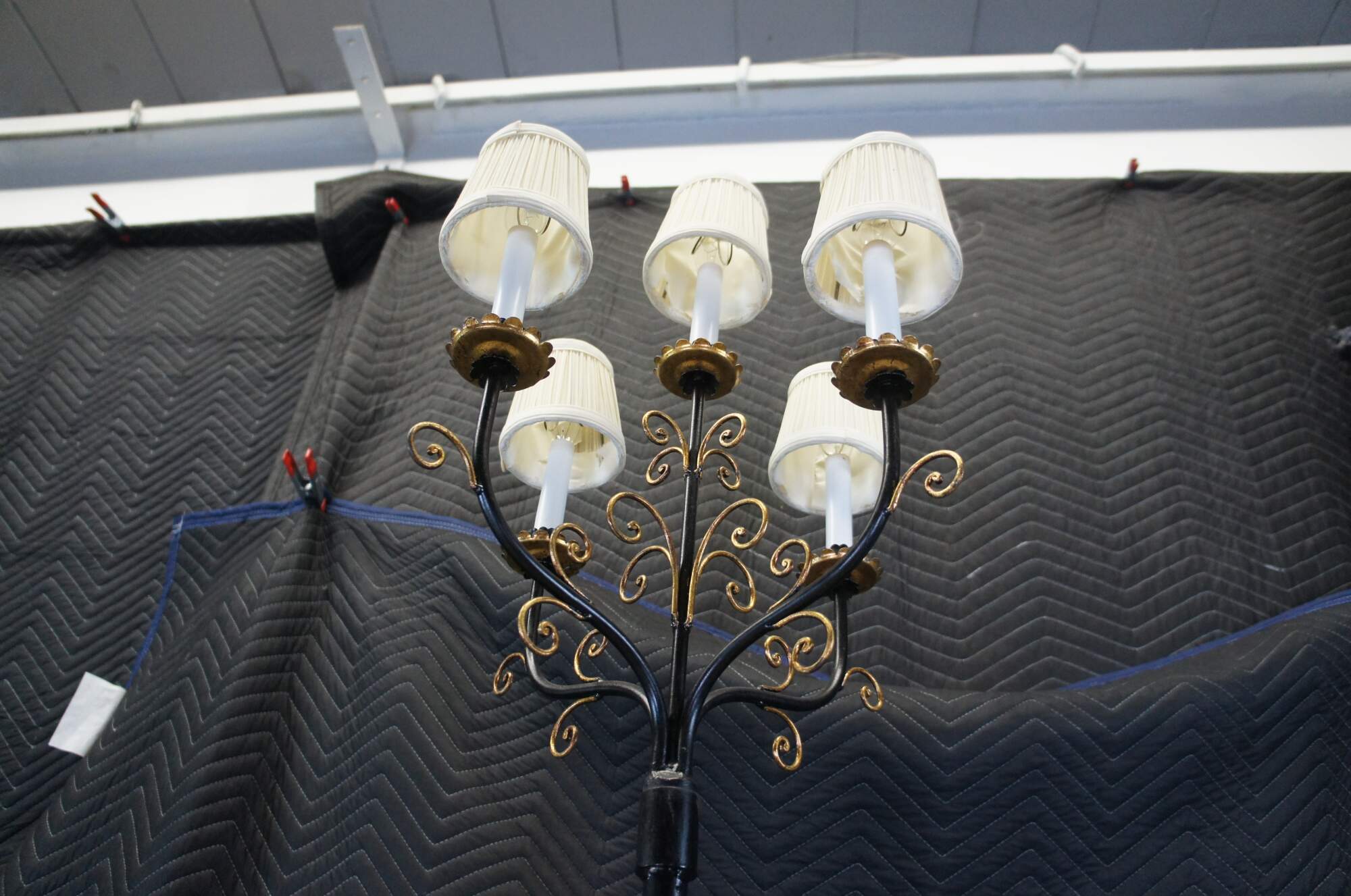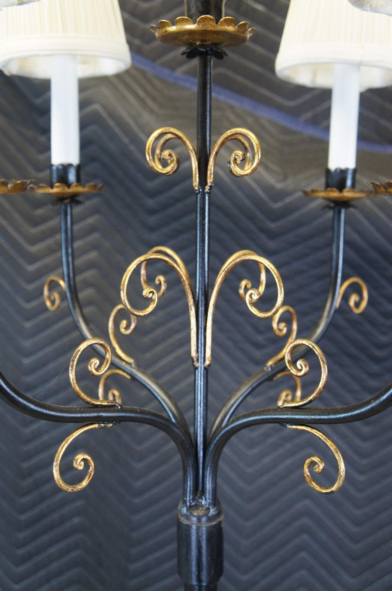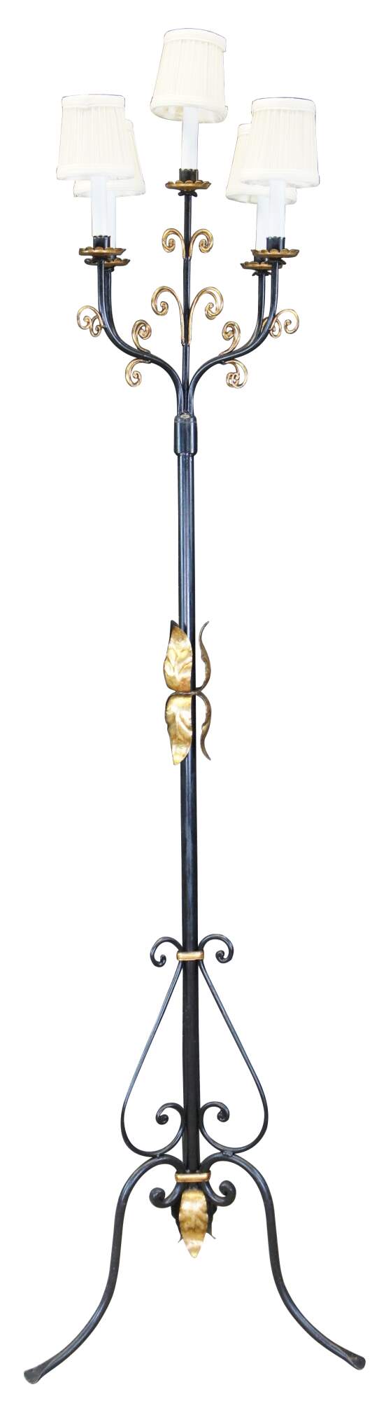 Tall vintage French Gothic Revival five light floor lamp featuring scrolled black iron with gold acanthus accents and a five arm candlestick candelabra.