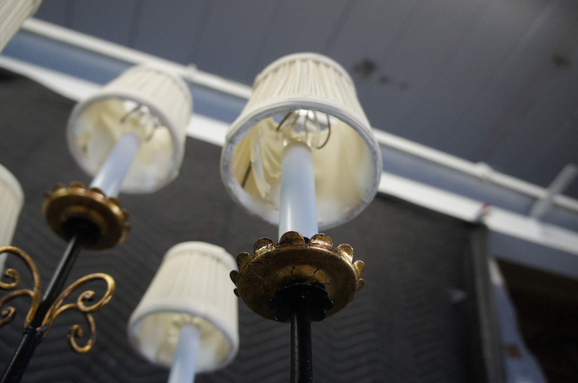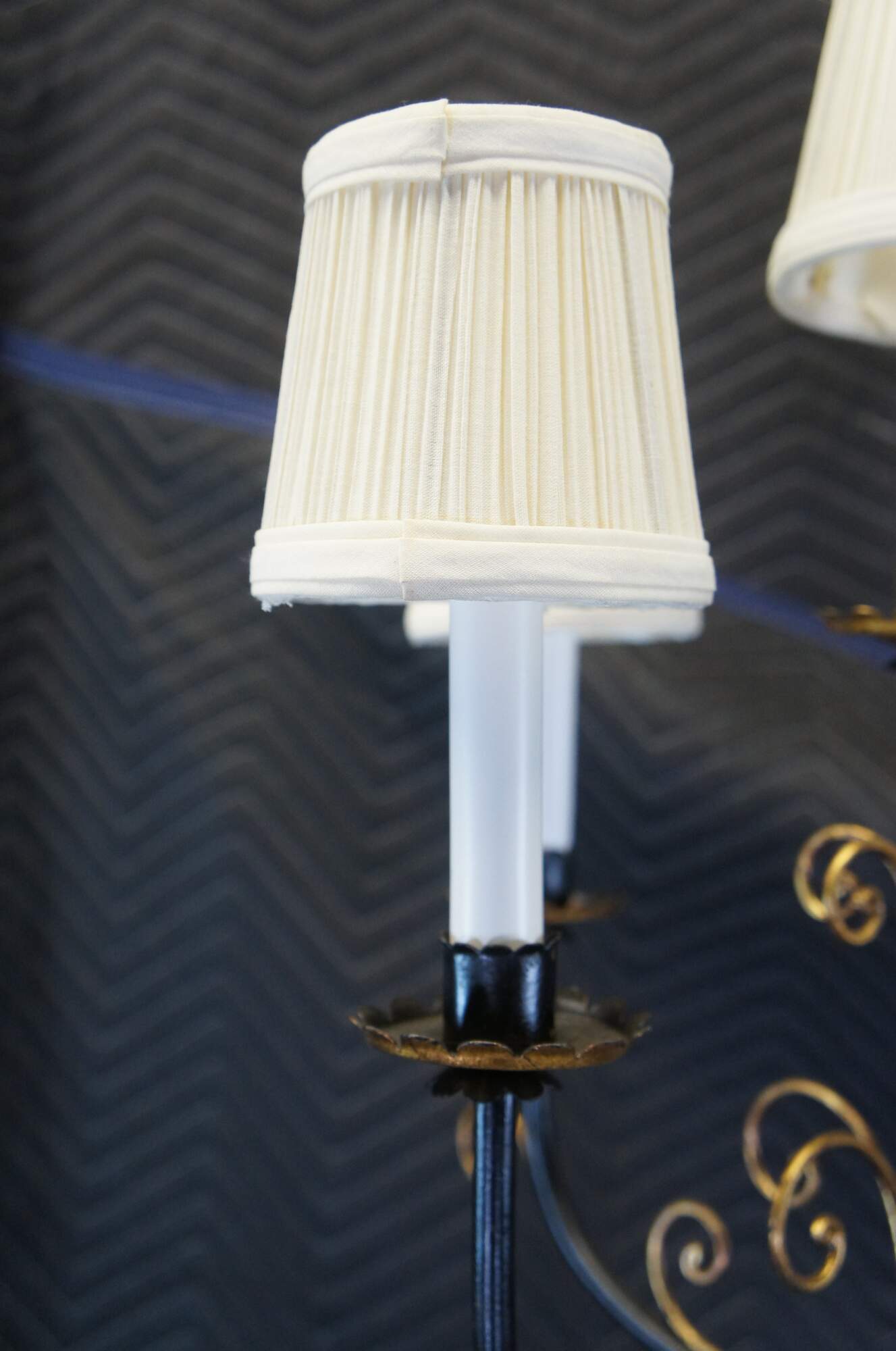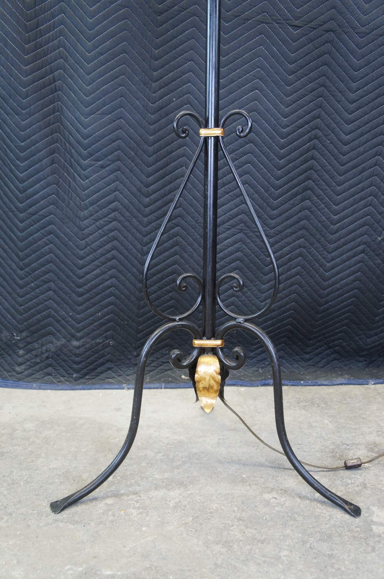 Tall vintage French Gothic Revival five light floor lamp featuring scrolled black iron with gold acanthus accents and a five arm candlestick candelabra.