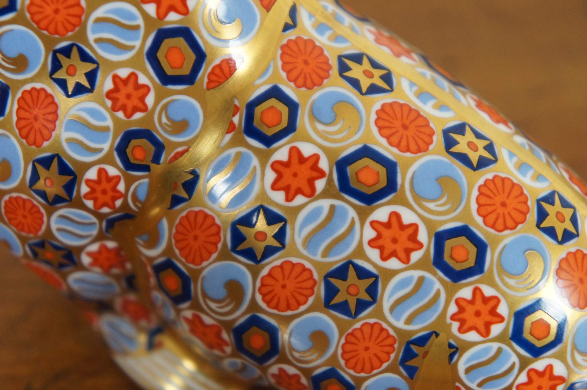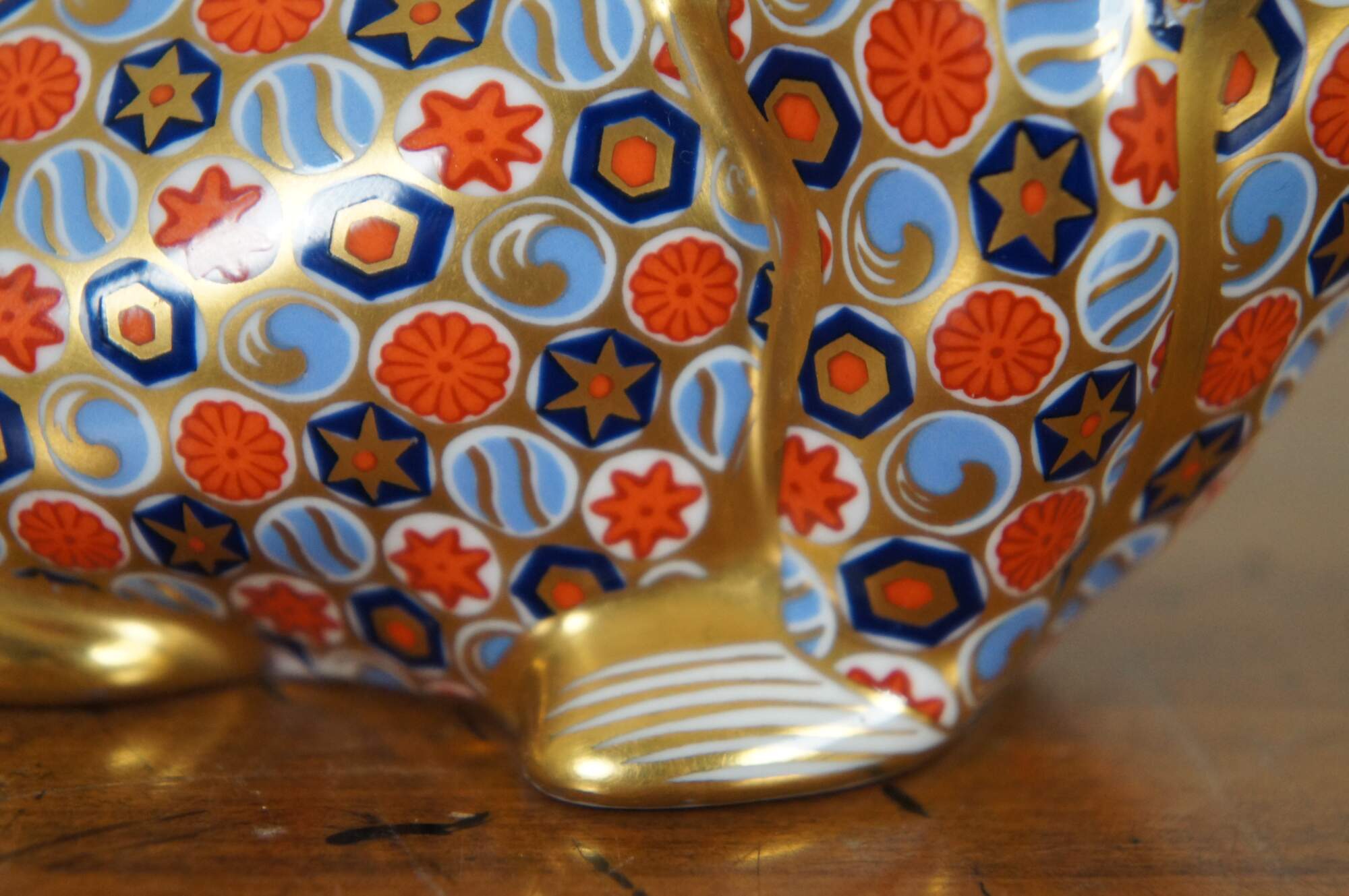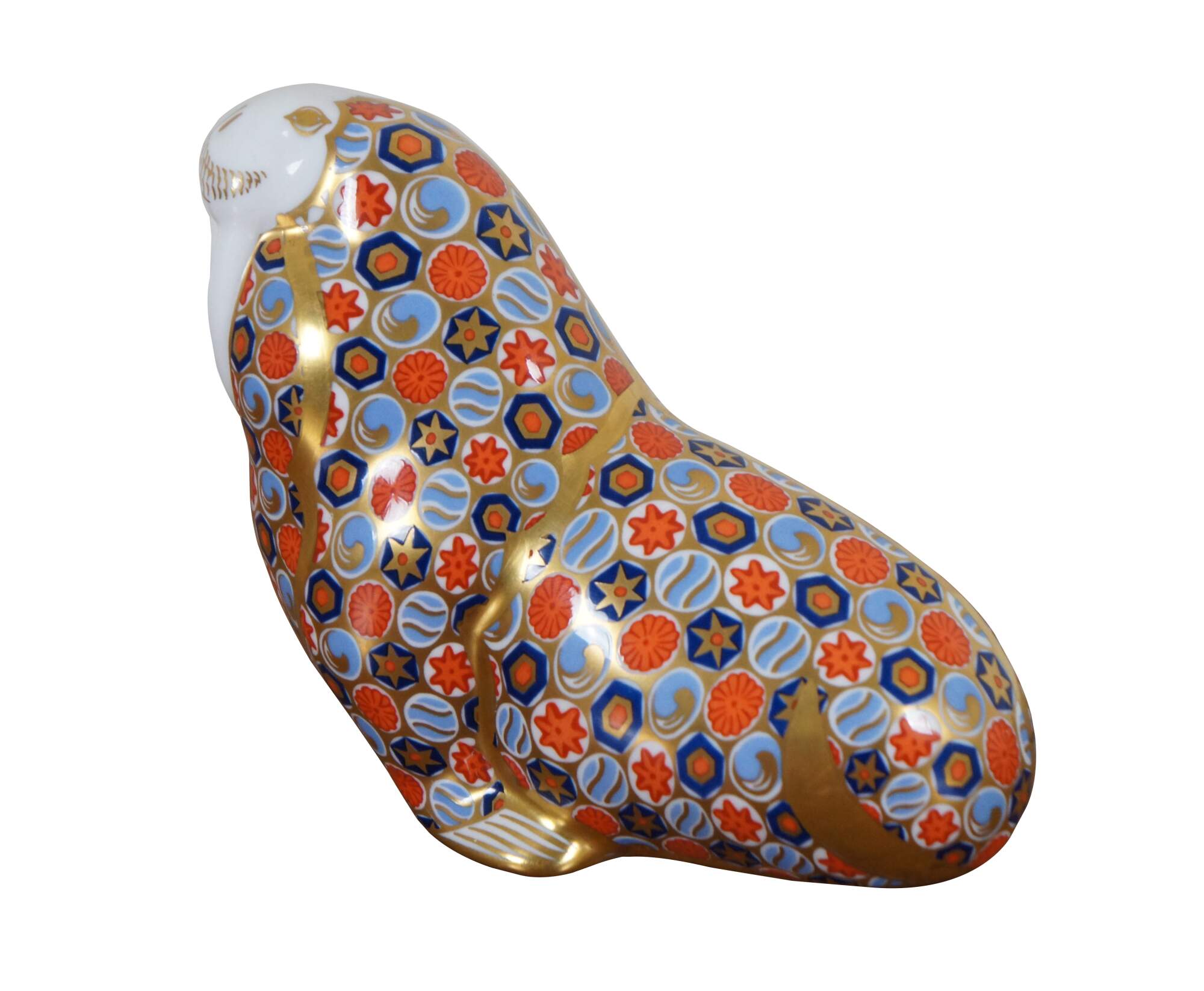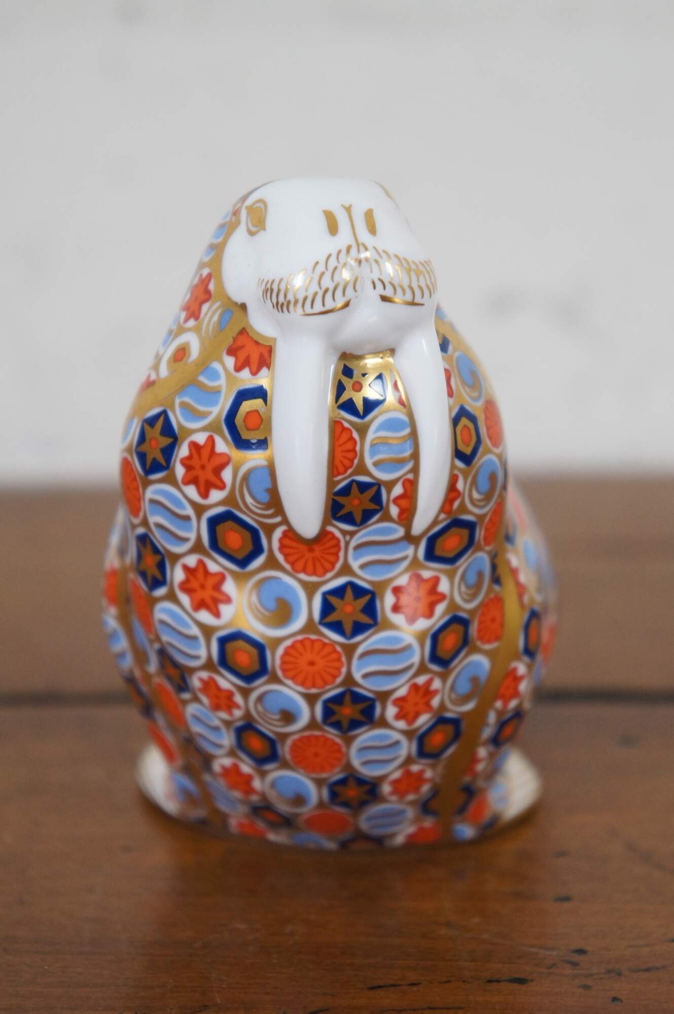 Vintage 1st edition Royal Crown Derby Engliah Bone China porcelain walrus figurine / paperweight, painted with rust, cobalt and gold imari inspired designs, marked with gold stopper.