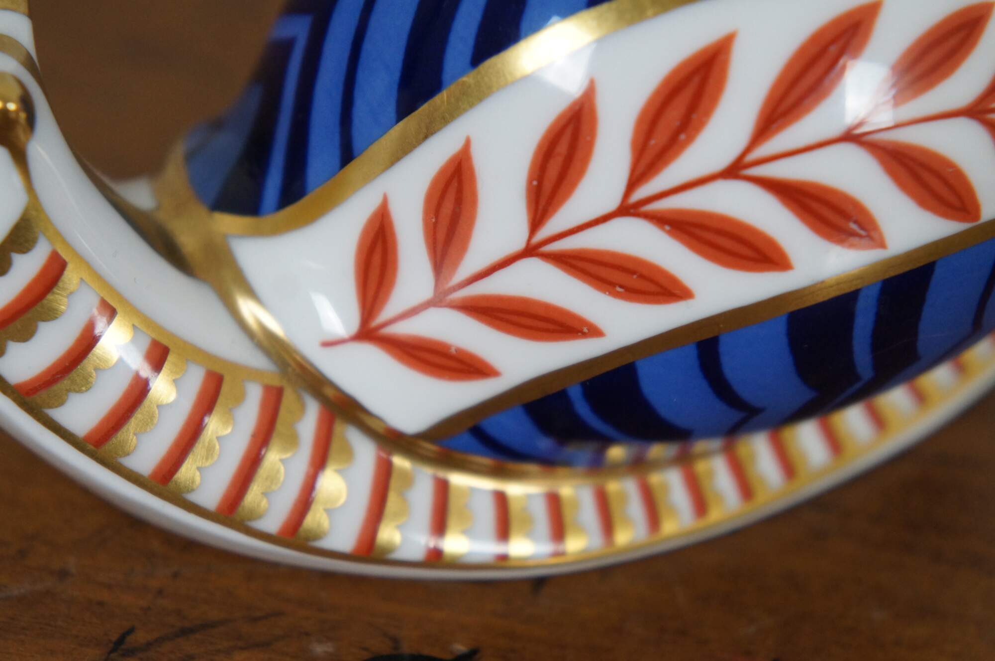 Vintage 1st edition Royal Crown Derby English Bone China porcelain snail figurine / paperweight, painted in rust, cobalt, and gold with imari inspired designs, marked with ceramic stopper.