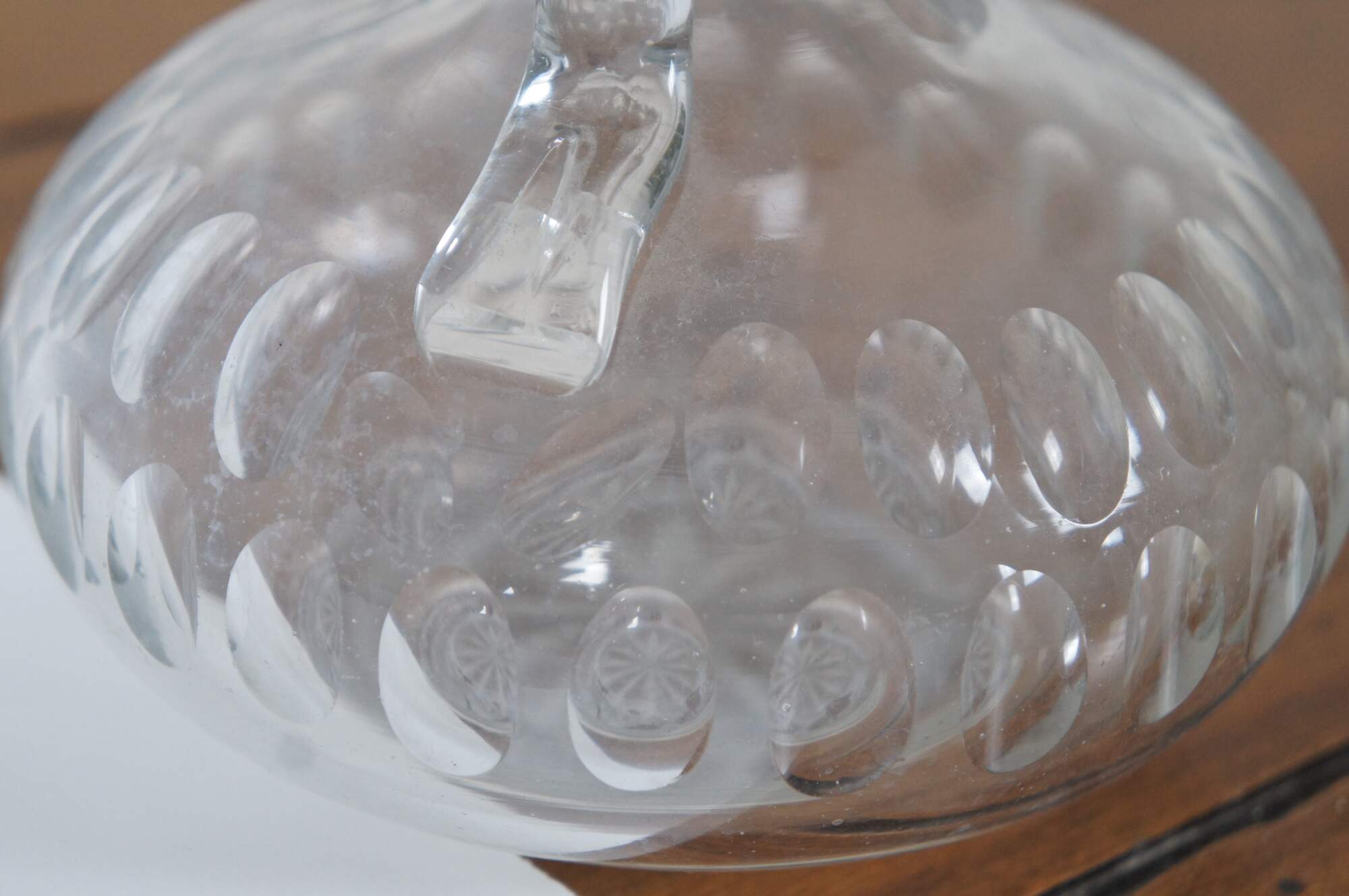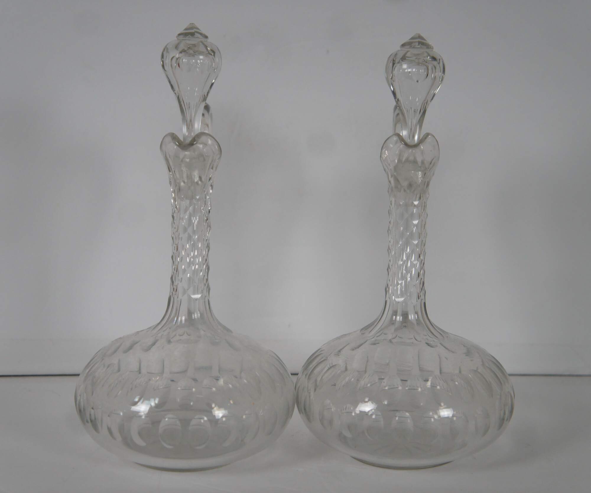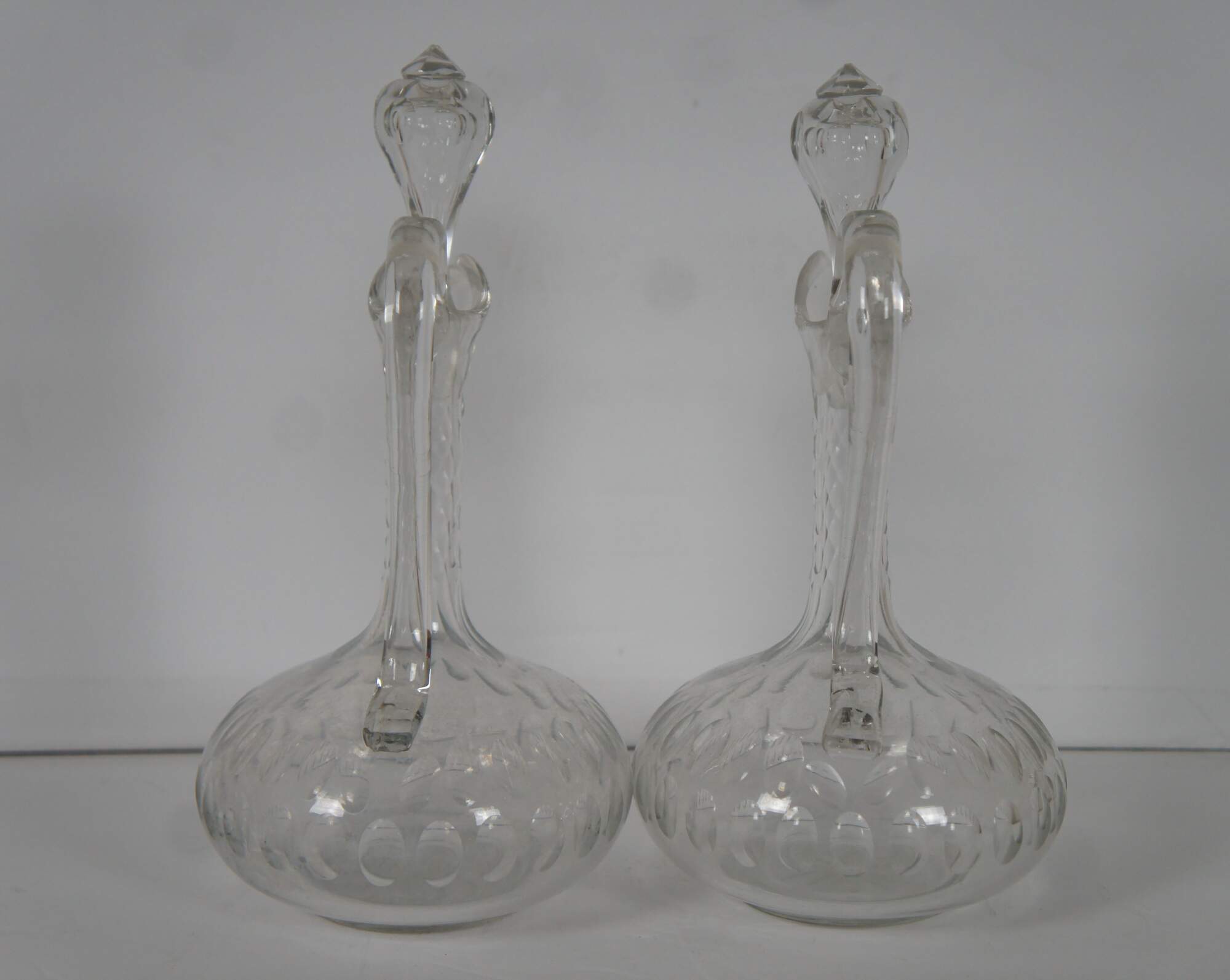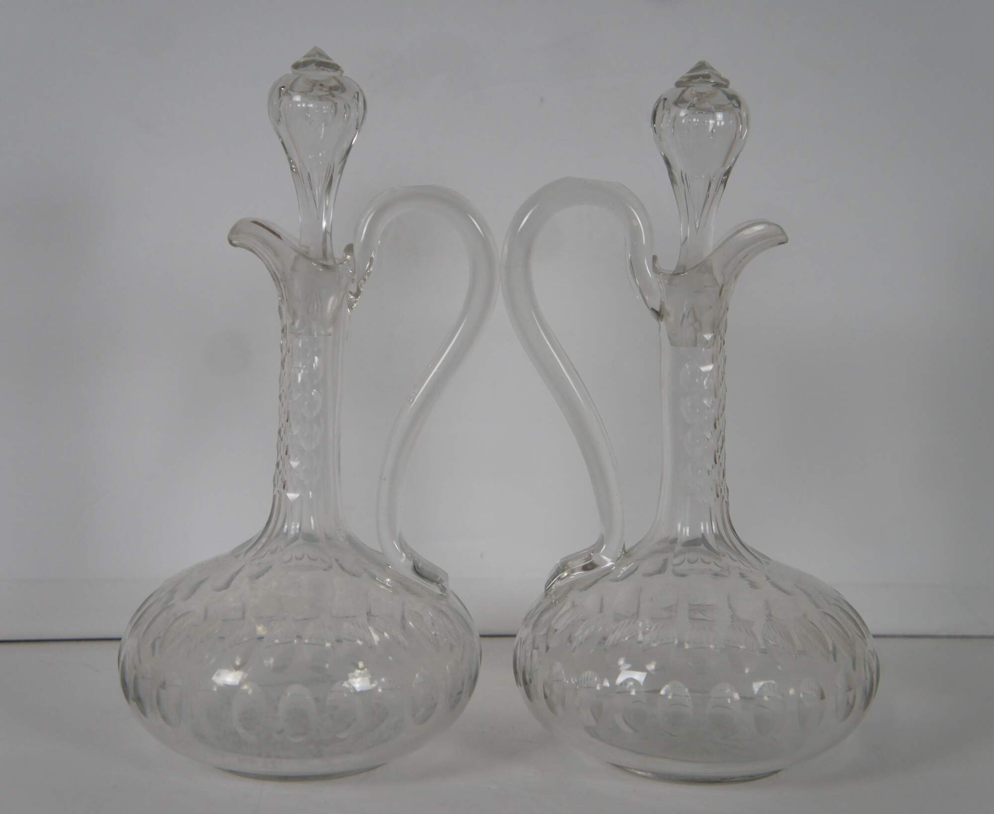 A pair of 20th century glass decanters or ewers. Features a bulbous bottom with cut glass orbs, a wing shaped handle and long neck leading to spout with handle.