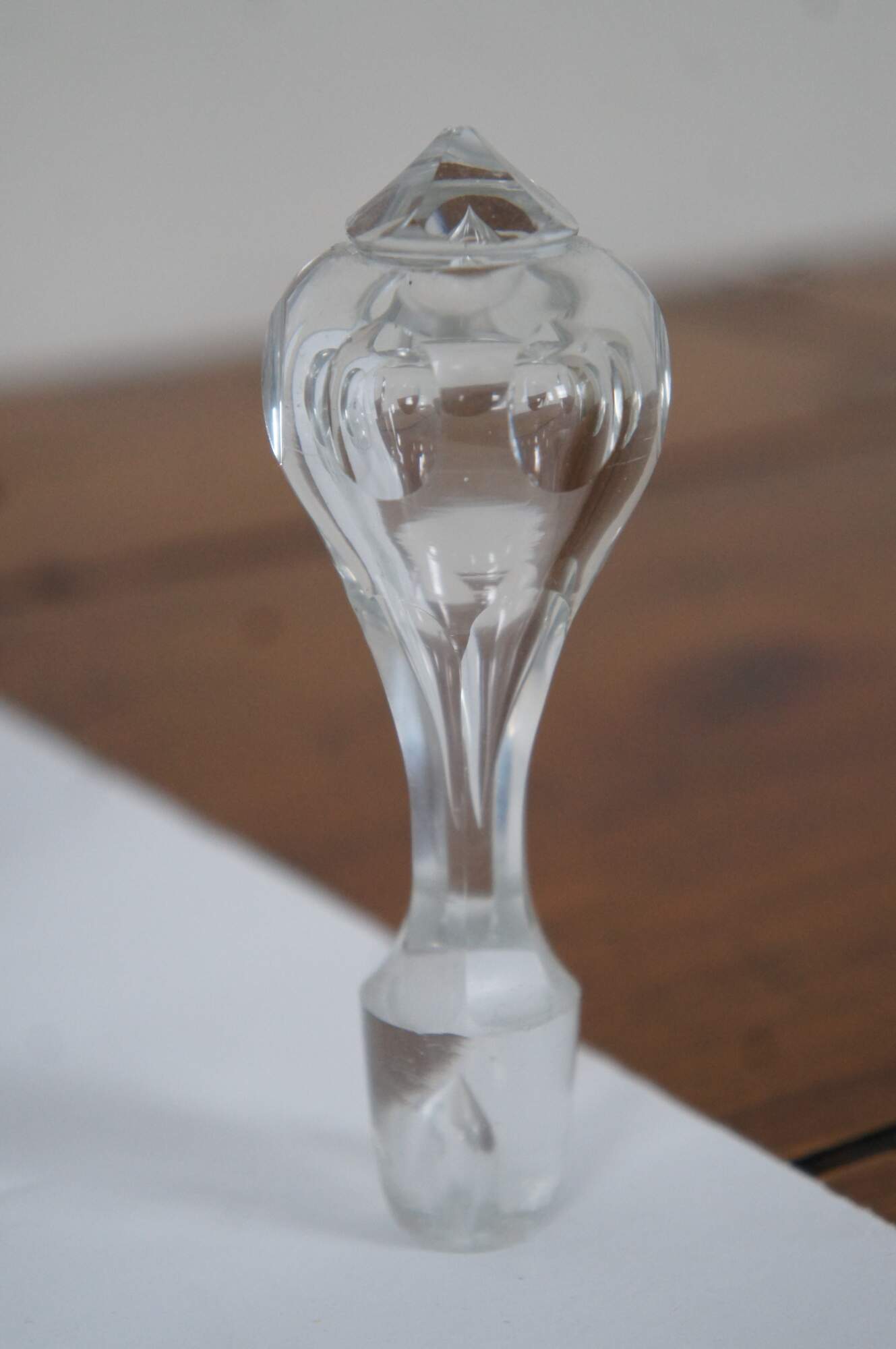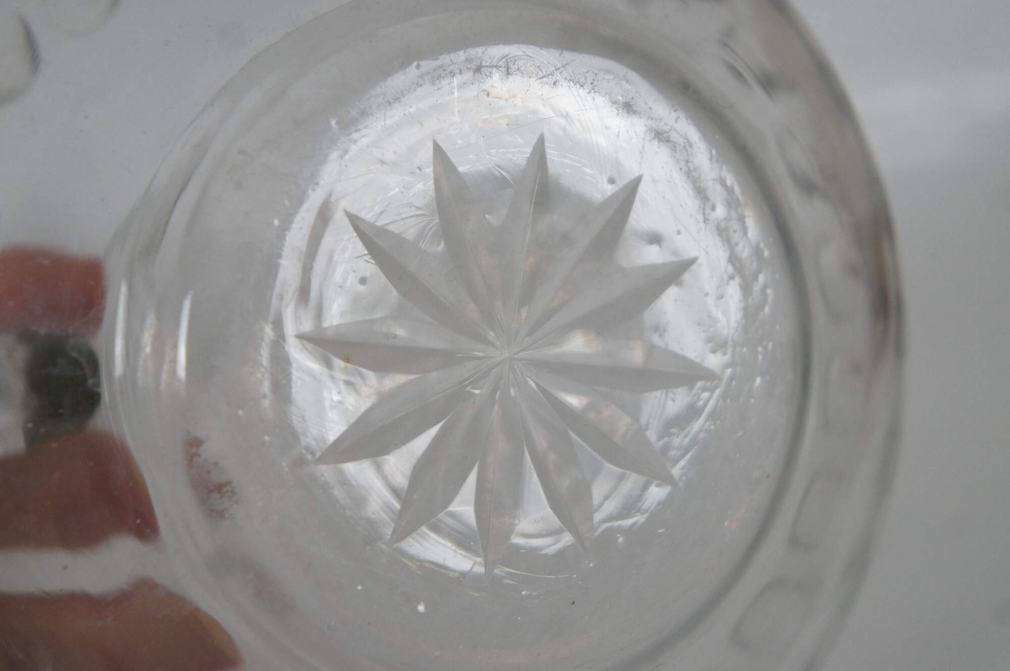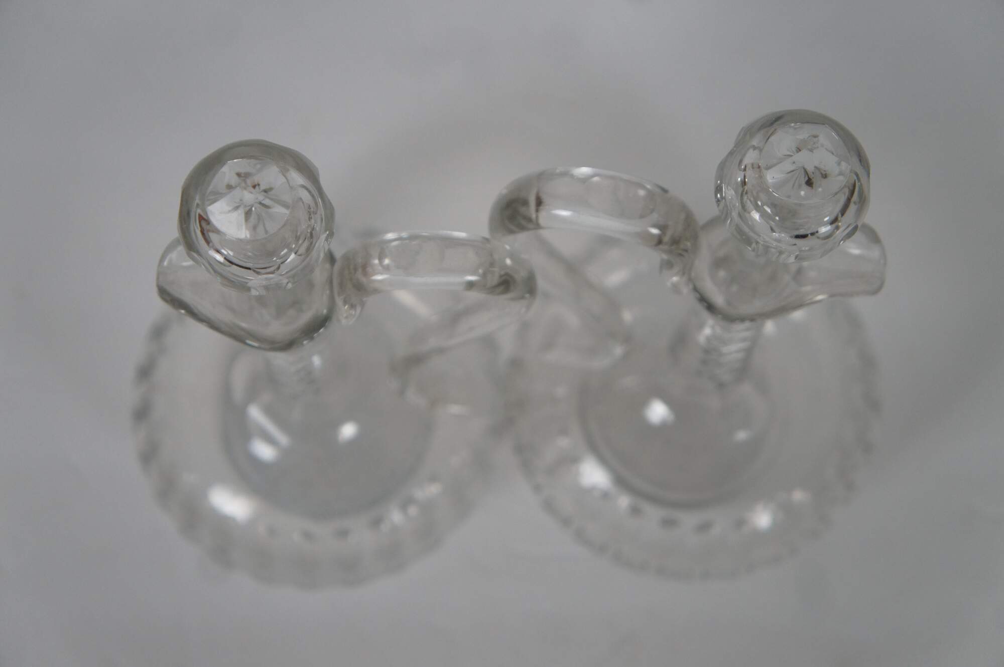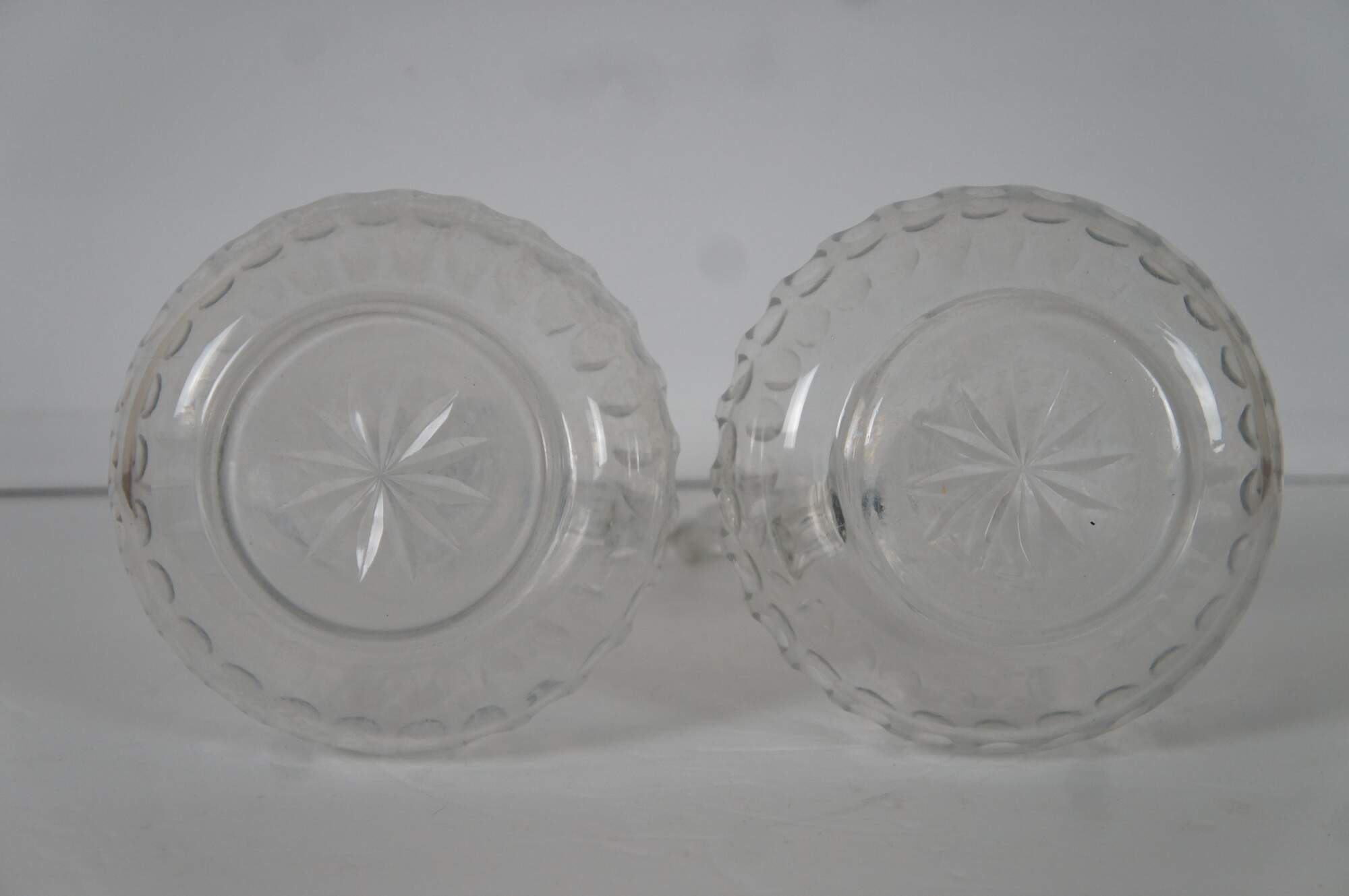 A pair of 20th century glass decanters or ewers. Features a bulbous bottom with cut glass orbs, a wing shaped handle and long neck leading to spout with handle.