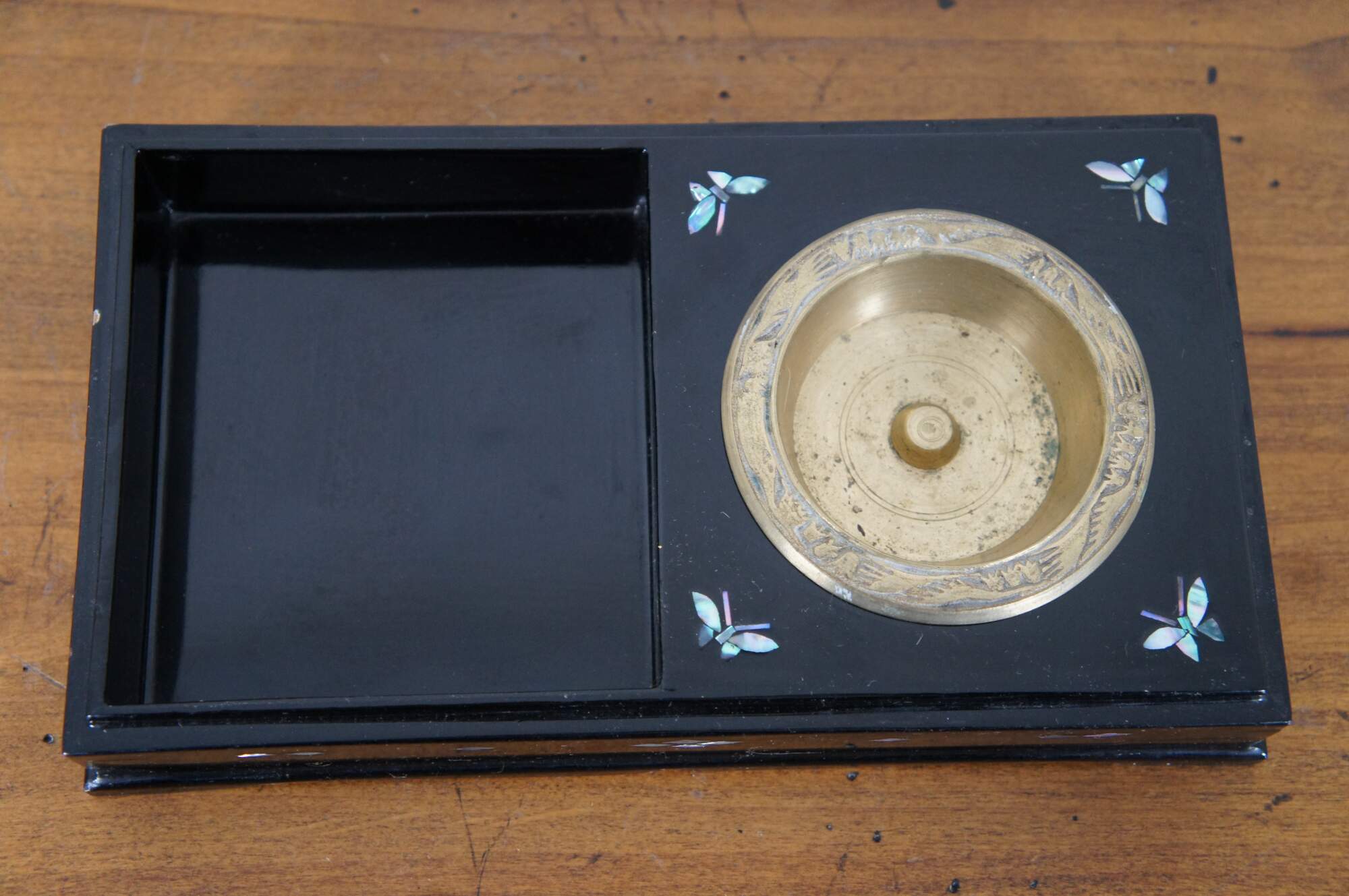 Mid century Japanese Chinoiserie black lacquered cigarette box decorated with mother of pearl flowers and butterflies, opening to reveal compartment for cigarettes / tobacco and a brass ashtray. Circa 1950s.
