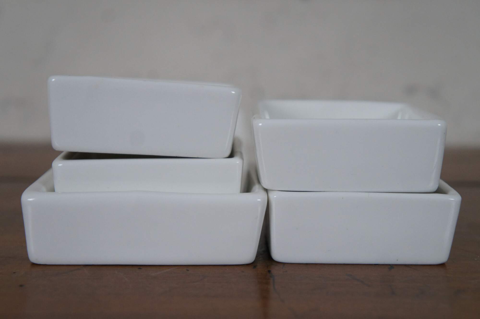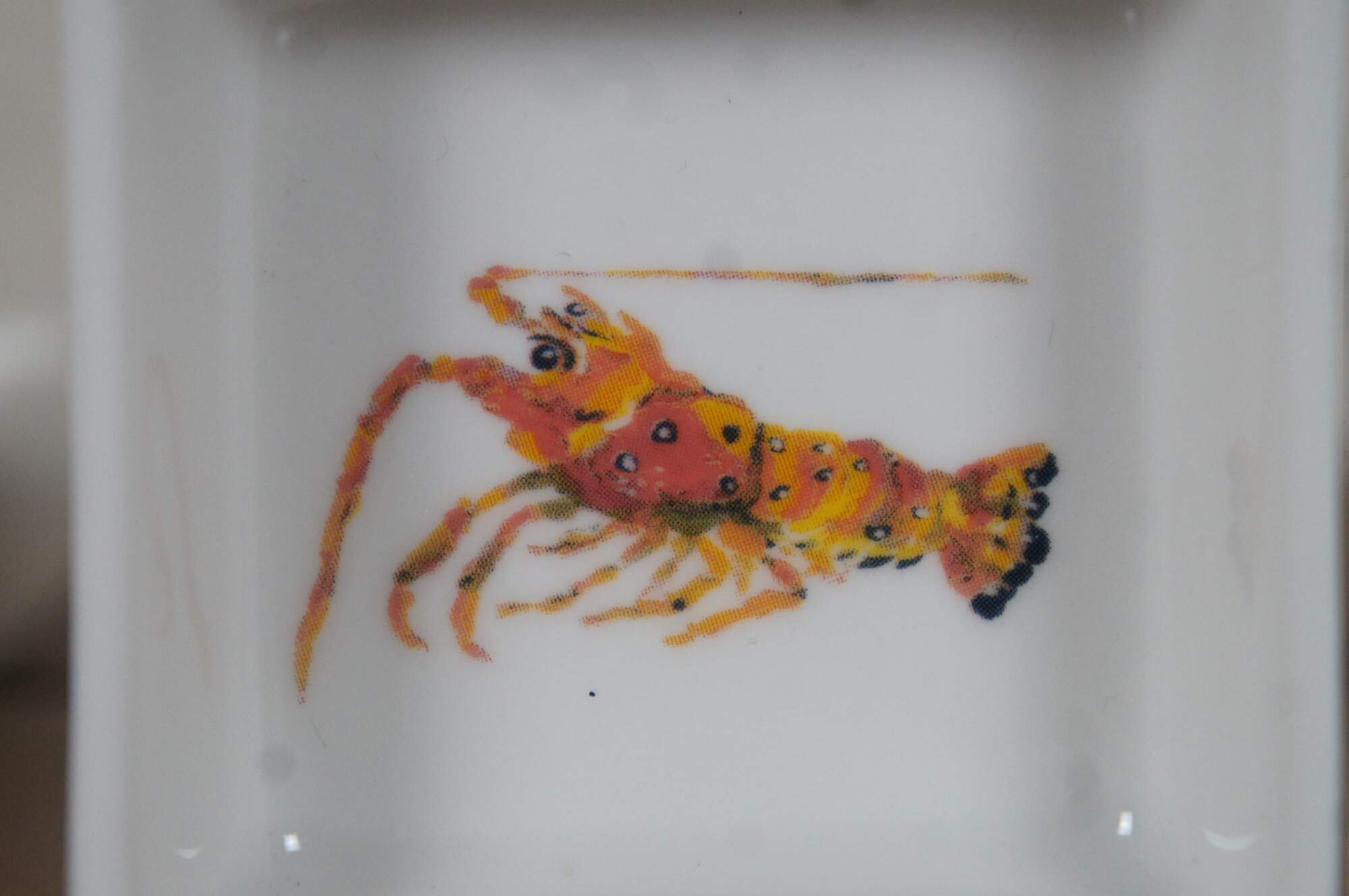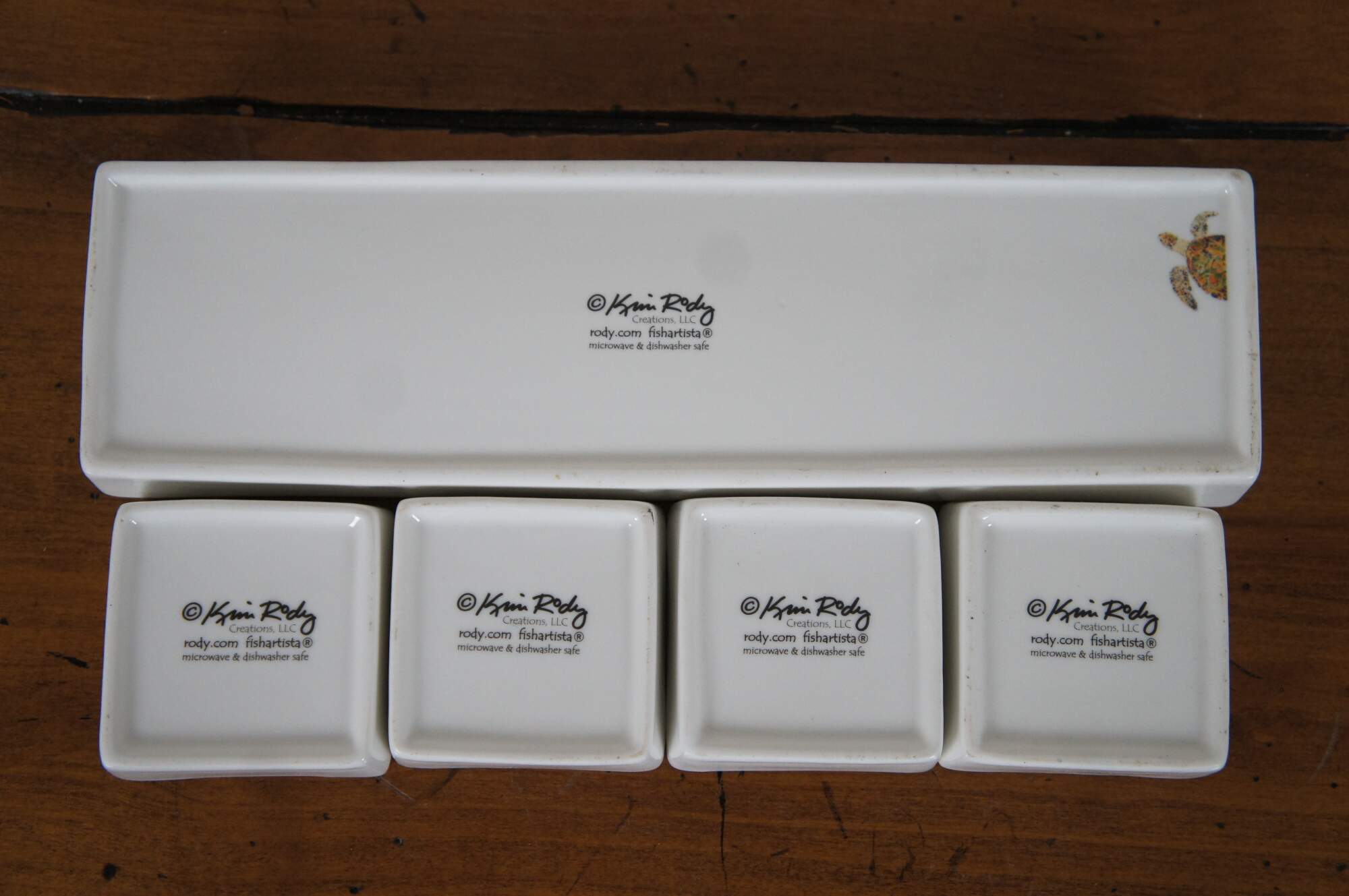 Kim Rody Creations Fisartista cracker and dip divided dish set including rectangular porcelain tray and four square mini bowls, each decorated with a different tropical sea creature / fish. Microwave and dishwasher safe.