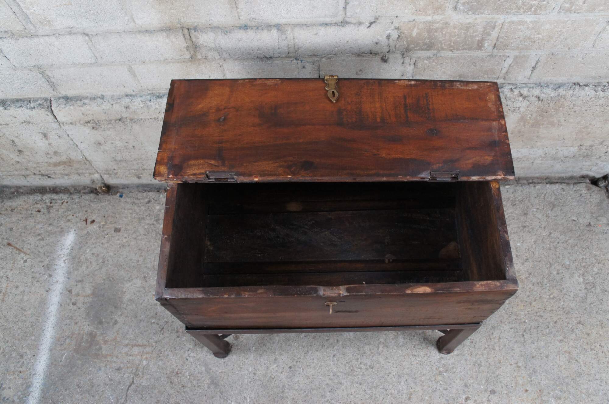 Two reclaimed mahogany British Colonial style trunk tables featuring metal bases with upper dovetailed frame. One features compartments for sewing or writing slope supplies, the other features a split top with open storage area. Marked "Made in India" along base.