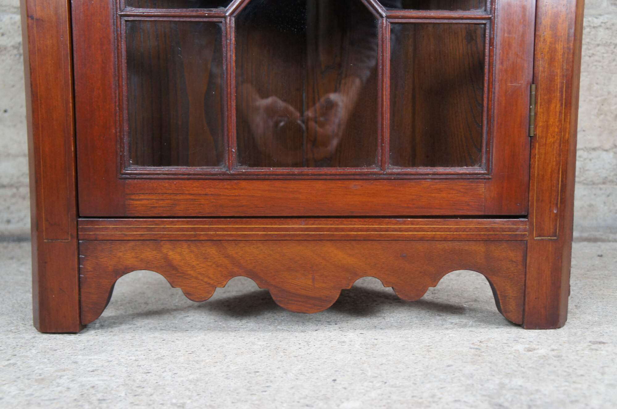 Antique 19th Century George III hanging corner cupboard. Made from mahogany with an inlaid crown and stiles. Features an open pediment, three spire shaped finials, a fretwork covered door and lower serpentine apron. The cabinet has an oak backing with three shelves. Includes key.