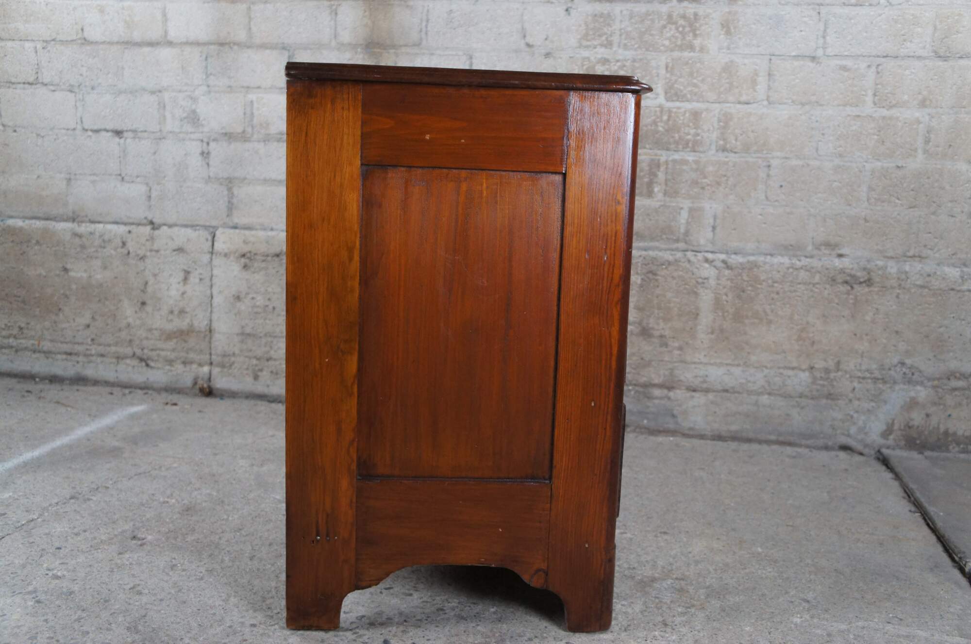 Antique Early American style chest of drawers or dresser, circa 1900s. Made of pine featuring three drawers with colonial brass bat wing hardware and serpentine apron.