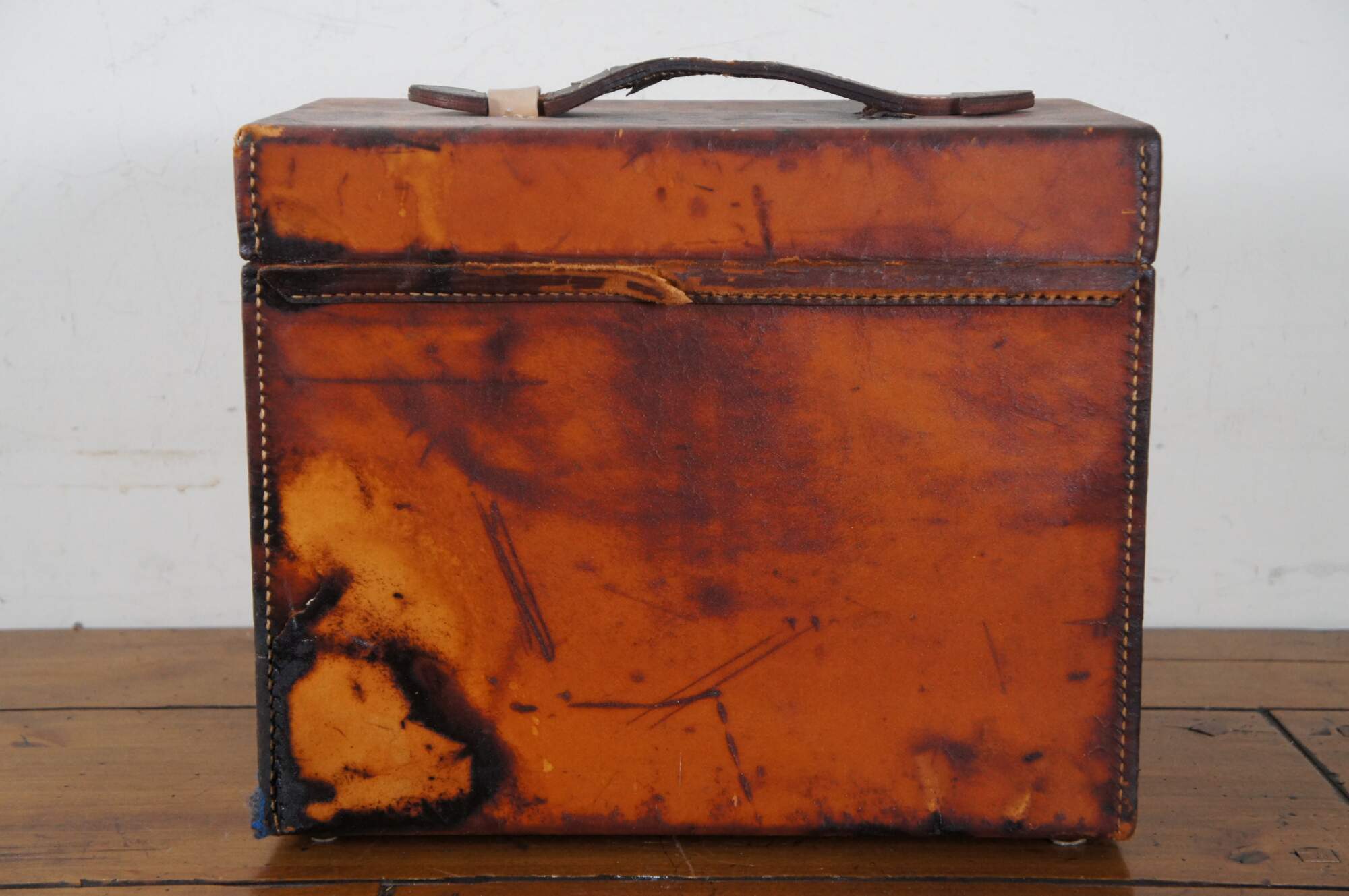 Fair Condition - Lid split from base; stains/bleaching/discoloration/dings/scuffs/peeling to leather; interior pretty good - a couple stains