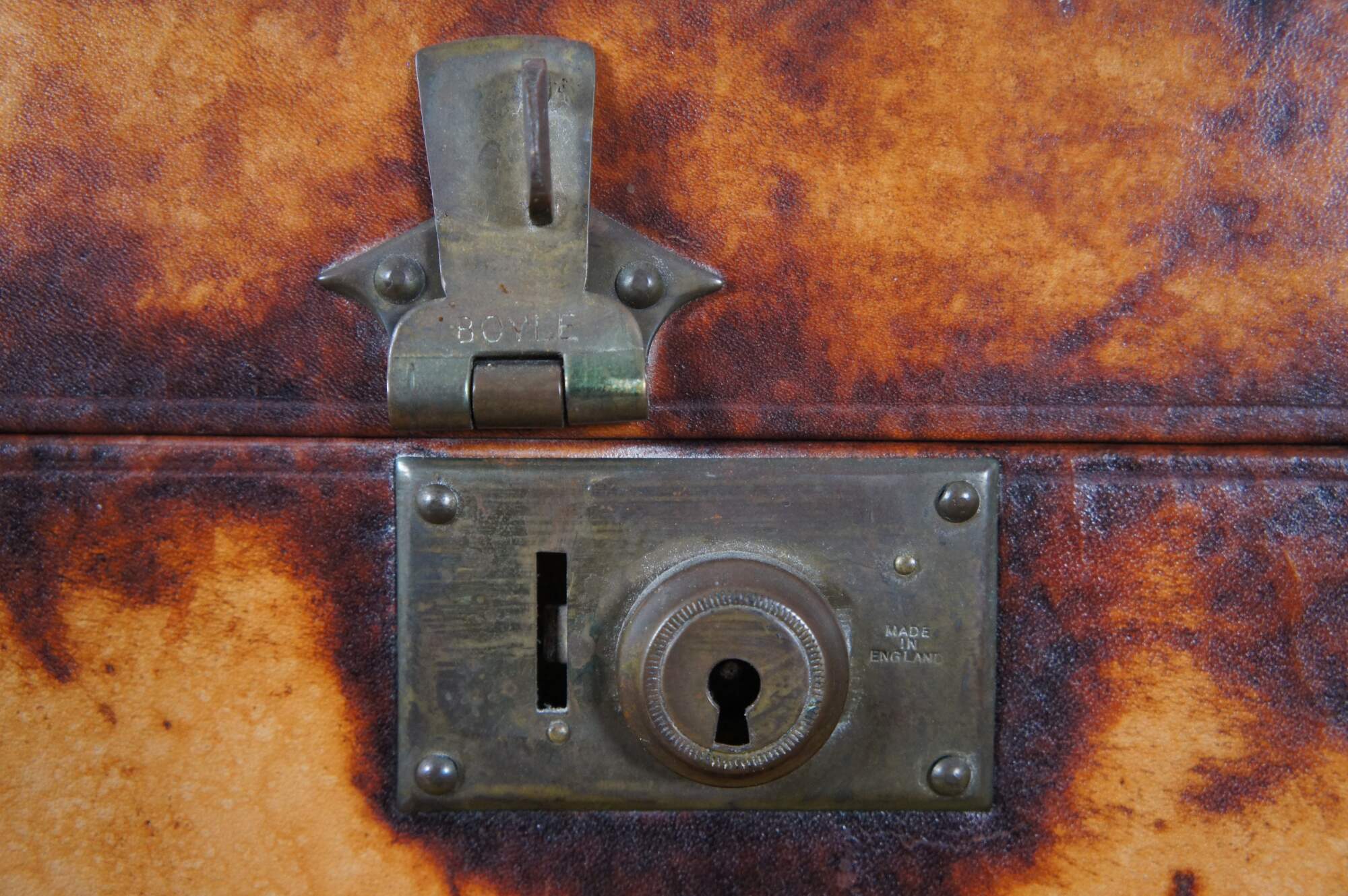 Antique Boyle Bench Made Luggage brown leather make up / train / travel case with rectangular form, top handle, locking latch and key and round brass feet. Interior features an open compartment flanked by two small section off space at the narrow sides and buckle straps along the long sides. Made in England.