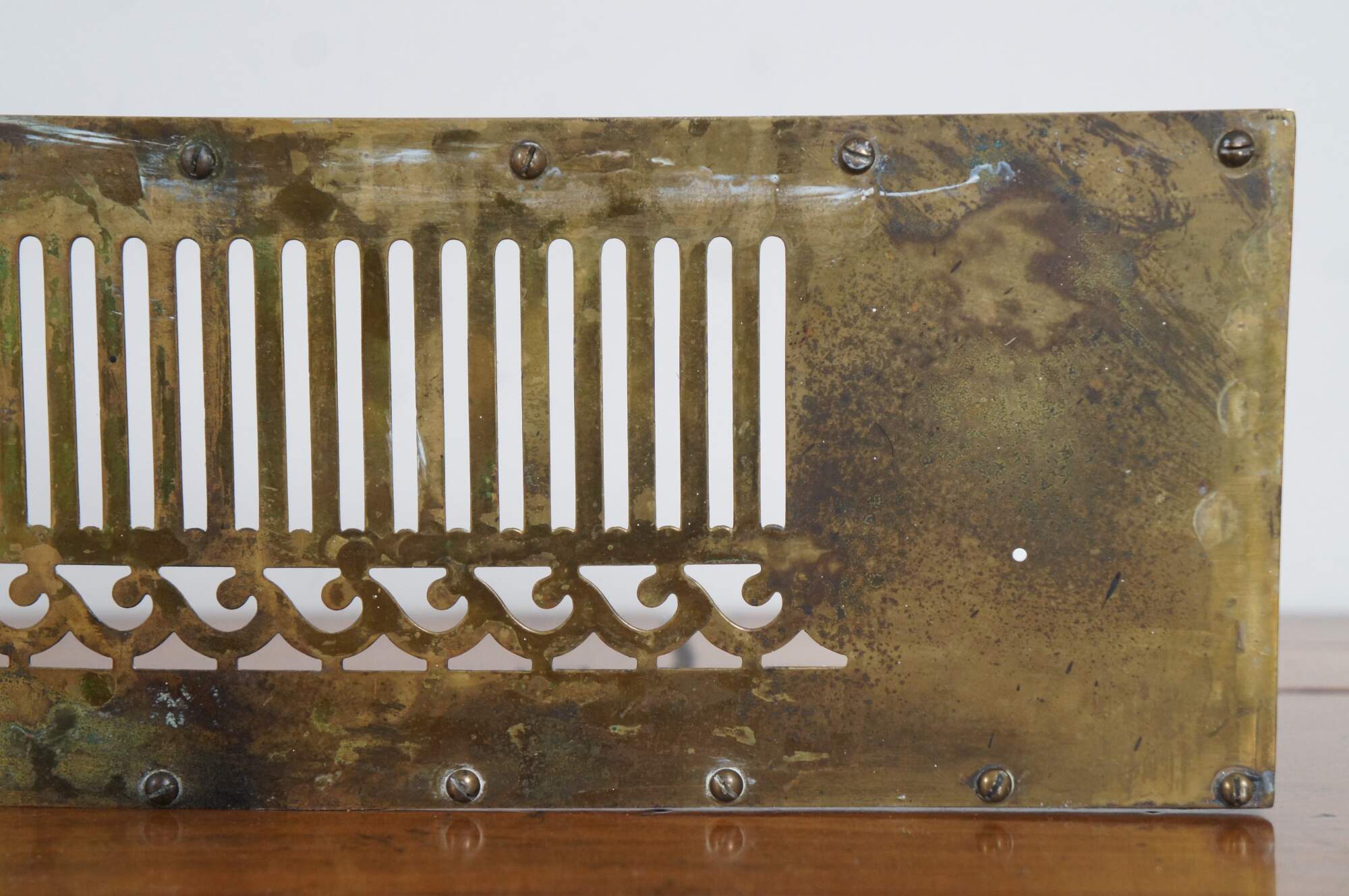 Antique Victorian serpentine brass fireplace fender featuring a pierced wave and fluted Colonial design topped with a beaded edge.