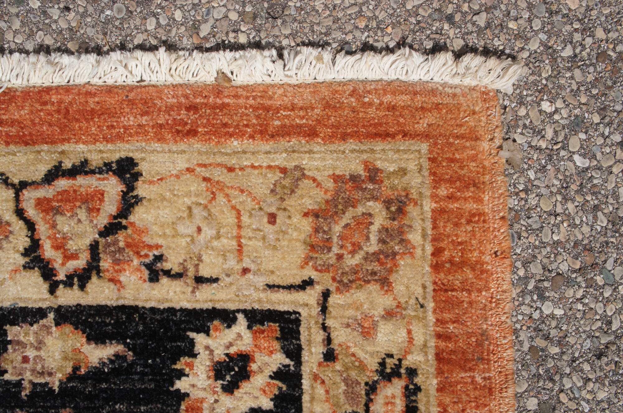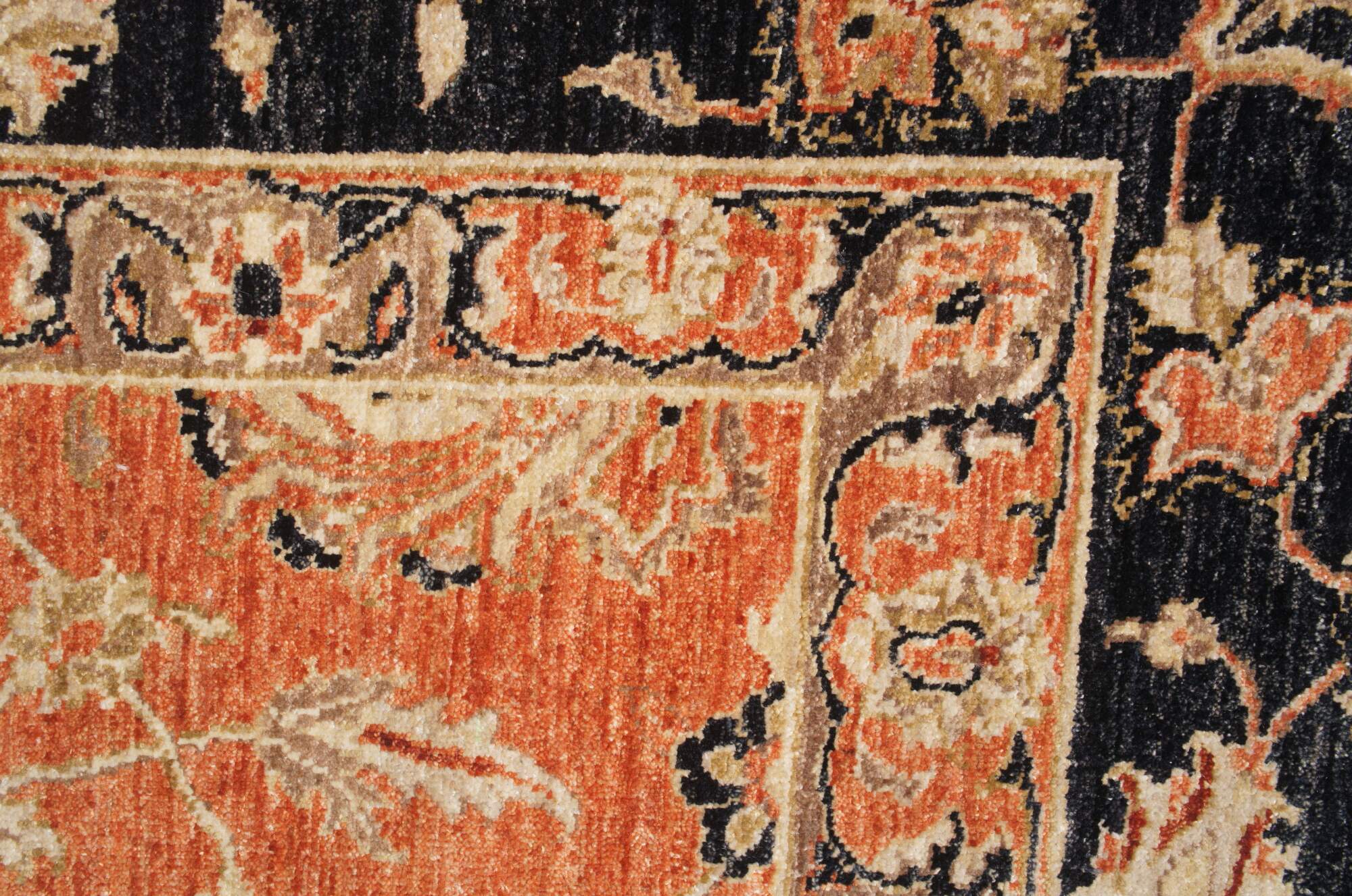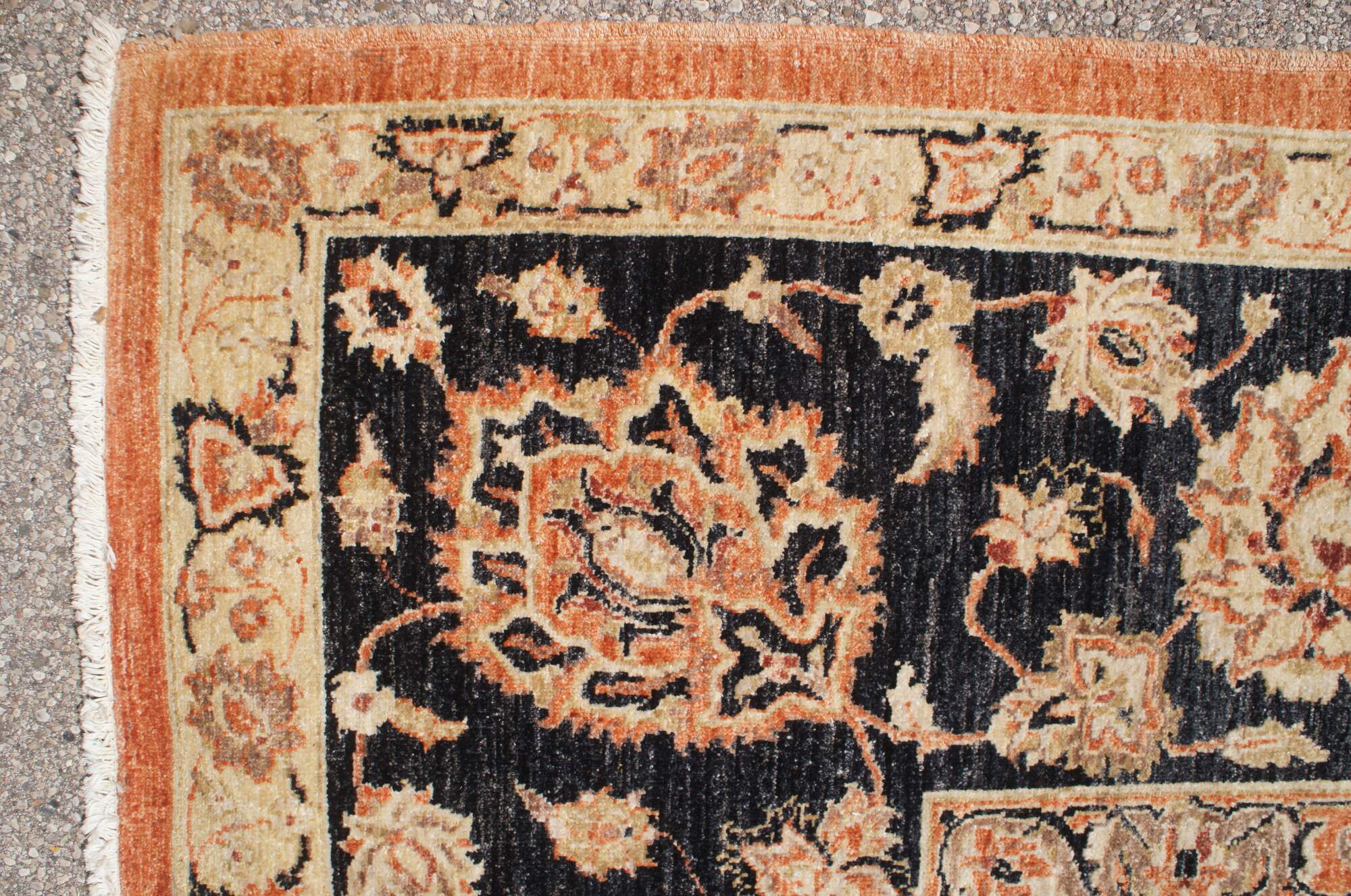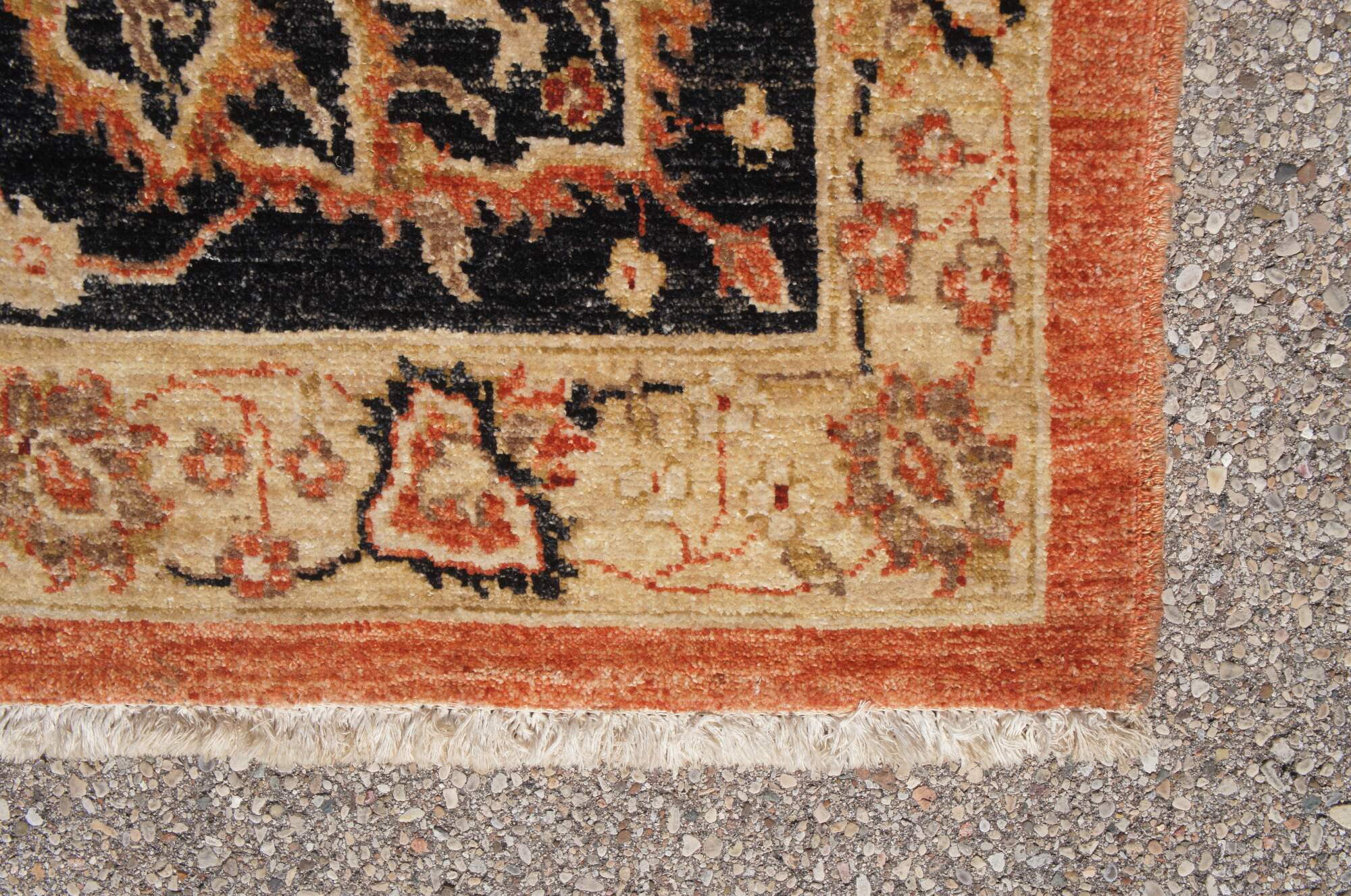 Exceptional hand knotted oriental area rug. Features a floral pattern with large sprays in orange, beige and very dark blue/ black