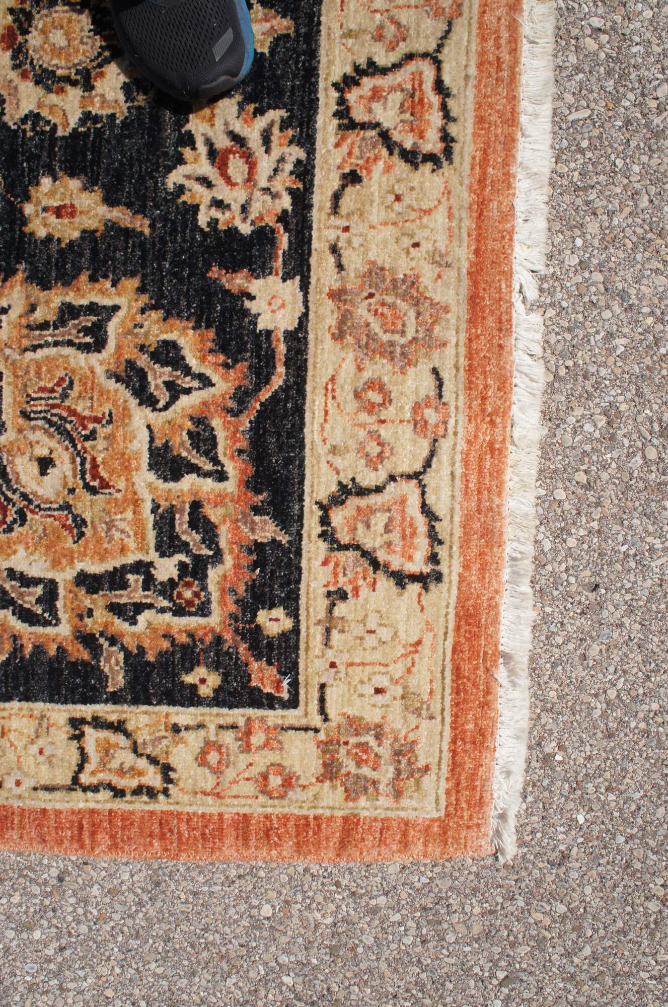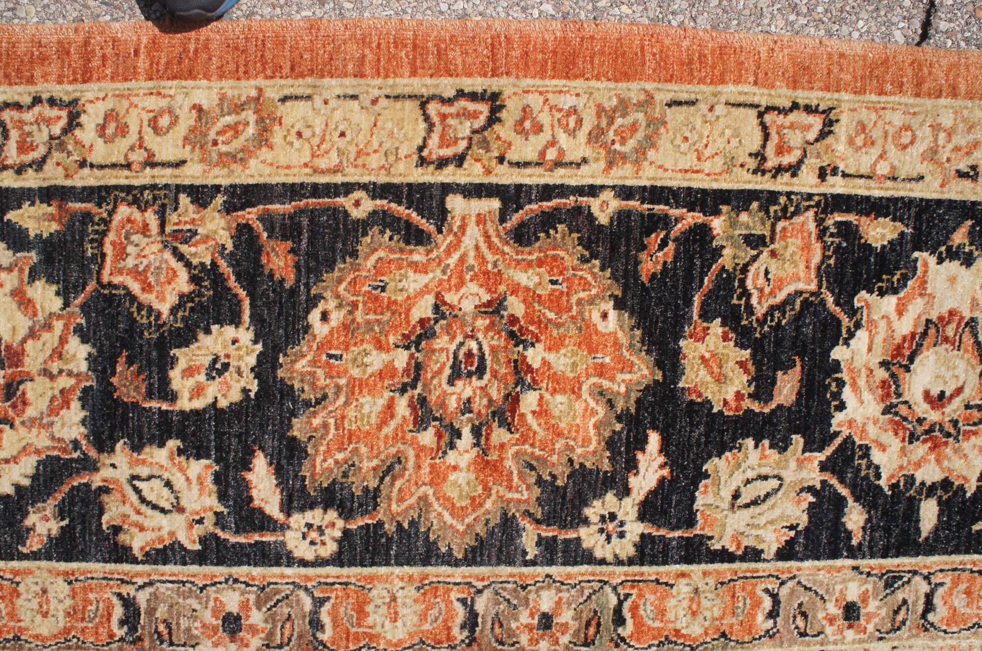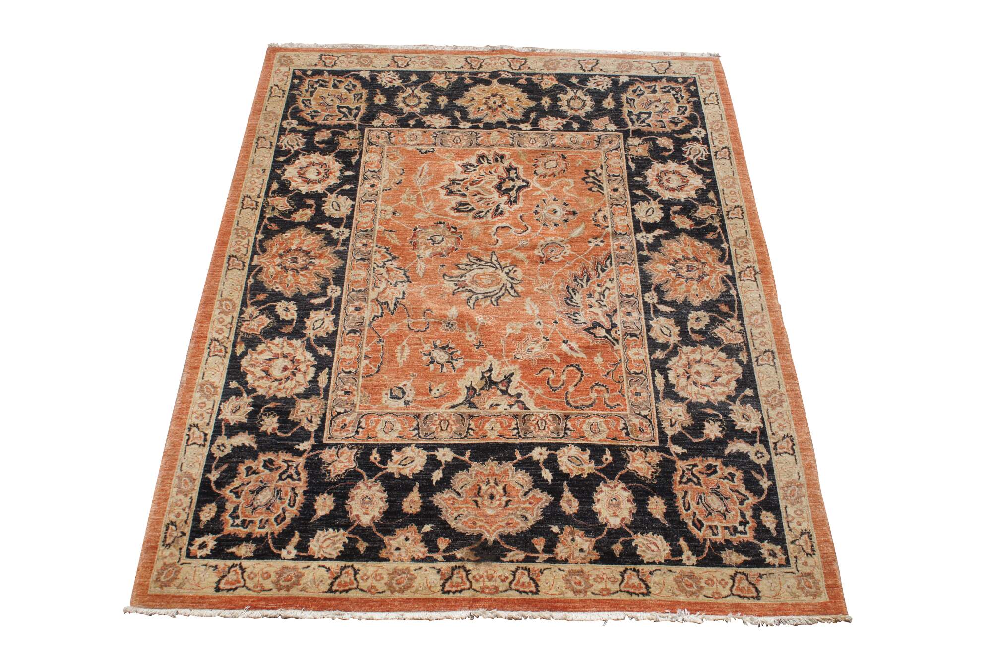 Exceptional hand knotted oriental area rug. Features a floral pattern with large sprays in orange, beige and very dark blue/ black