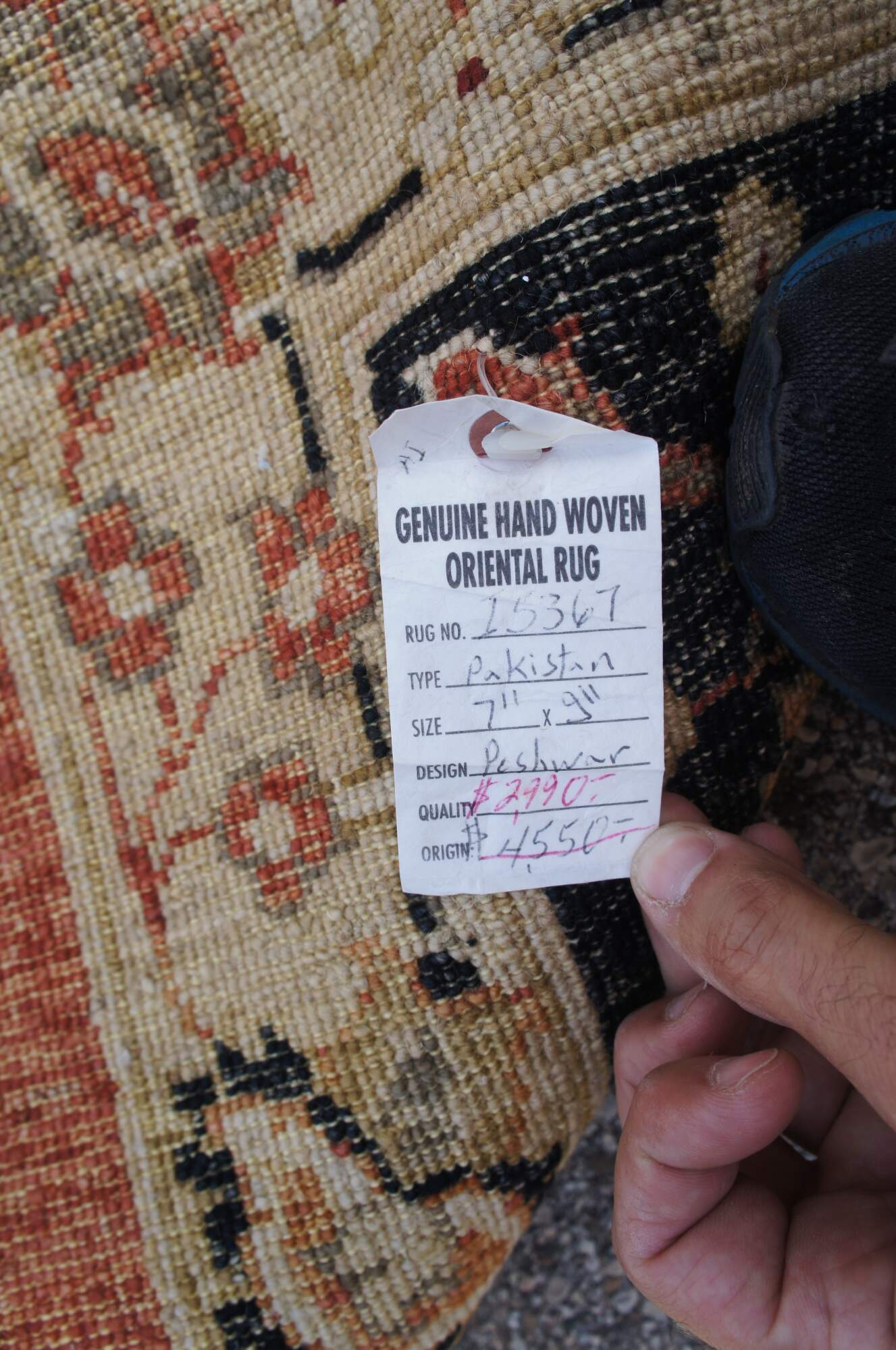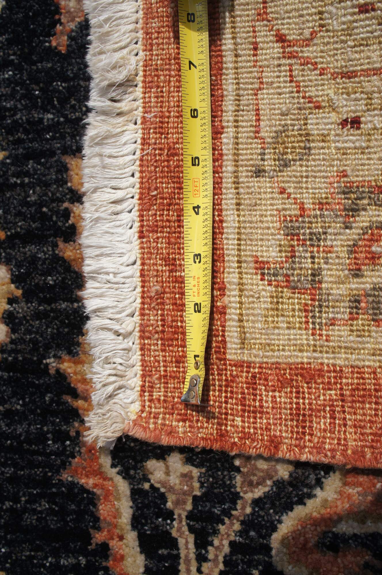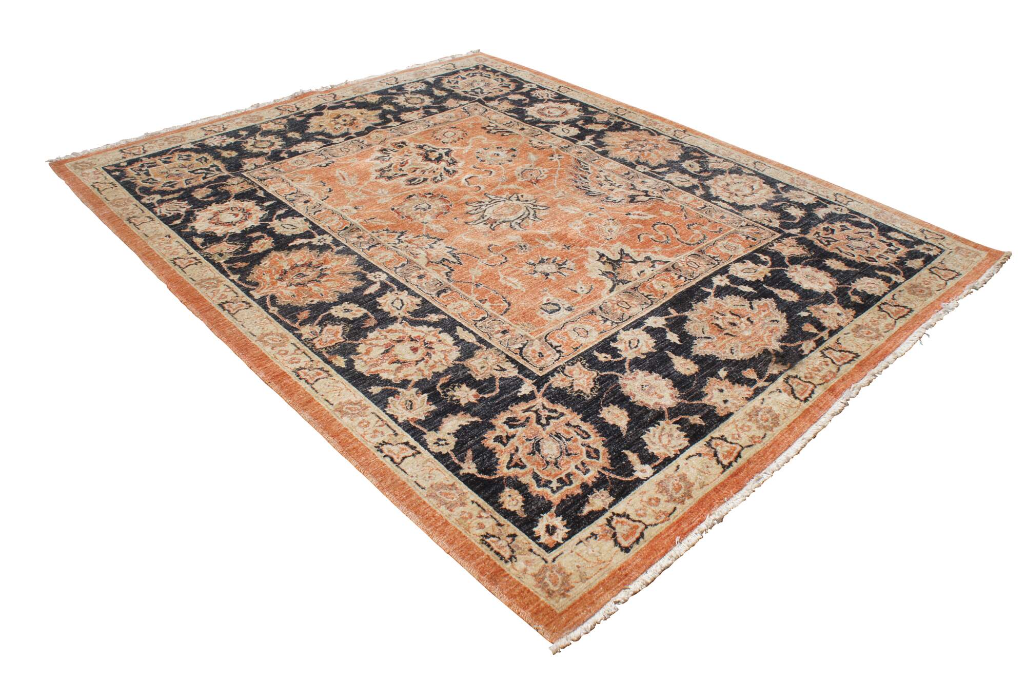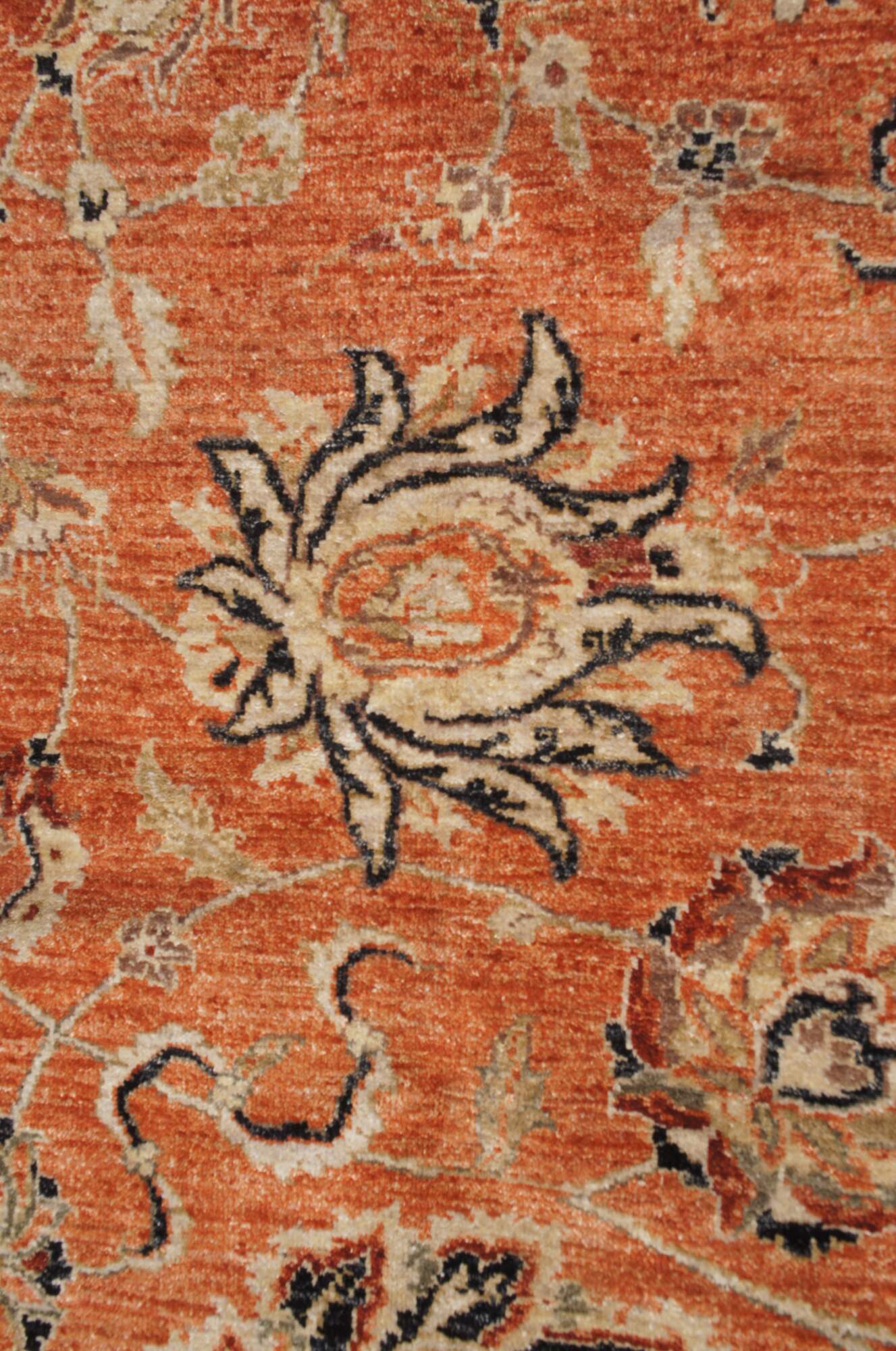 Exceptional hand knotted oriental area rug. Features a floral pattern with large sprays in orange, beige and very dark blue/ black