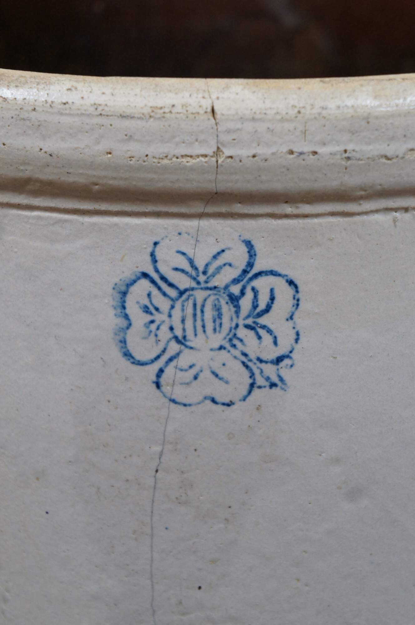 Antique late 19th – early 20th century 10 gallon stoneware crock with off white salt glazed exterior and brown glazed interior, crafted by Miller’s Pottery of Alabama, stamped with their blue four leaf clover mark.
