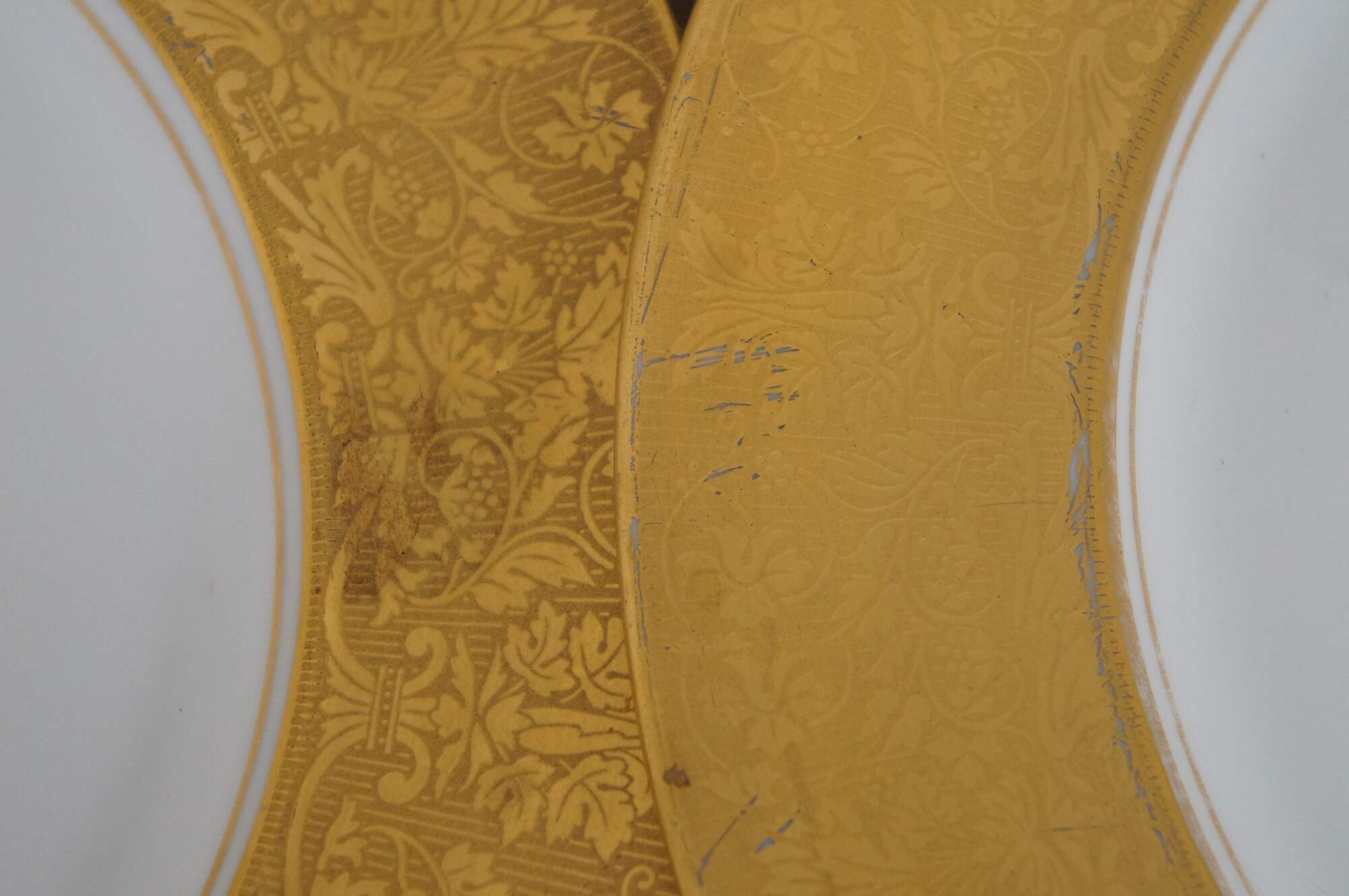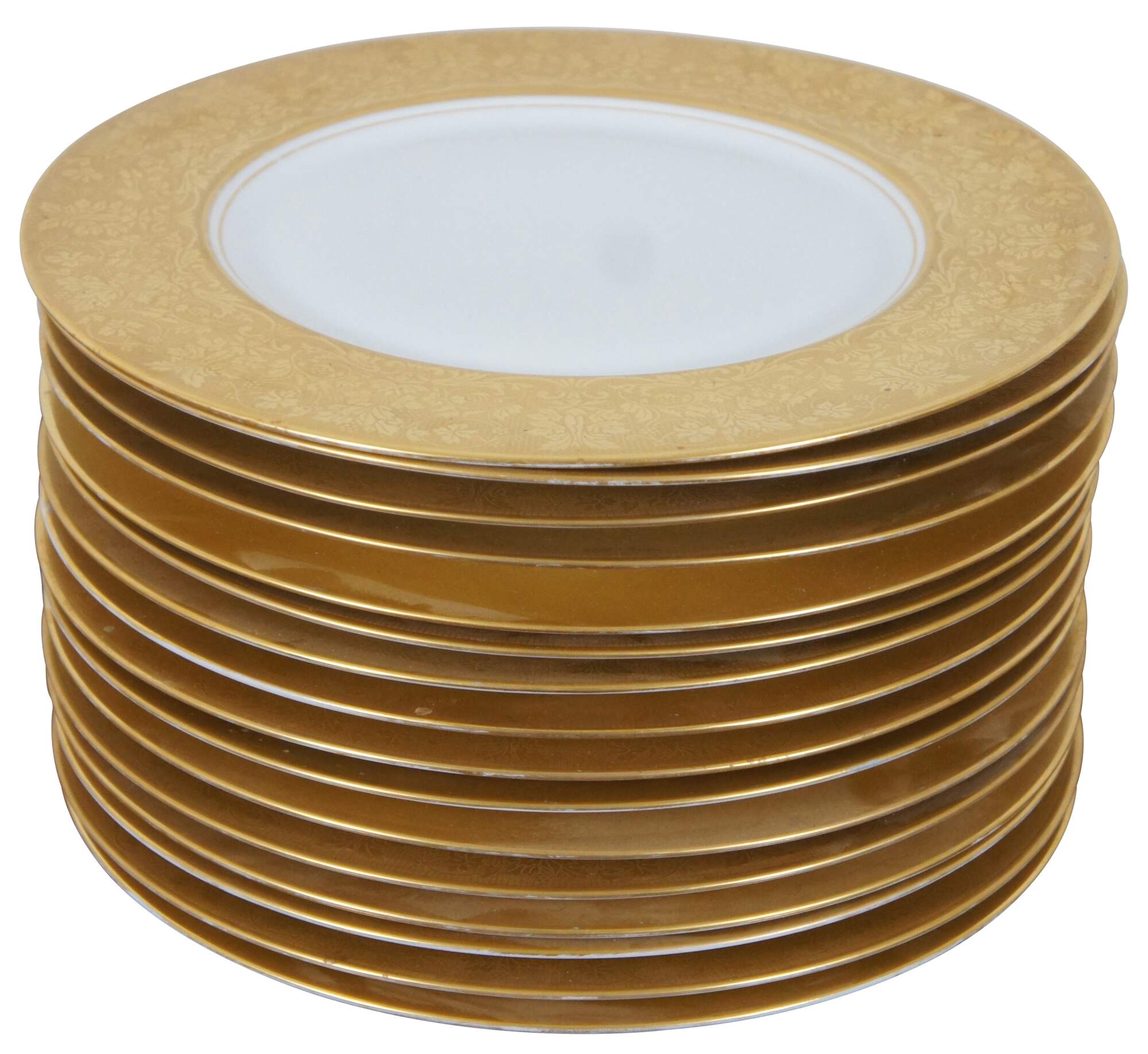 Set of 16 Heinrich & Company porcelain china dinner plates with broad edges encrusted in gold, embossed with florals, urns and grape vines.