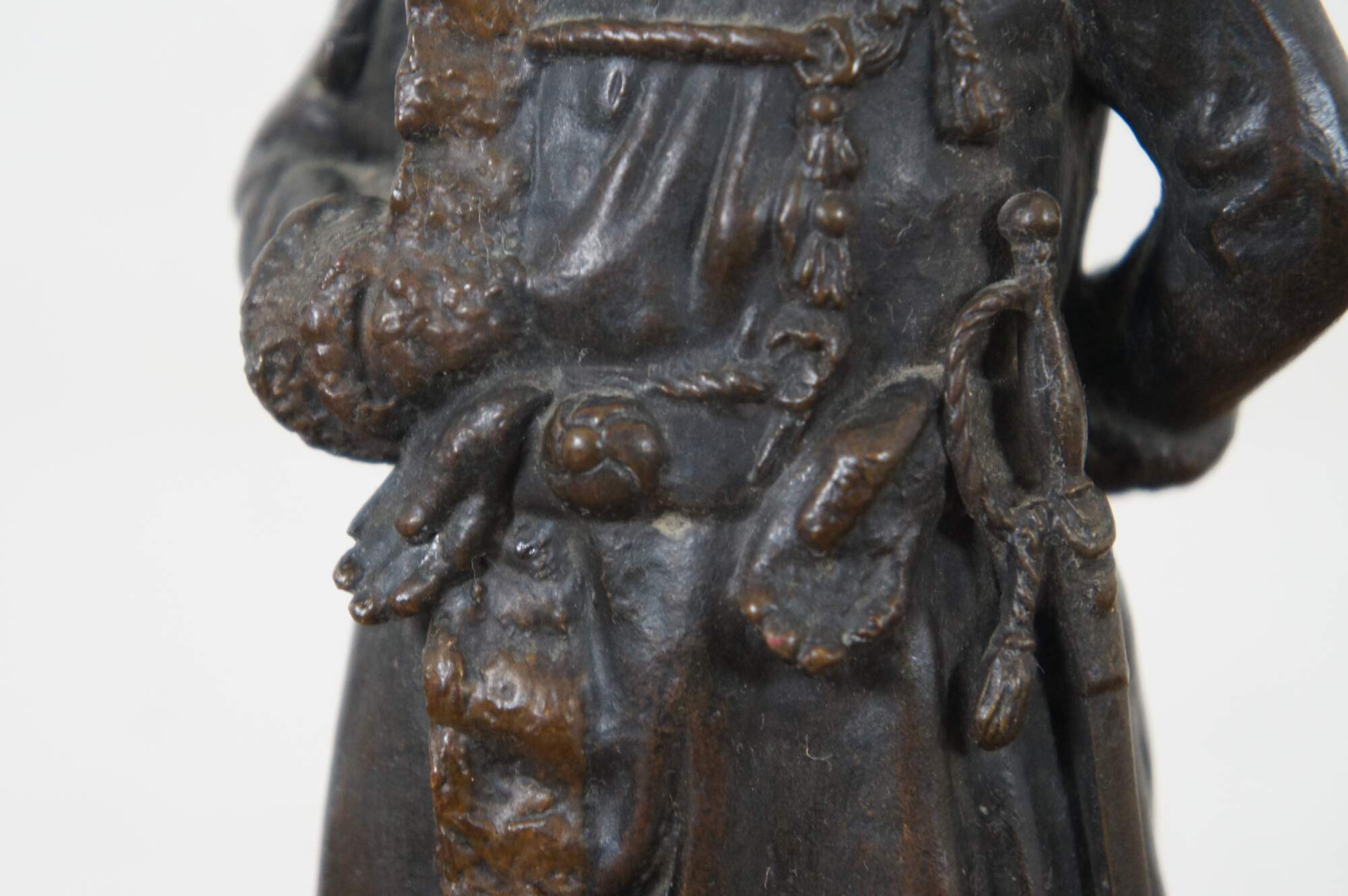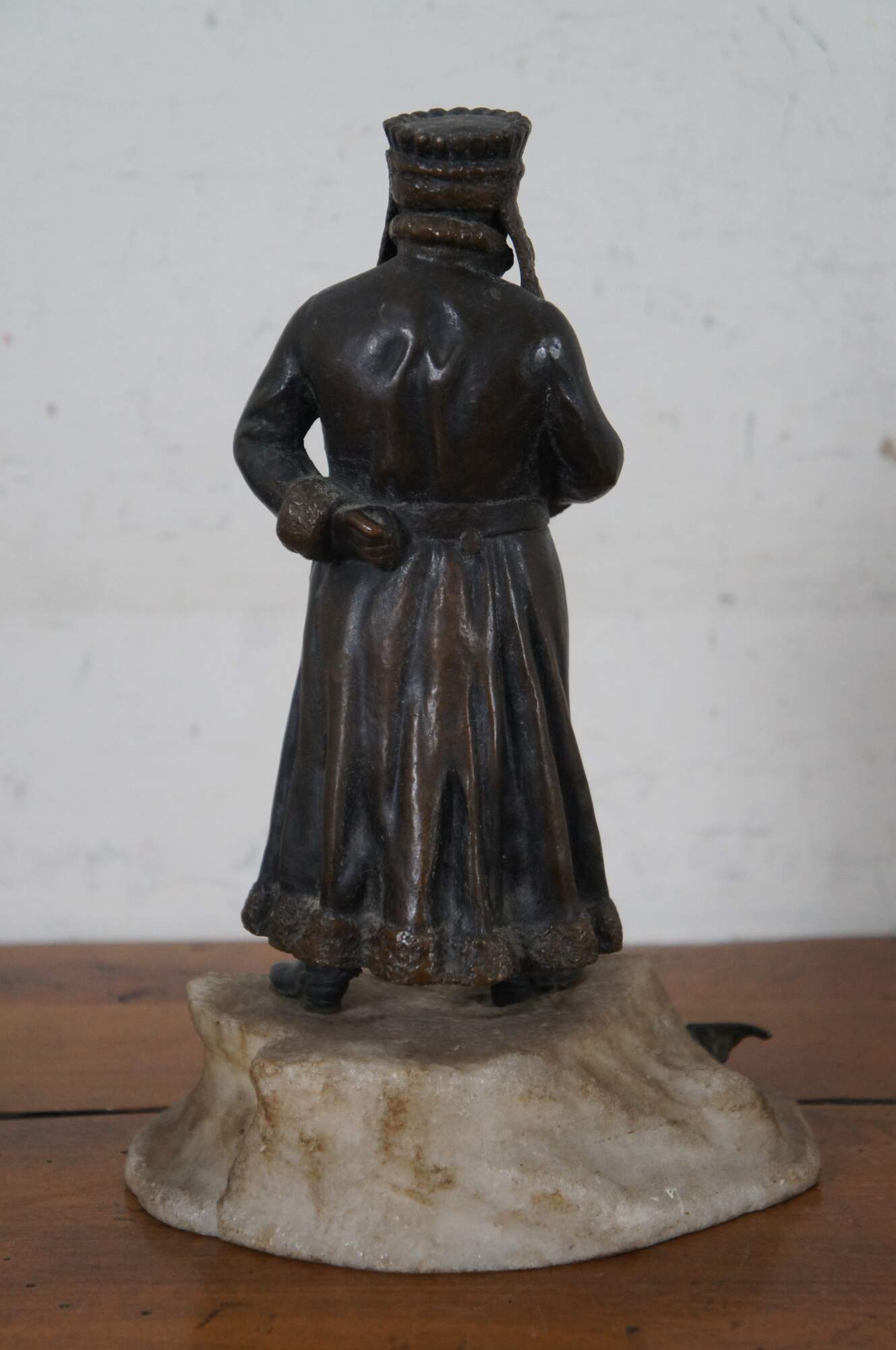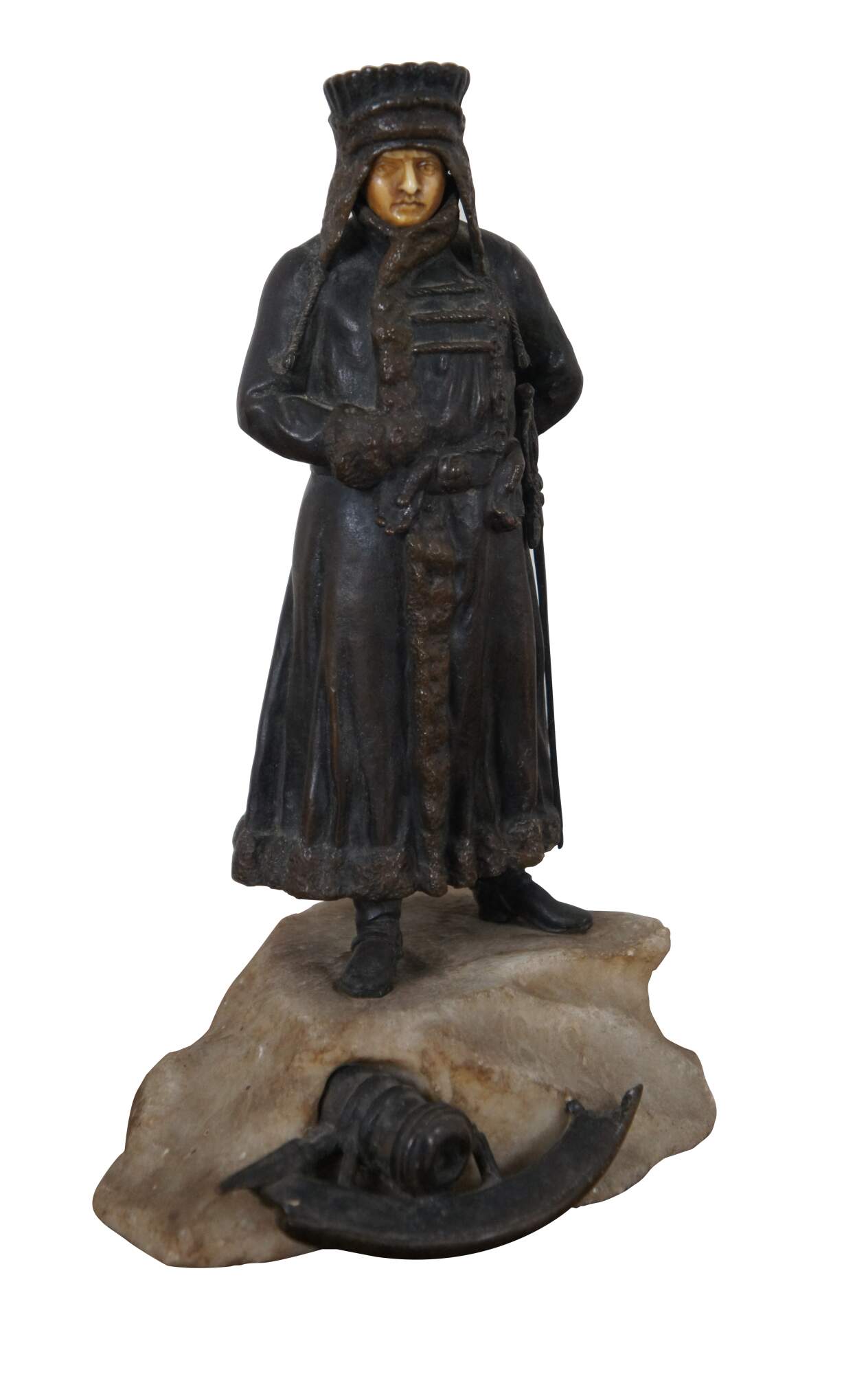 Rare antique turn of the century bronze sculpture of Napoleon Bonaparte dressed for his campaign against Russia in the winter of 1812 after the siege of Moscow. The figure is bronze with a carved face and stands on a rough hewn marble plinth in which is embedded a wagon wheel and broken cannon, carved with the year of Napoleons’s invasion – 1812. Made circa 1900.