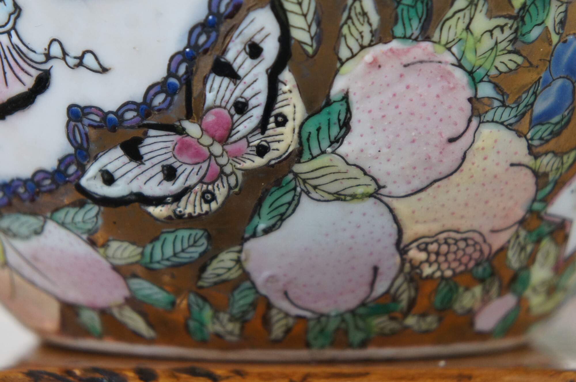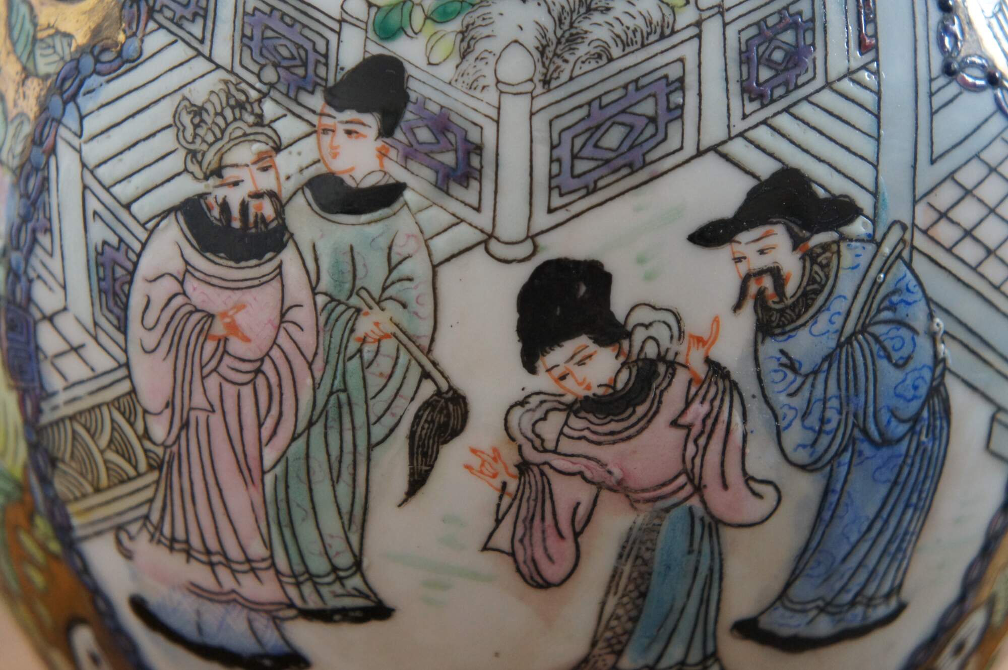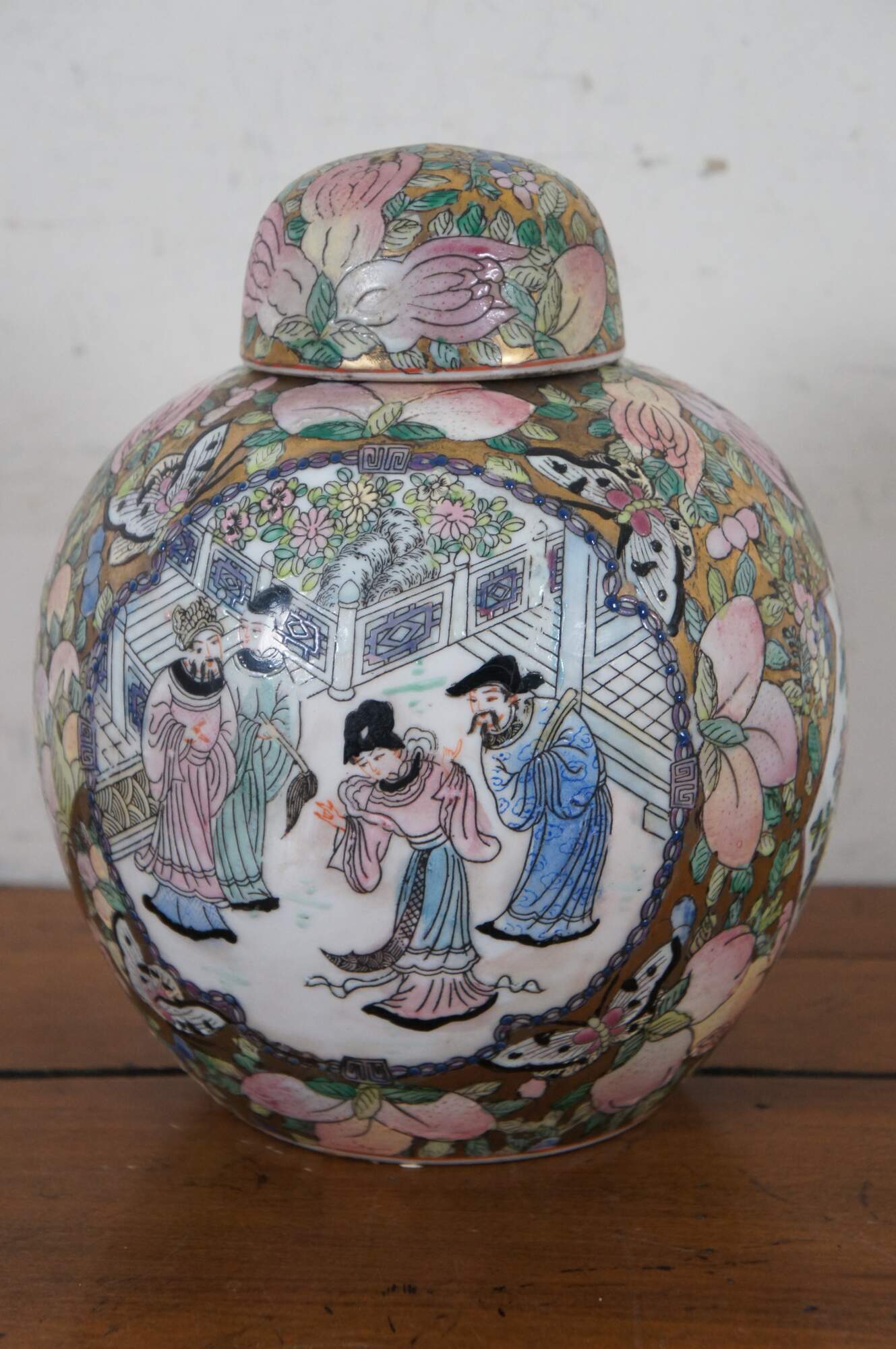 Vintage Chinese famille rose cloisonne porcelain ginger jar featuring a court or gardens scene of Geisha figures and scholars walking in a palace garden, surrounded by flowers and butterflies on a golden background. Marked C&F Enterprises.