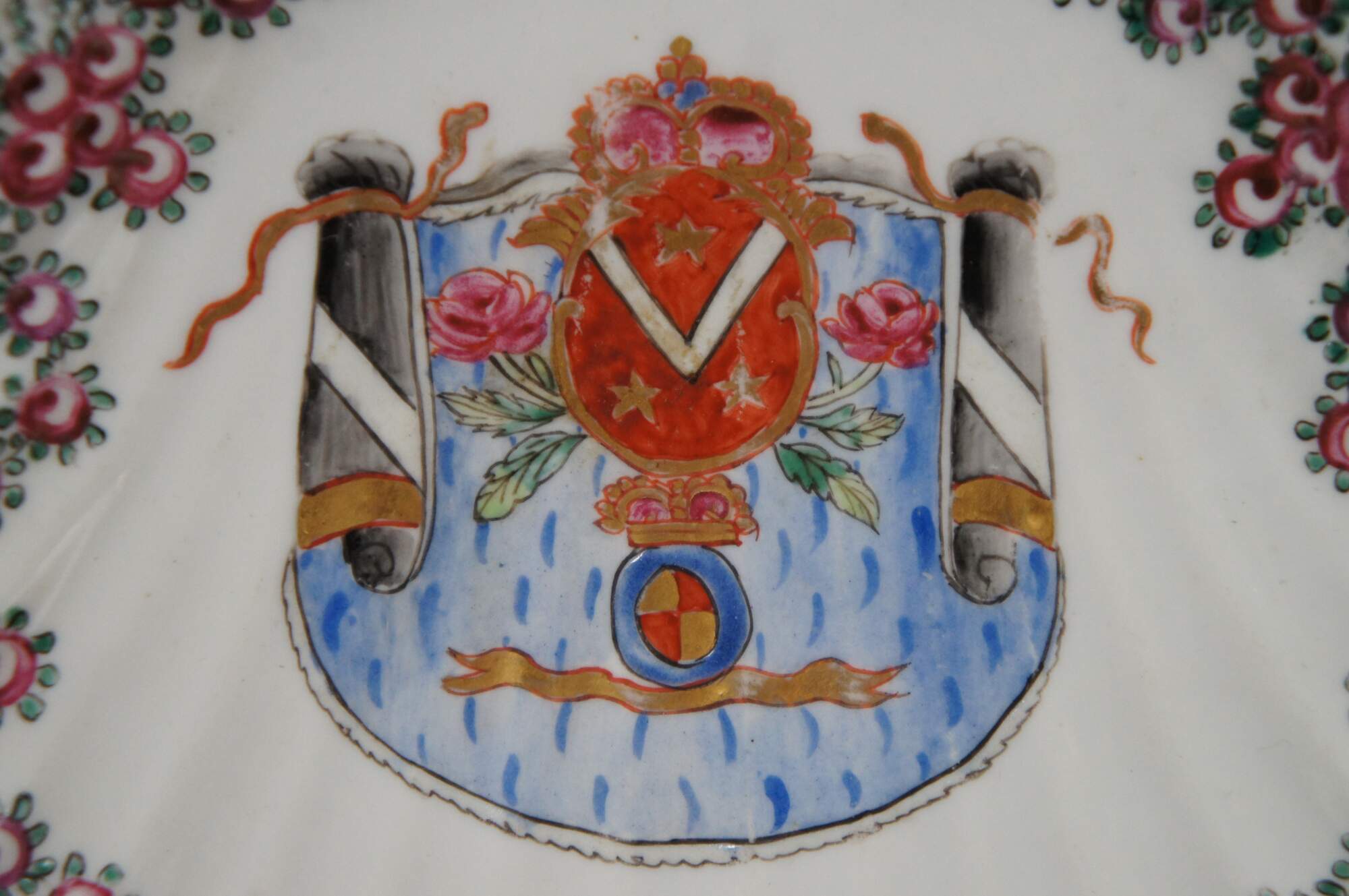 Mid 20th century (circa 1941-1957) hand painted Chinese Export style scallop shell porcelain dish, featuring gilded edges, a wreath of roses and an armorial central coat of arms / shield / crest motif, produced by Samson Edme et Cie.