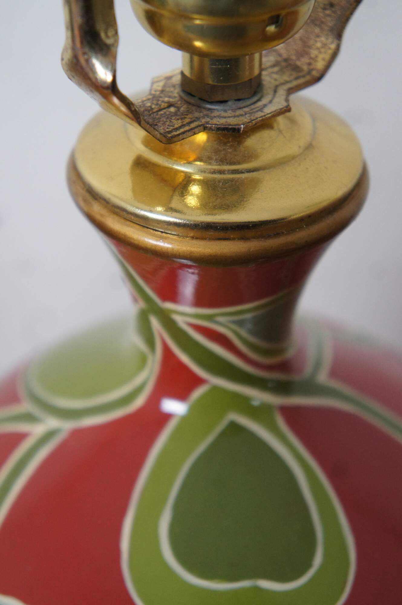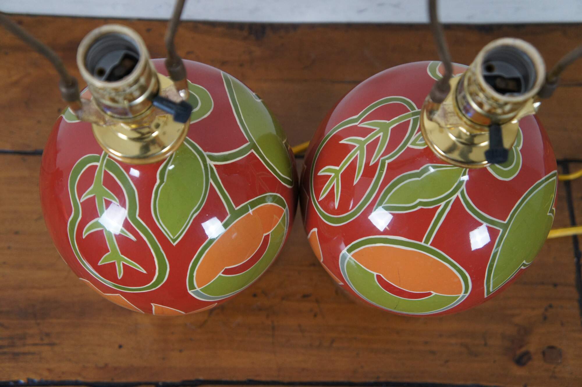A beautiful pair of ceramic table lamps. Each features a tropical deisgn in red orange and green.