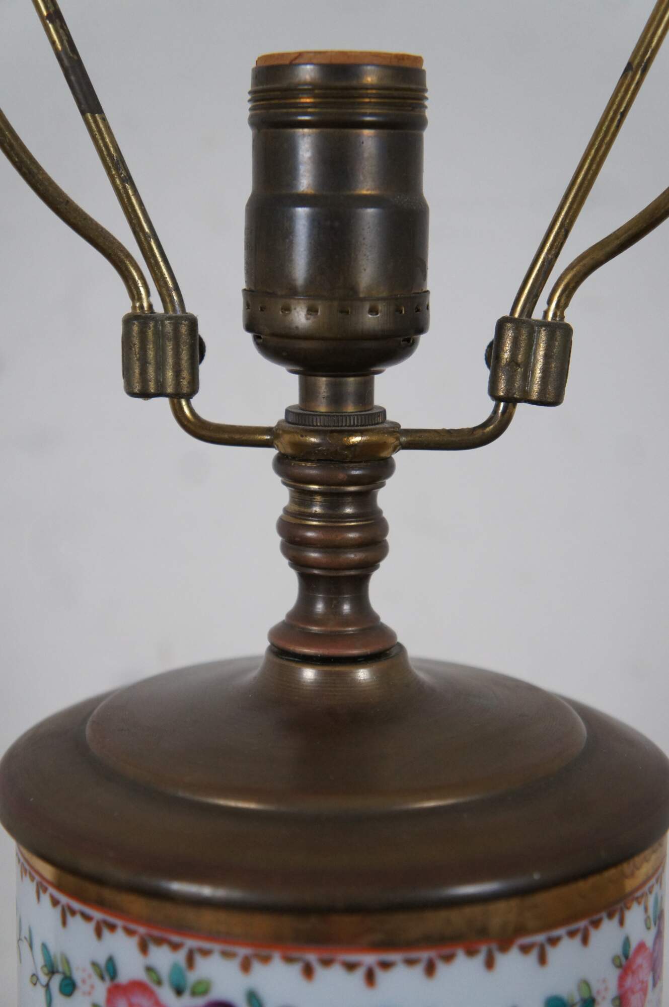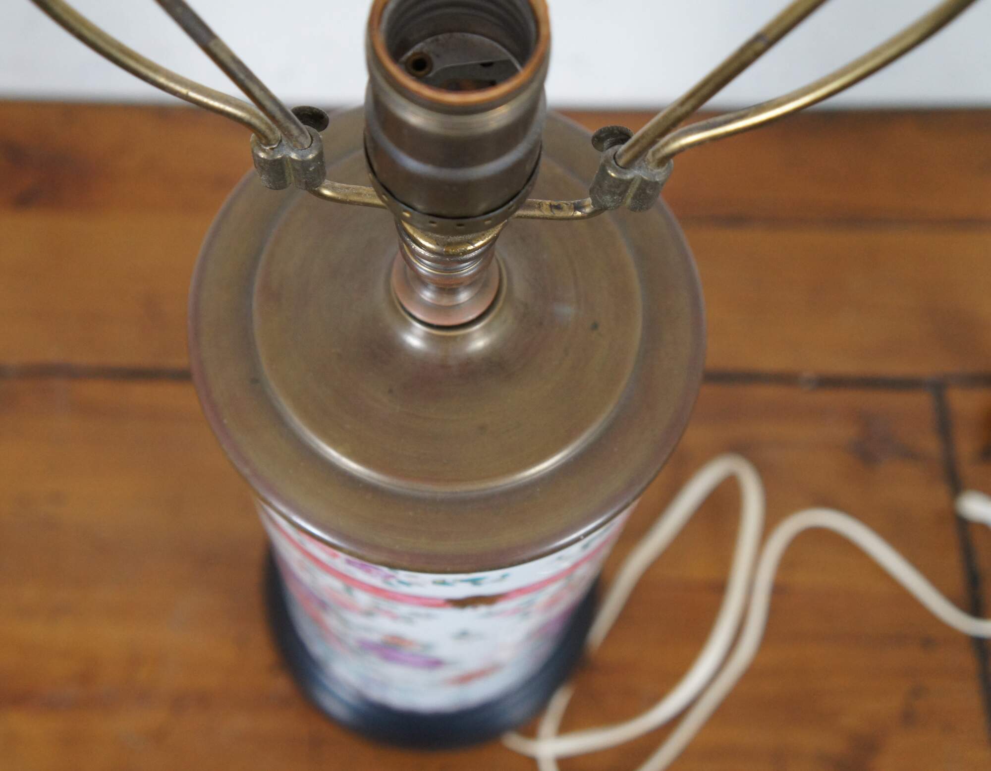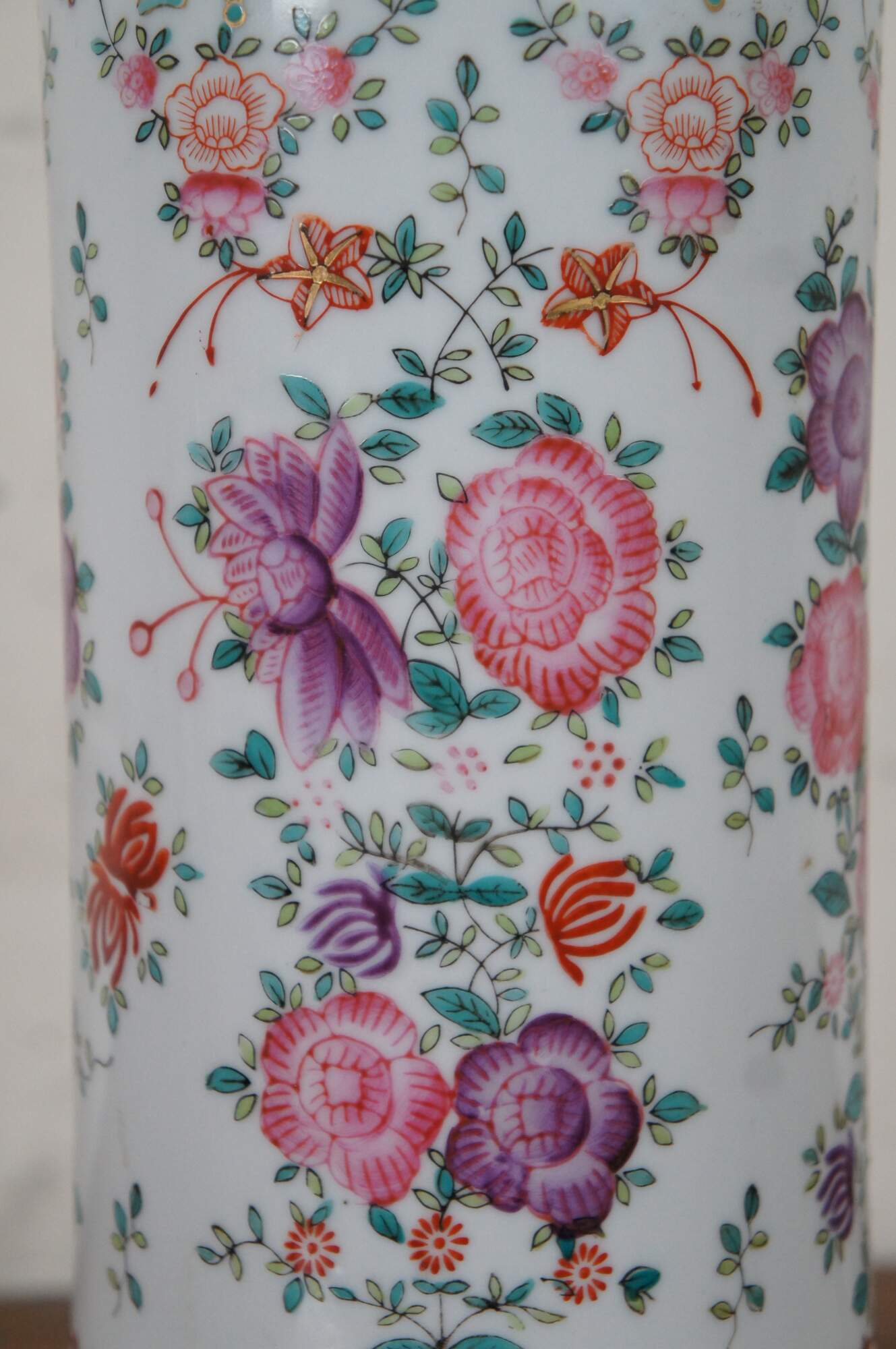 Antique Chinese famille rose porcelain cylindrical vase lamp with wood base and topper, decorated with a design of flowers in pink and purple.