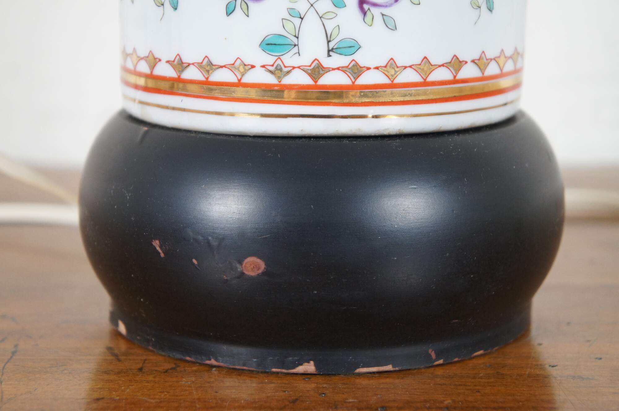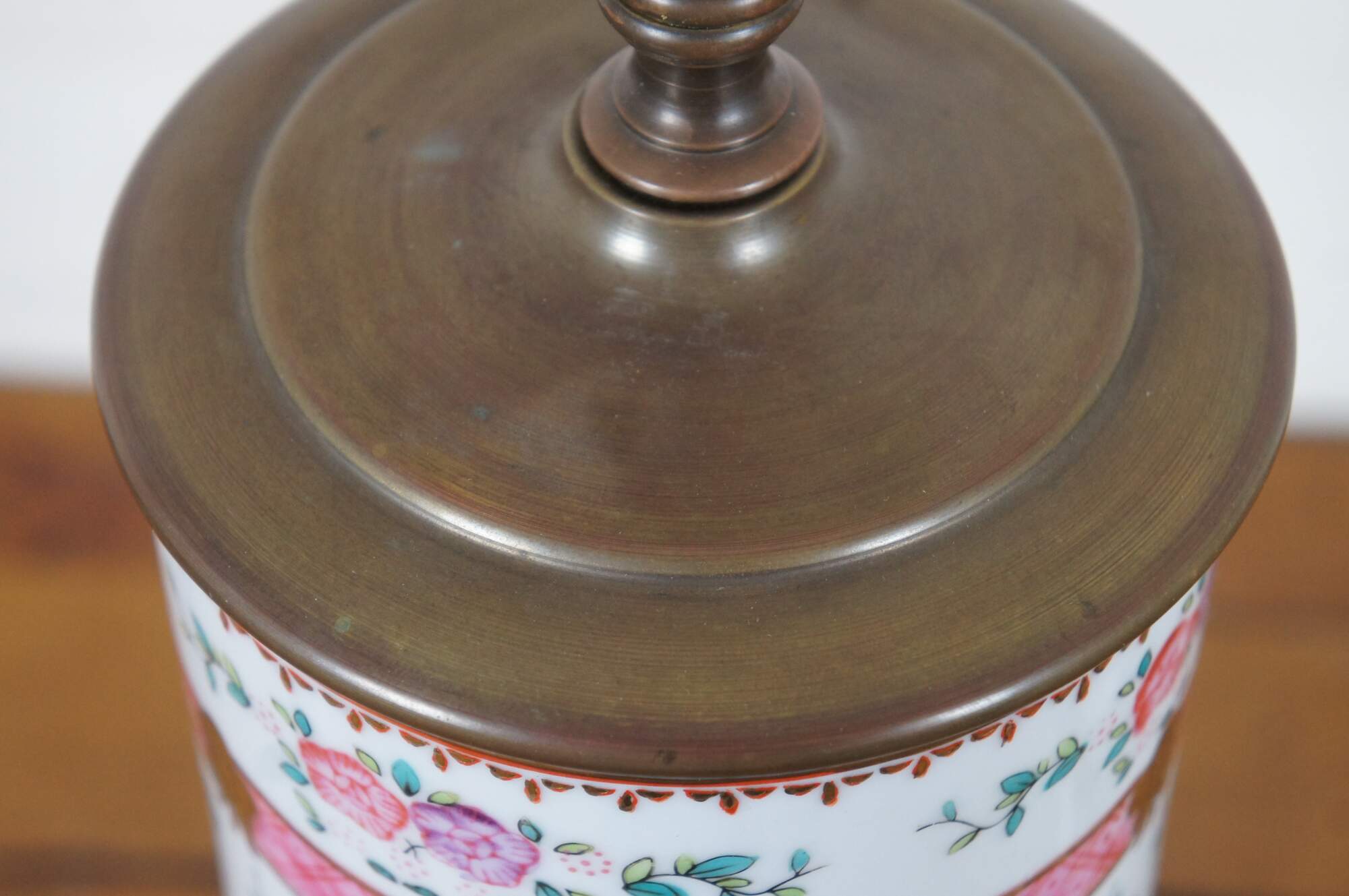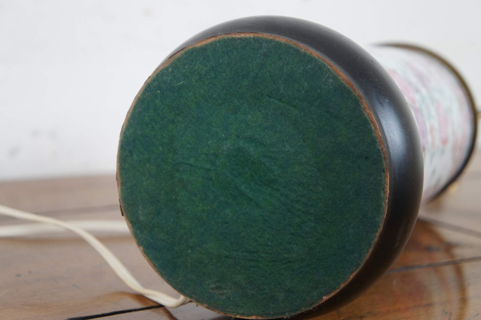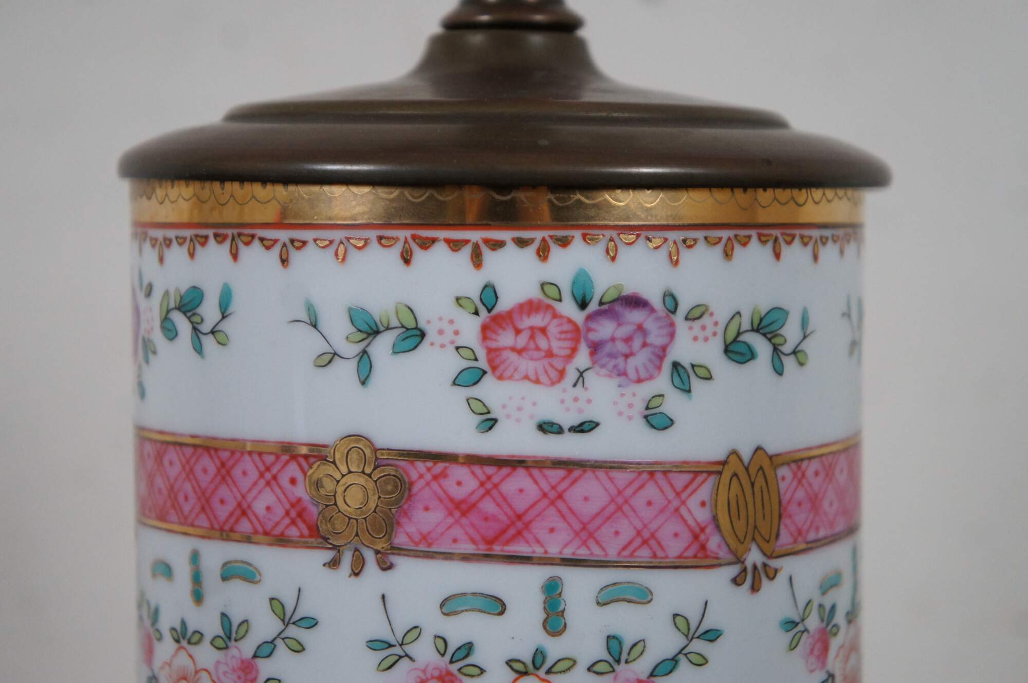 Antique Chinese famille rose porcelain cylindrical vase lamp with wood base and topper, decorated with a design of flowers in pink and purple.