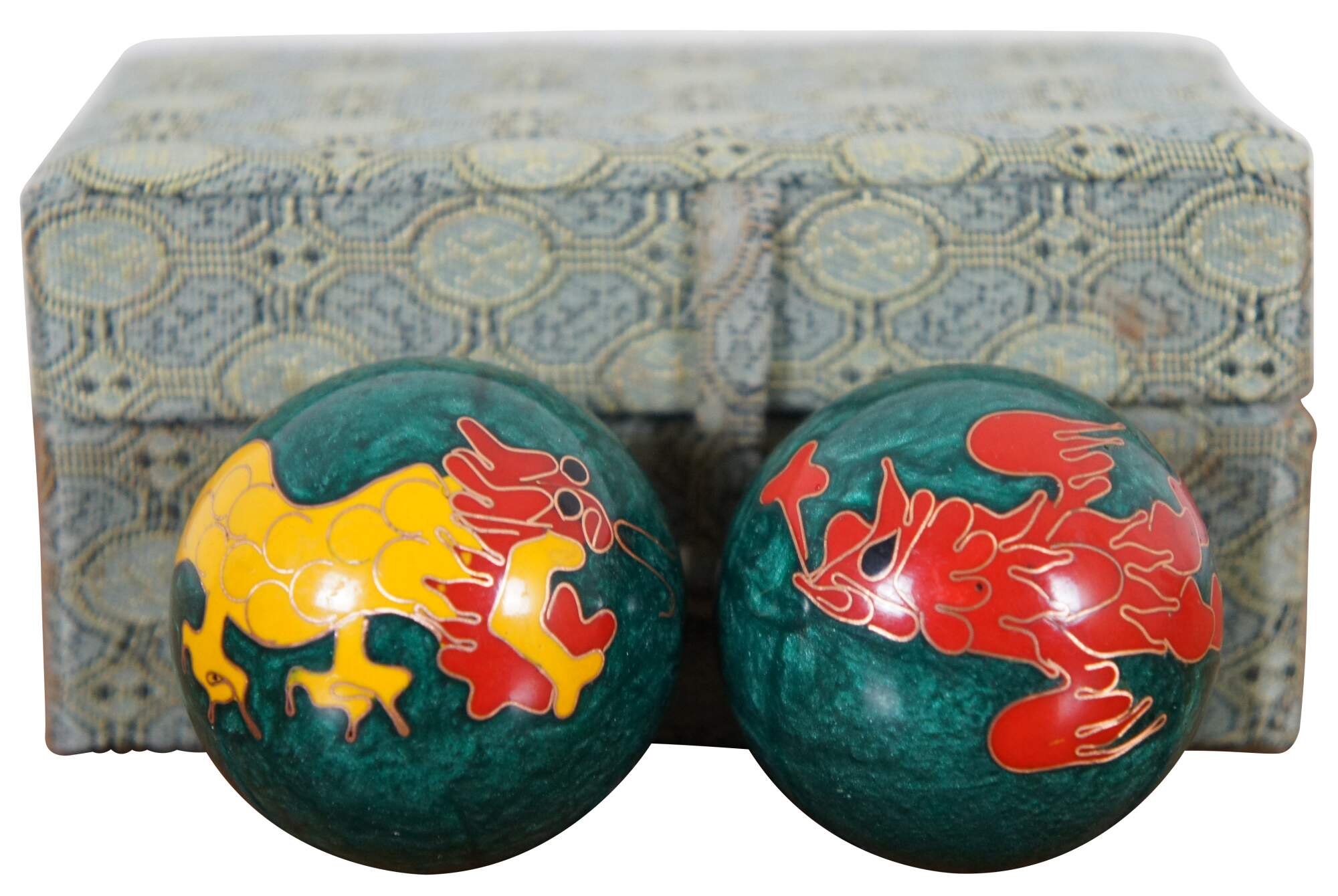 Pair of vintage Chinese cloisonne chiming baoding hand exercise / relaxation / therapy / stress / meditation balls and storage box, featuring a glittering, teal background with golden clouds, a yellow dragon, and a red pheonix.