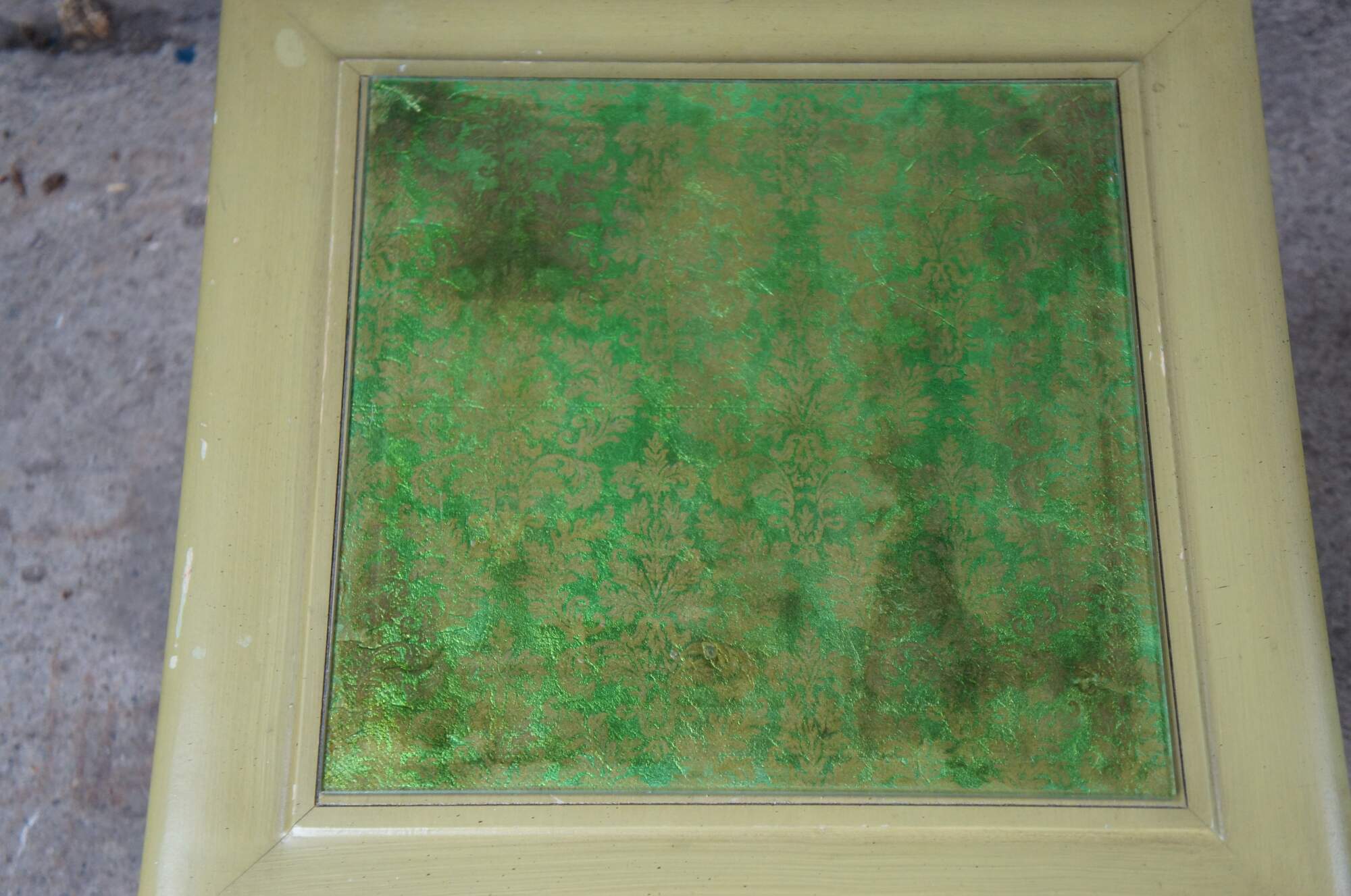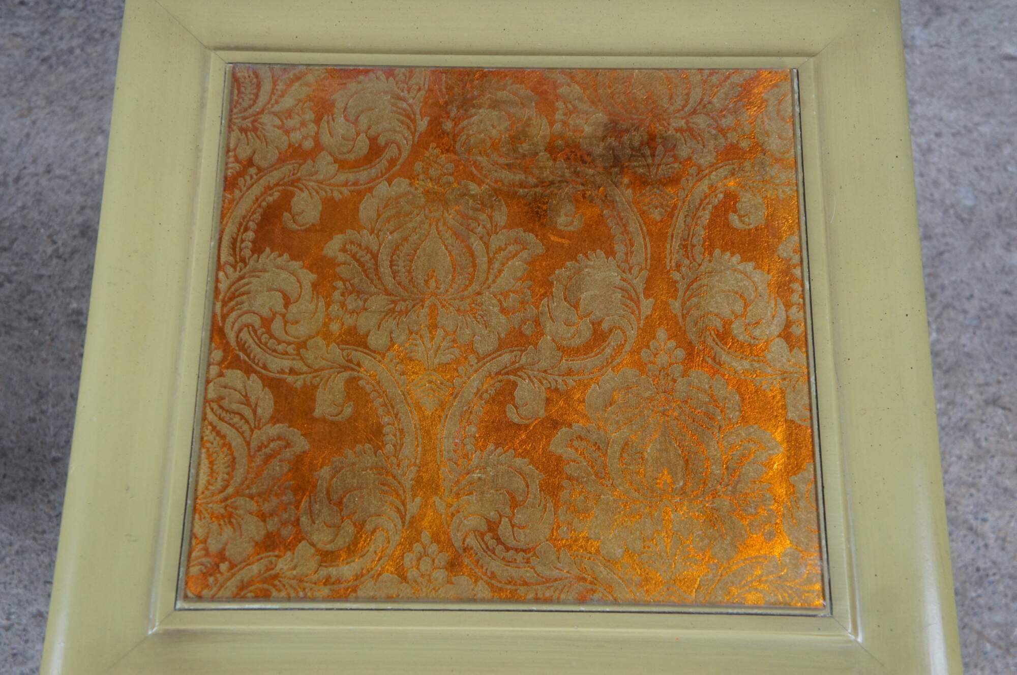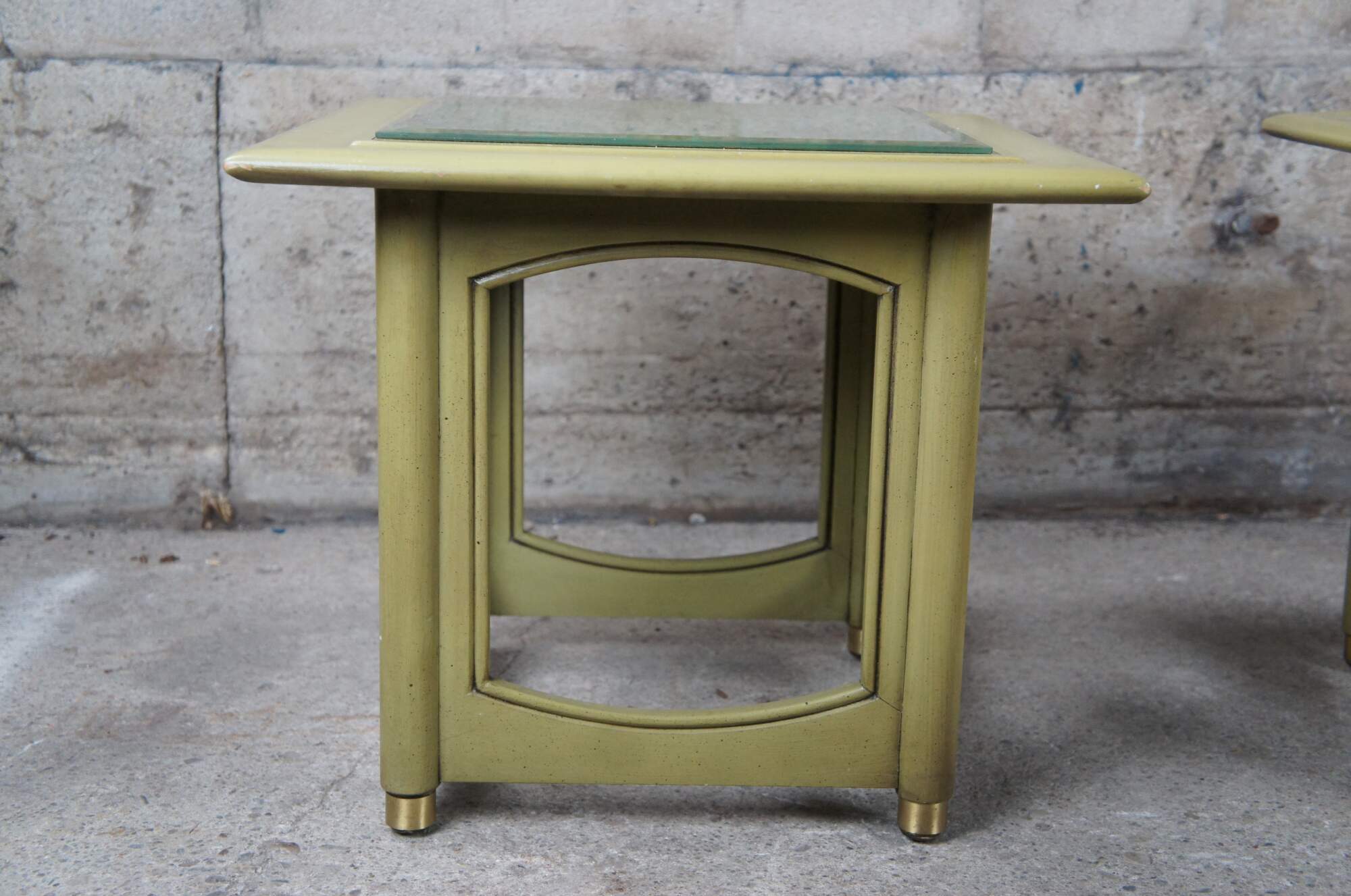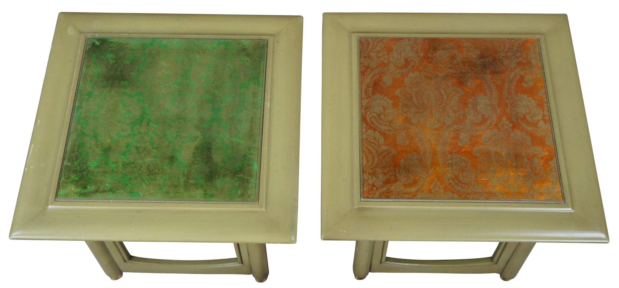 Pair of Hekman square accent tables. Made from wood with a distressed green finish. Features an open frame base with beveled glass tops. Each top is set over a french brocade. One is orange and the other is green. The glass is removeable and has the same green finish on the top.