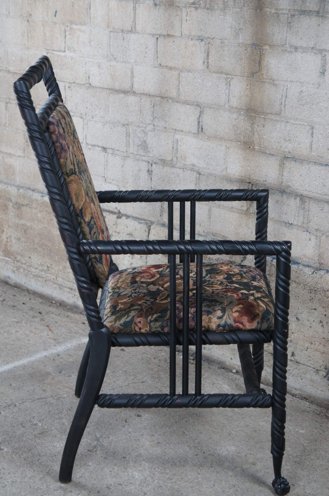 Late Victorian Hunzinger Arm Chair. Made from Mahogany with a barley twisted frame featuring spindled accents, tapestry seat and back as well as ball and claw feet.
