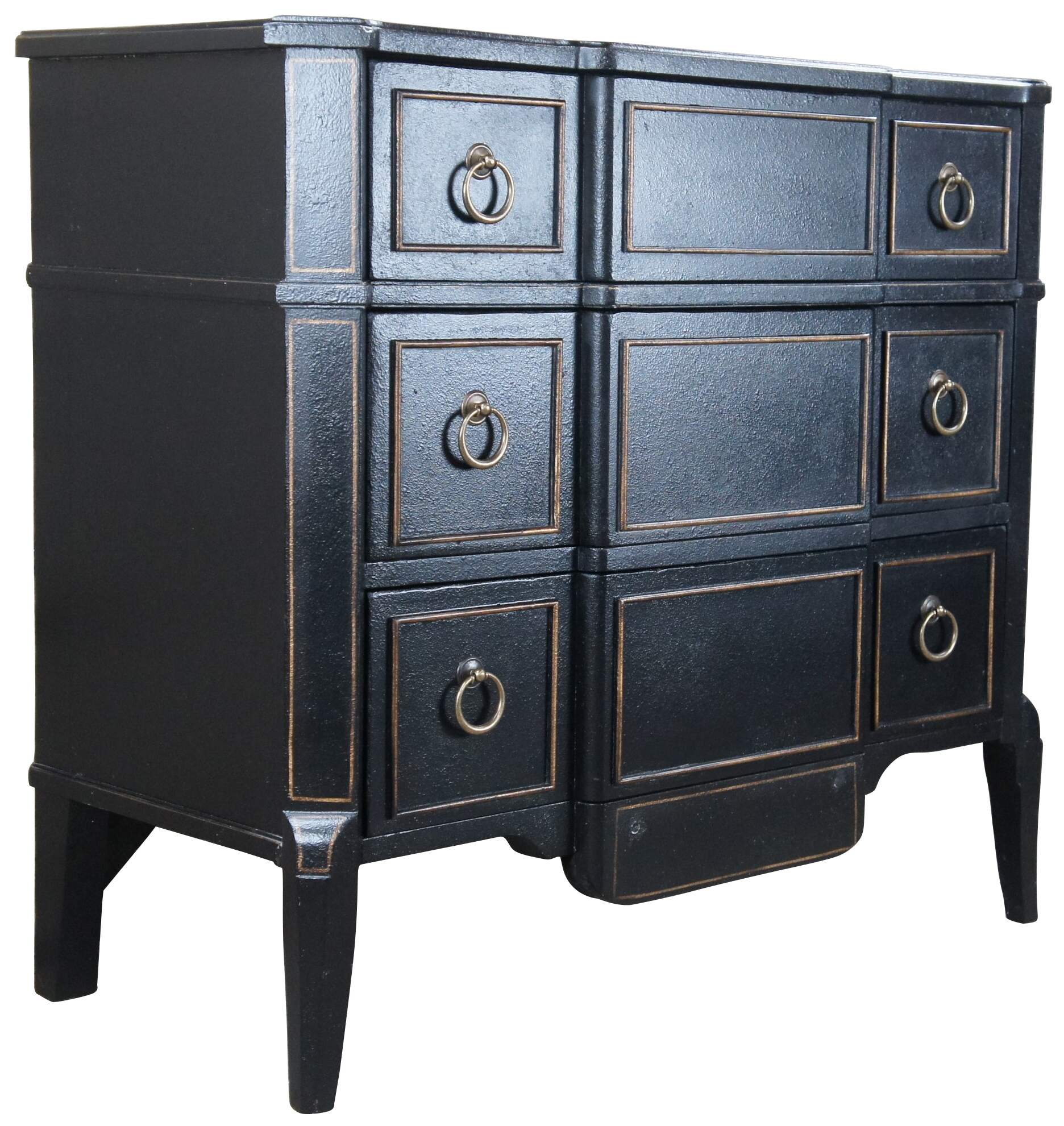 A stunning Neoclassical lacquered commode by Milling Road for Baker. Circa last quarter 20th century. Beautifully designed with a black lacquered textured finish accented in gold. Features a rectangular form of three drawers with pronounced front and chamfered sides. The case is raised of tapered legs. Includes brass ring drawer pulls.
