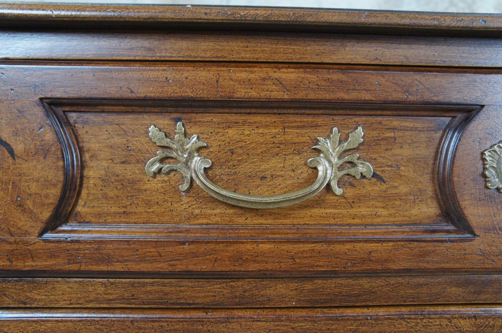 Vintage Mt. Airy walnut French Provincial / Country lowboy chest, dresser or stand featuring rectangular serpentine form with two drawers, brass hardware and cabriole legs. 2483.