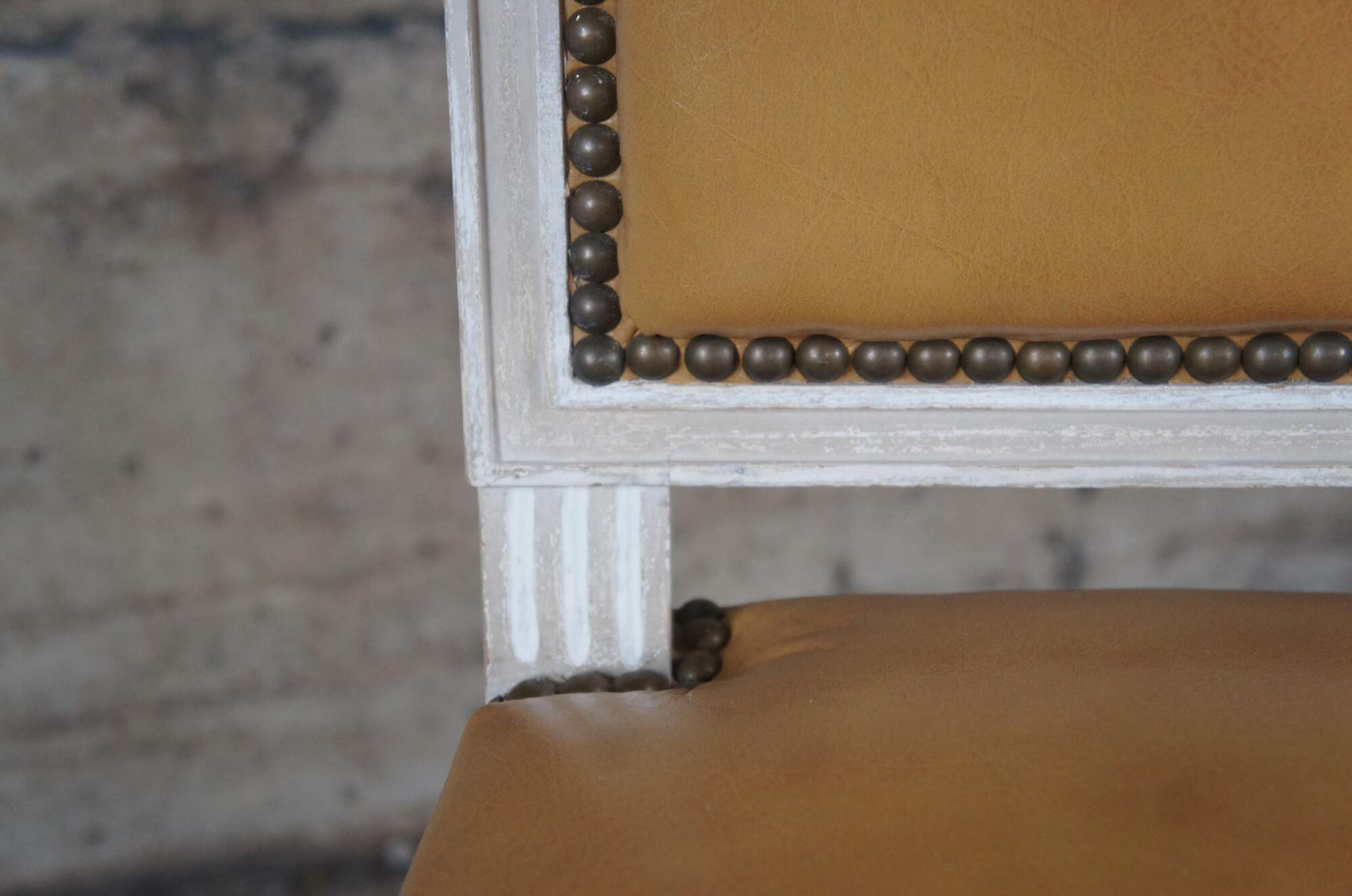 Baker Furniture French Louis XVI style Dining Side Chairs, circa 1960s. Features a square frame over turned and fluted legs leading to arrow feet. The chairs are upholstered in leather with nail head trim with a plaid backing. Provincial finish in gray and white