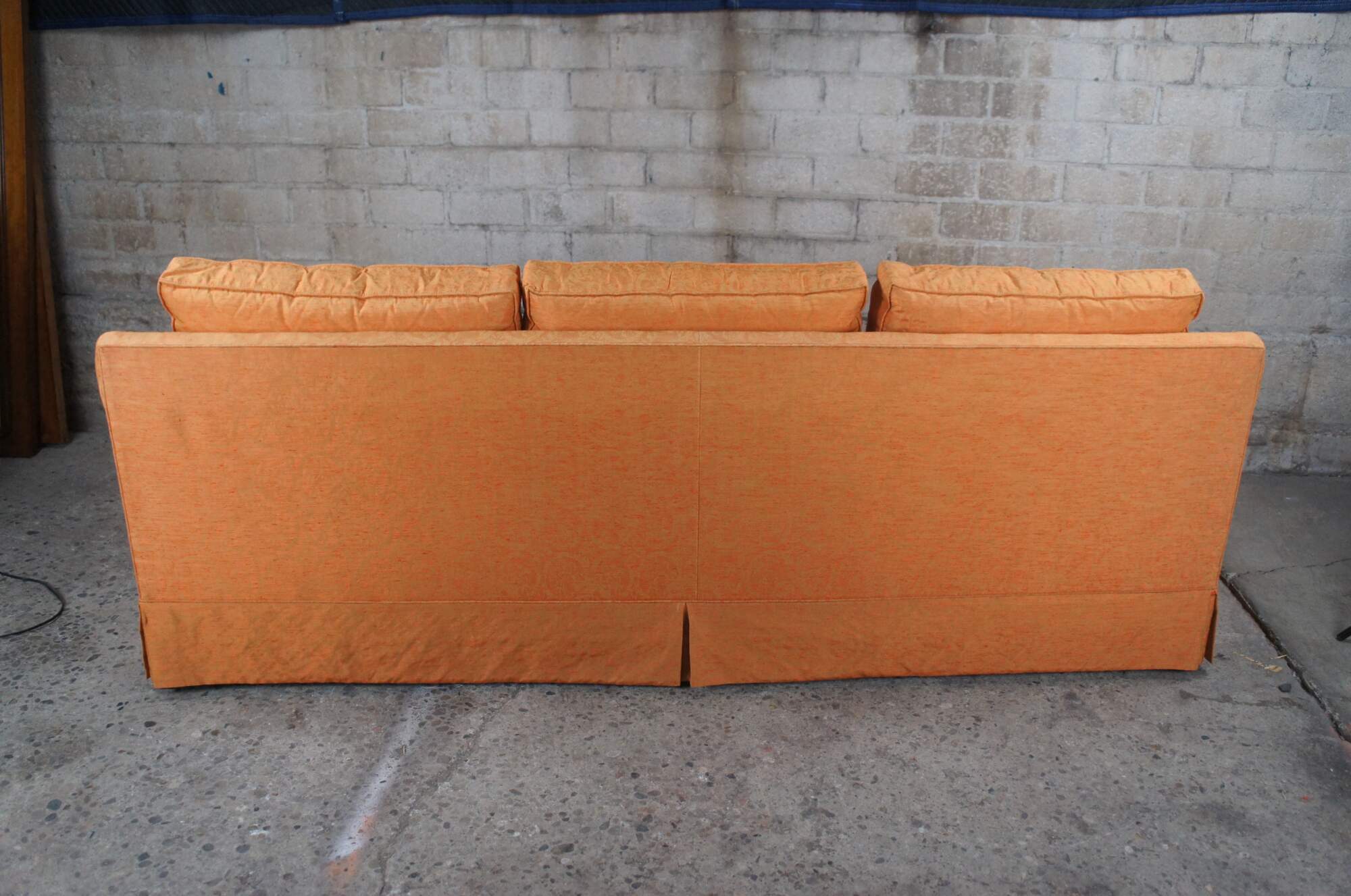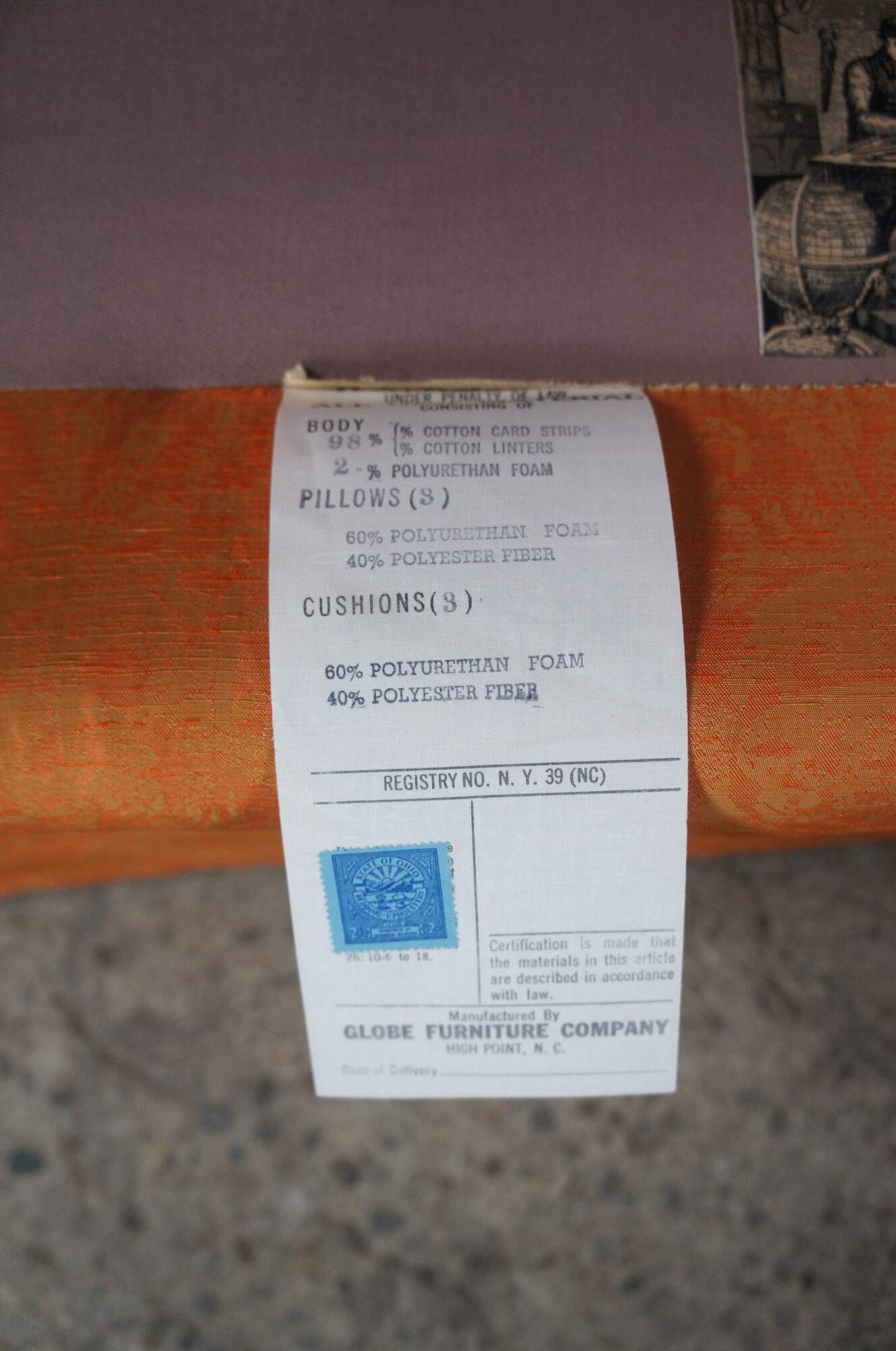 An eye catching mid century 3 seater sofa by Globe Furniture, c.1962. Features a rectangular form upholstered in an orange damask style fabric with quilted medallion back pillows. The sofa is supported by square tapered legs with a mahogany finish. An iconic look from the "Mad Men" era.