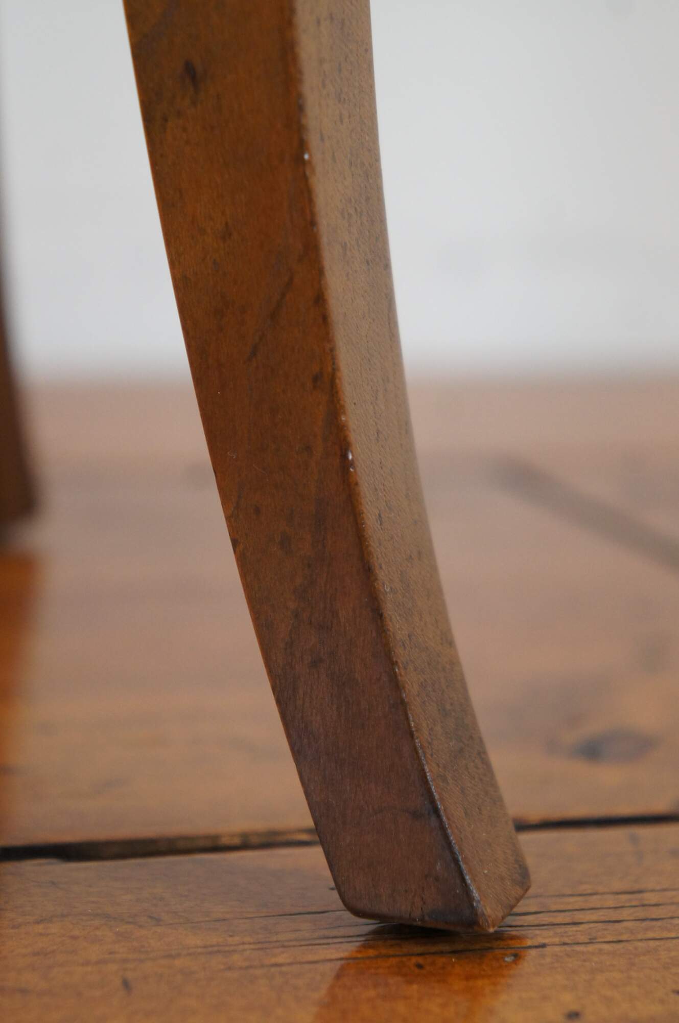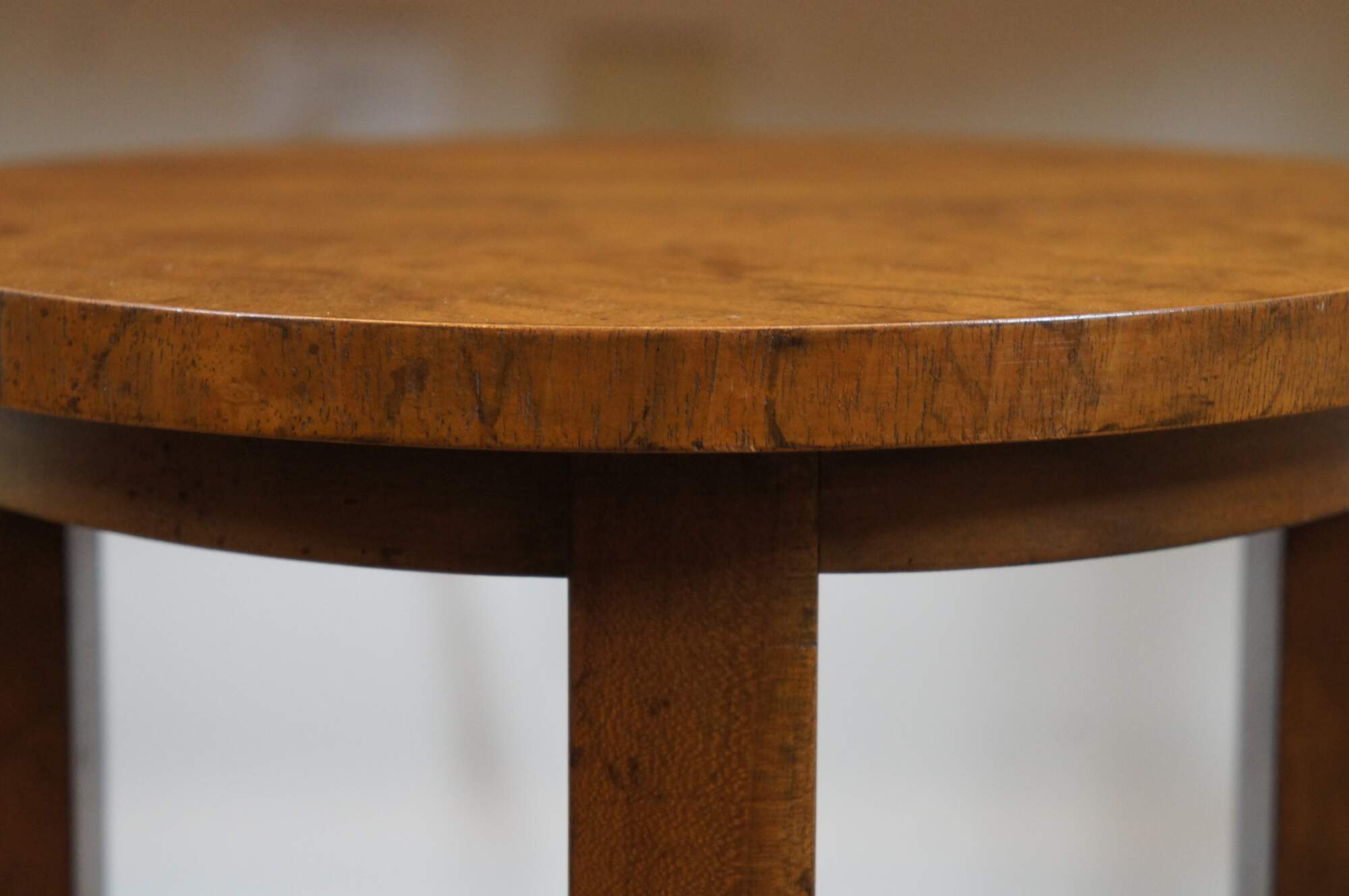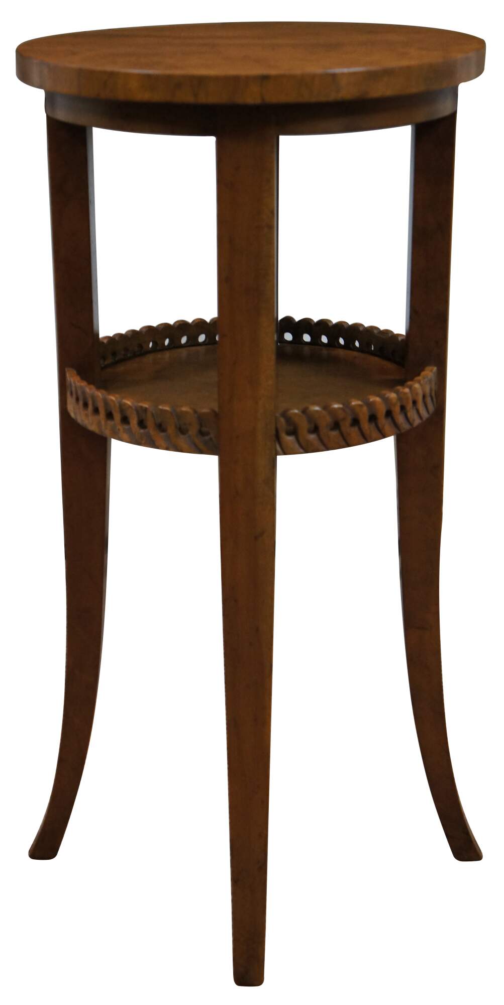 Rare Vintage Baker Furniture two tier accent table / plant stand with round top, sabre legs and a pierced rope twist gallery on the lower tier. Made from European Walnut