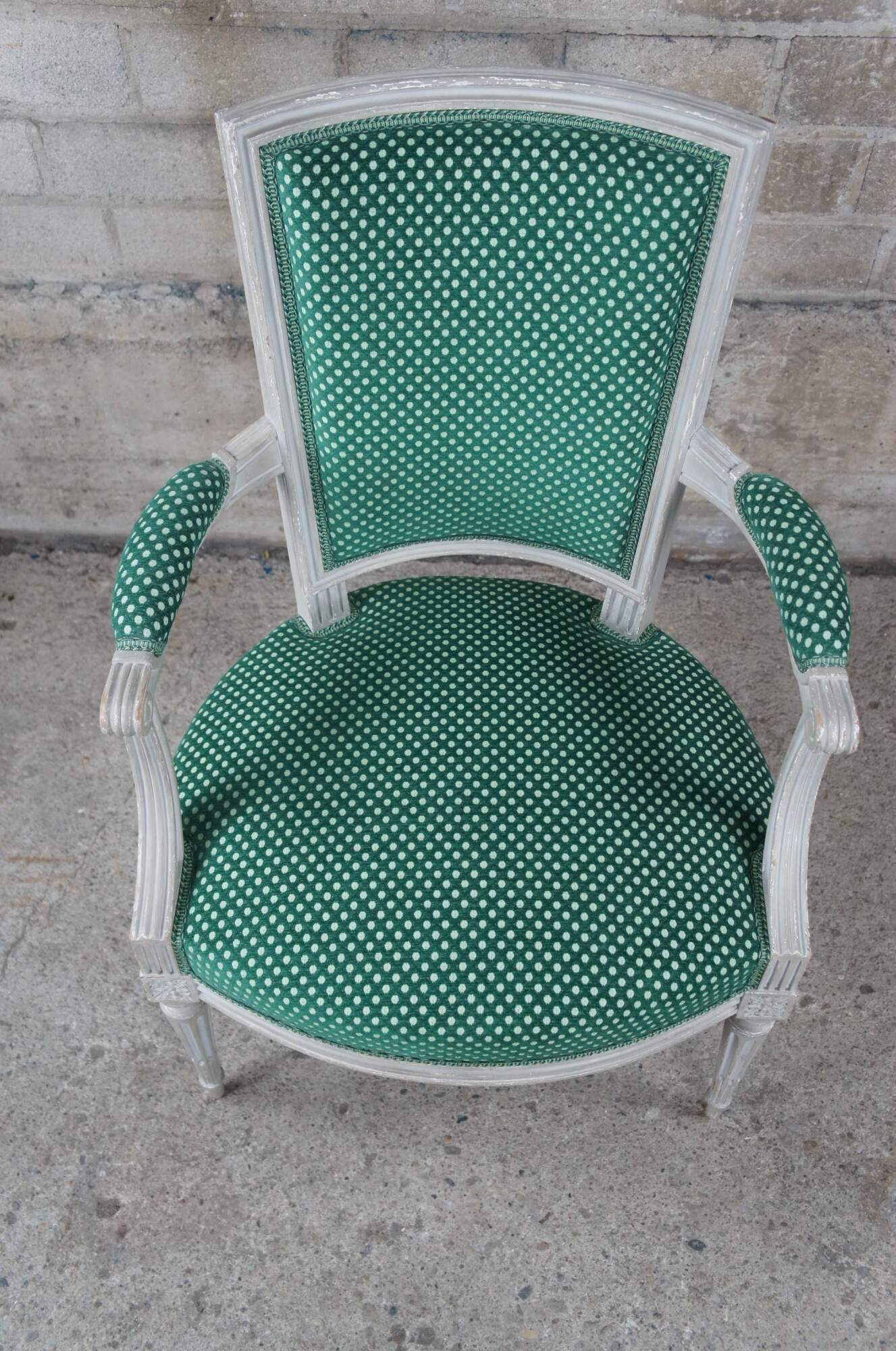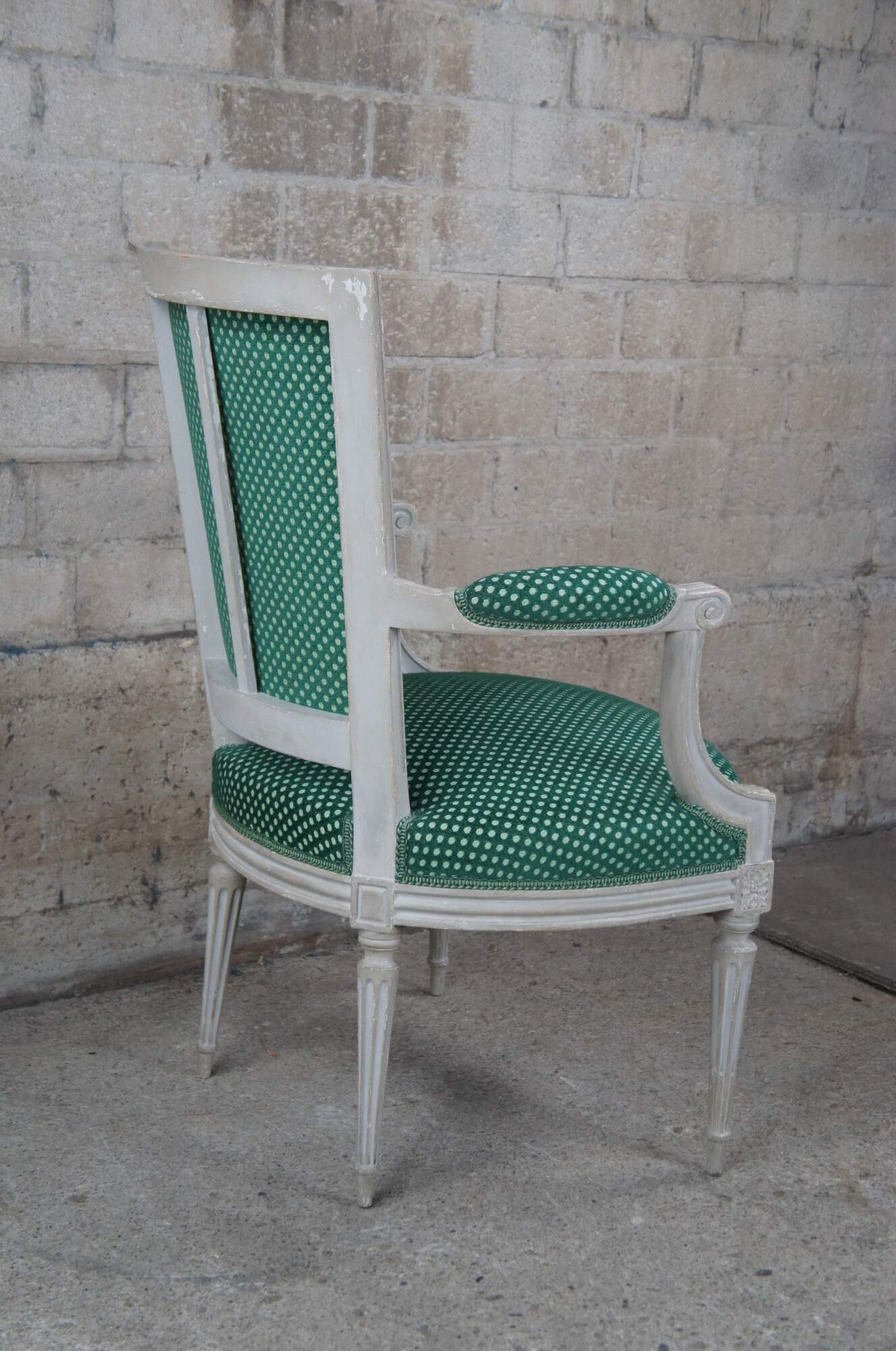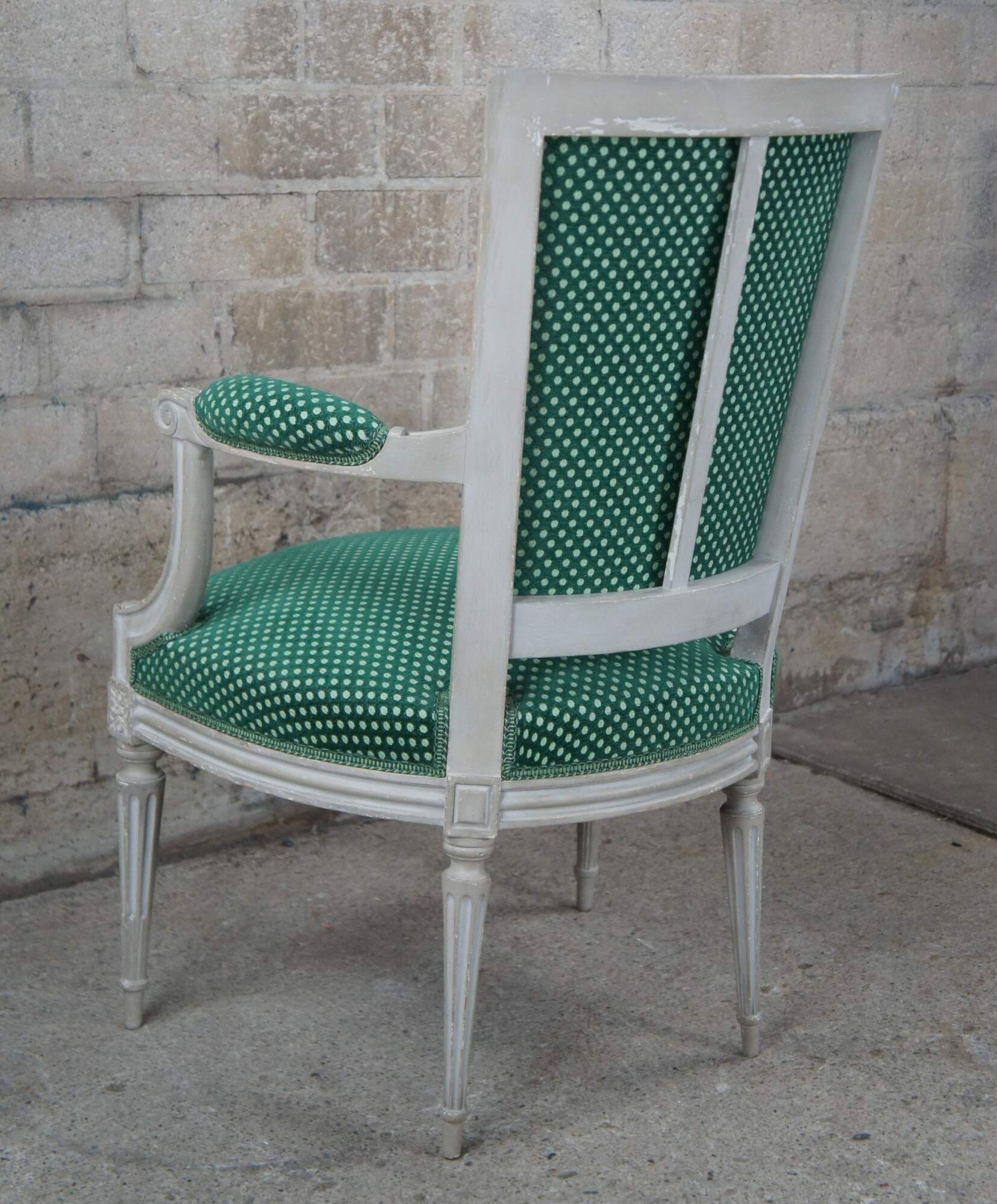 Vintage Louis XVI style occasional or desk chair, circa 1960s. Features a flared back leading to open padded and scrolled arms. The arms are downswept along the front leading to fluted trim and squared floral medallions. The frame is supported by tapered and fluted legs leading to peg feet. Upholstered in a green polka dot fabric.