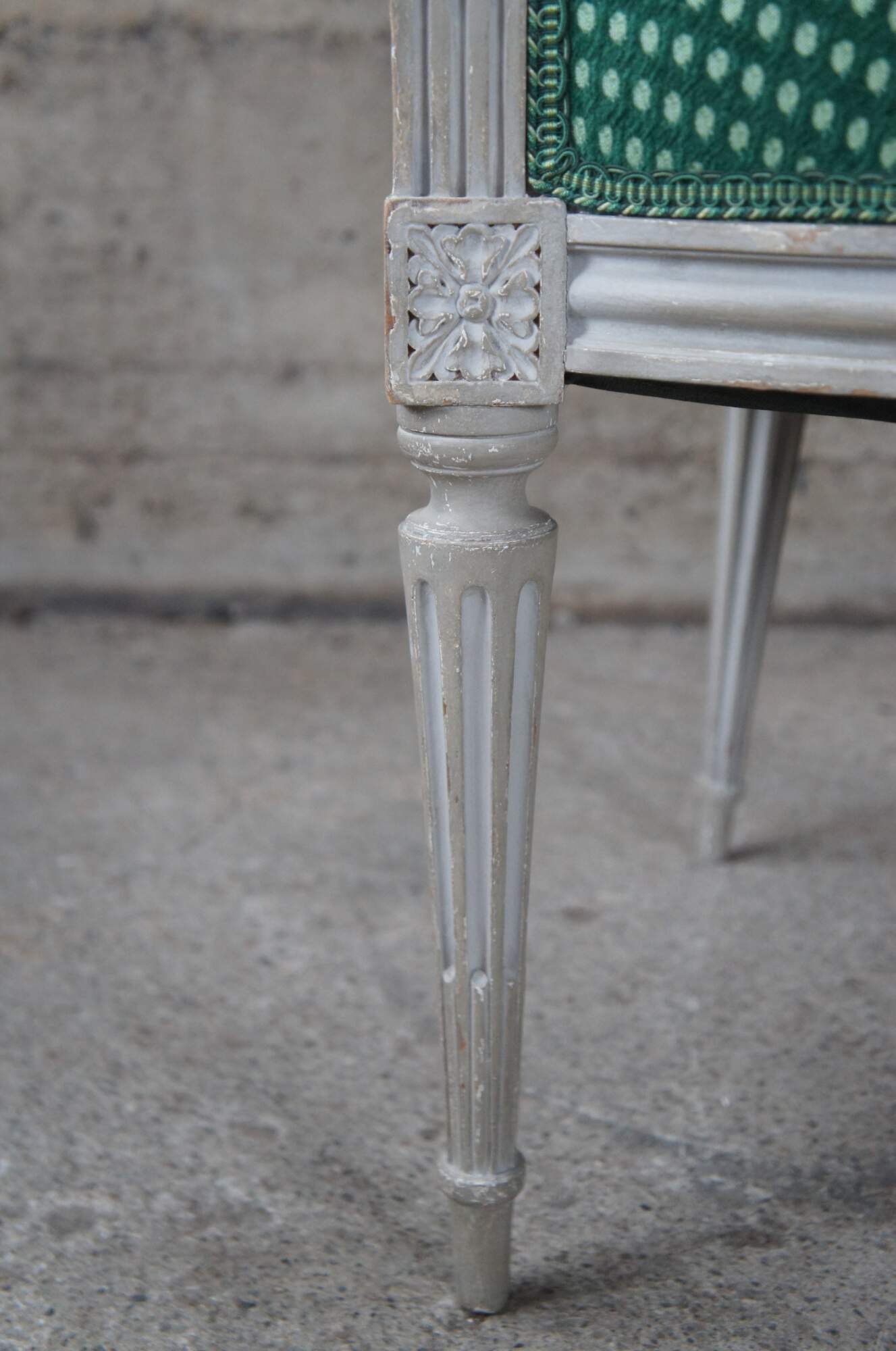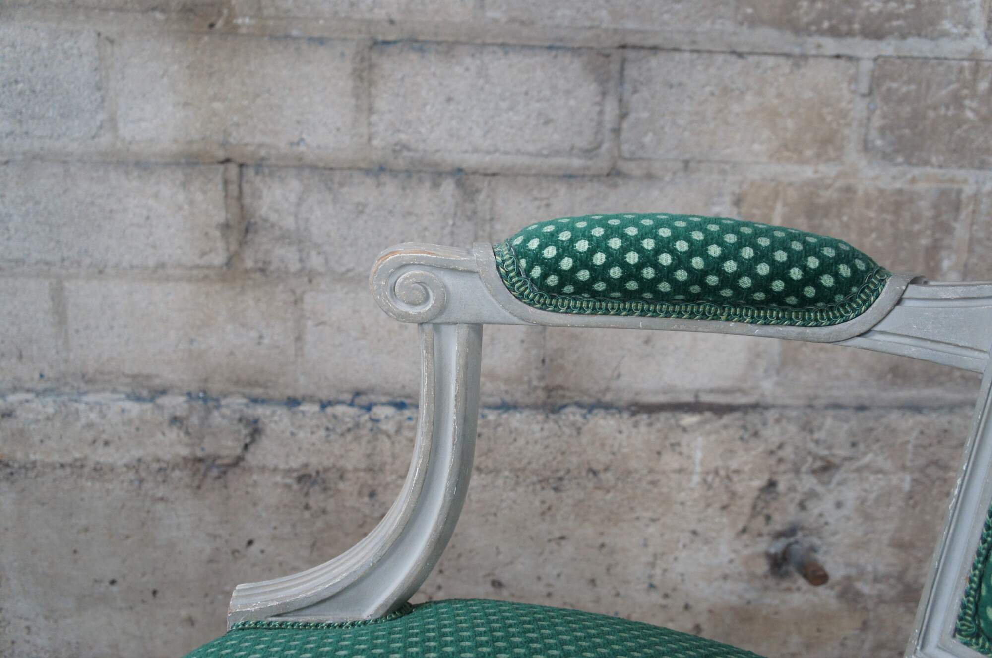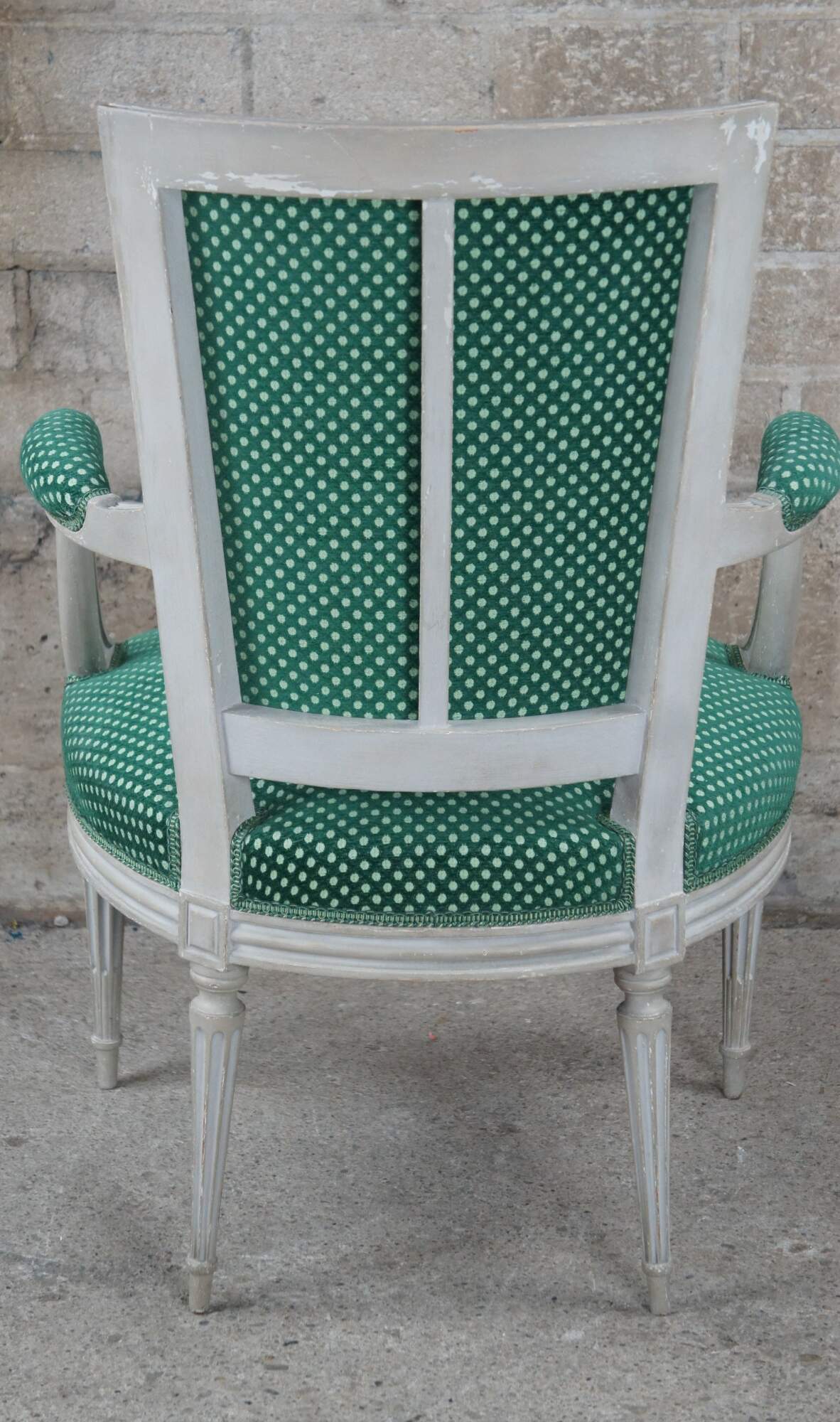 Vintage Louis XVI style occasional or desk chair, circa 1960s. Features a flared back leading to open padded and scrolled arms. The arms are downswept along the front leading to fluted trim and squared floral medallions. The frame is supported by tapered and fluted legs leading to peg feet. Upholstered in a green polka dot fabric.