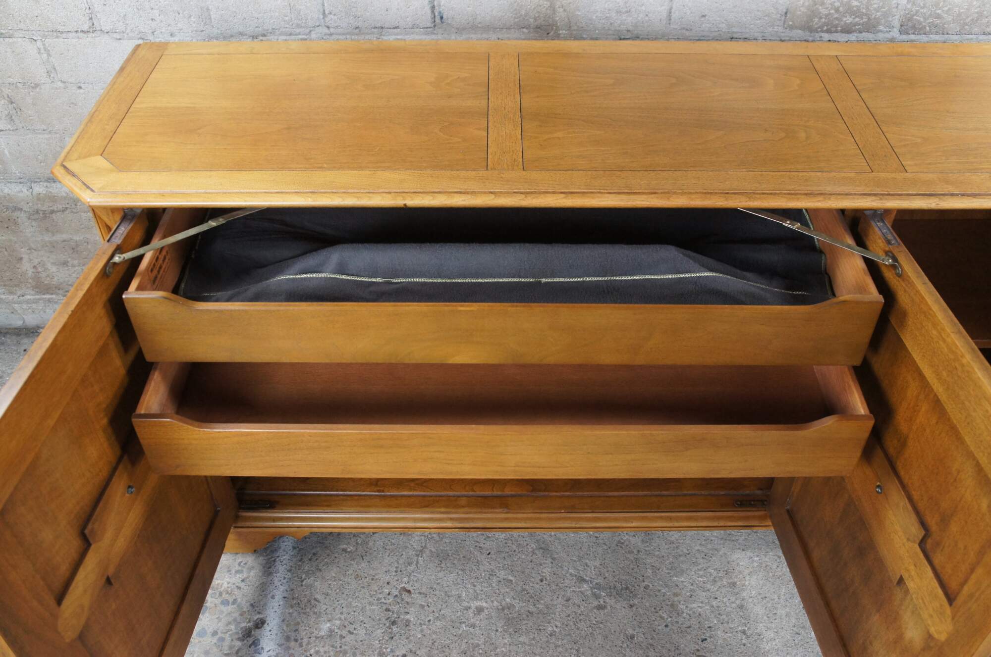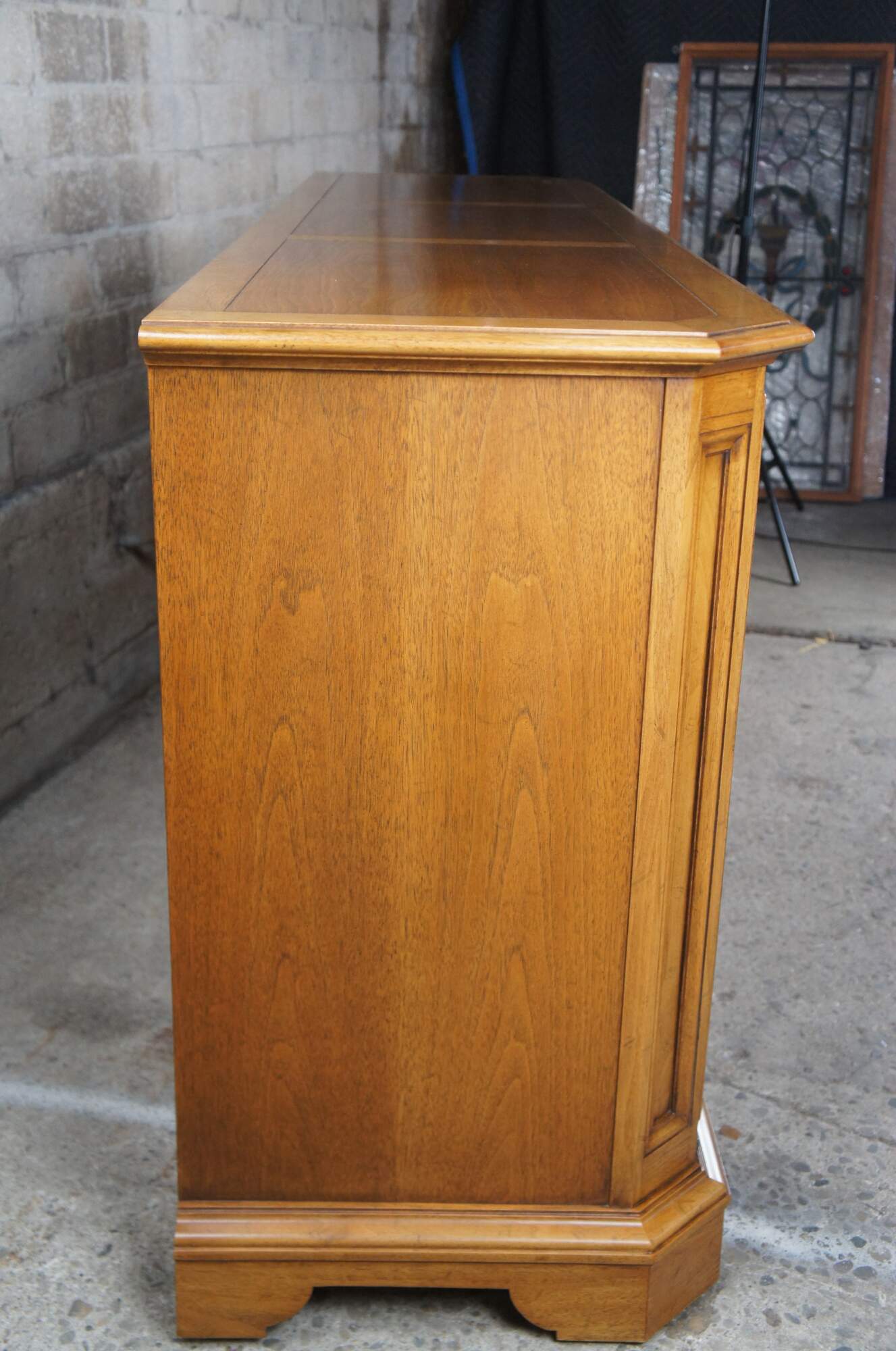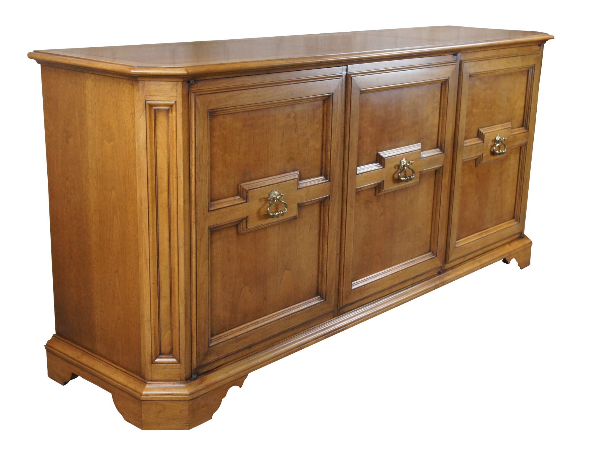 Baker Furniture Milling Road Sideboard, circa 1960s. A rectangular form made from walnut with chamfered corners. The case is fitted with 3 large doors having Italian Neoclassical and Tuscan style paneling. The cabinet opens via brass pulls to a large compartment with two fitted and dovetailed silver cloth lined drawers and one smaller cupboard with shelf. The case is supported by bracket feet. #3041