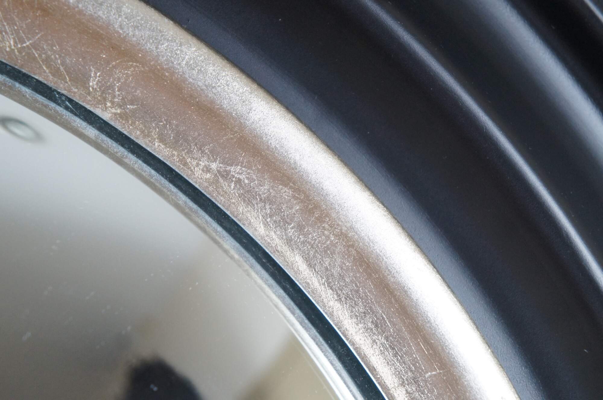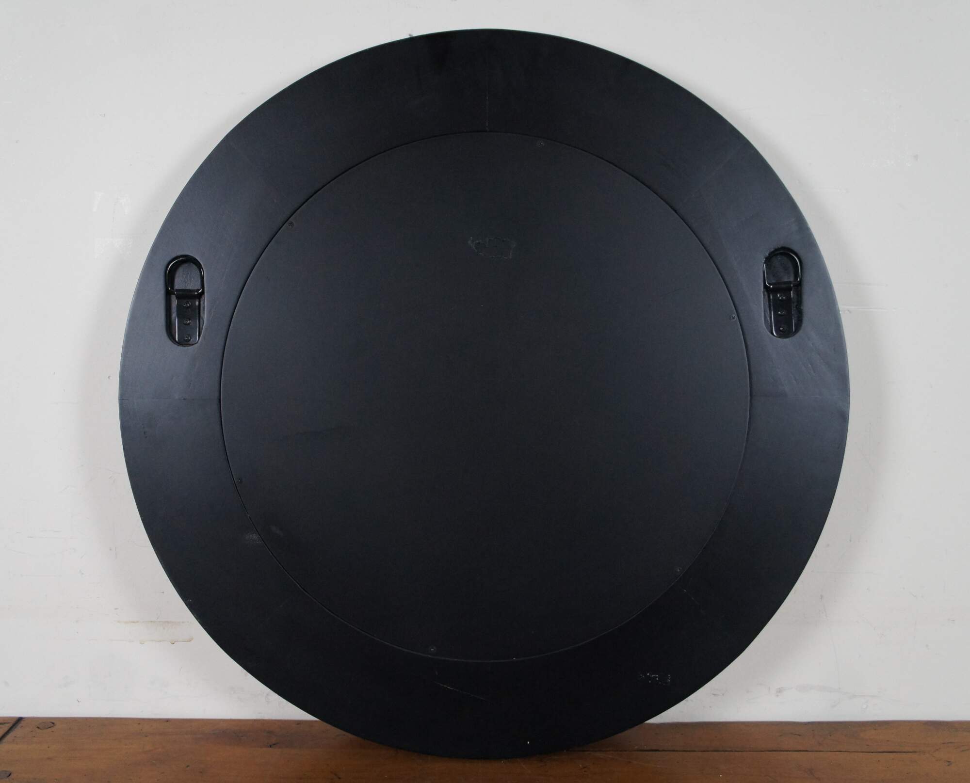Bullseye style convex wall mirror with a black beveled wood frame and champagne gilt trim.