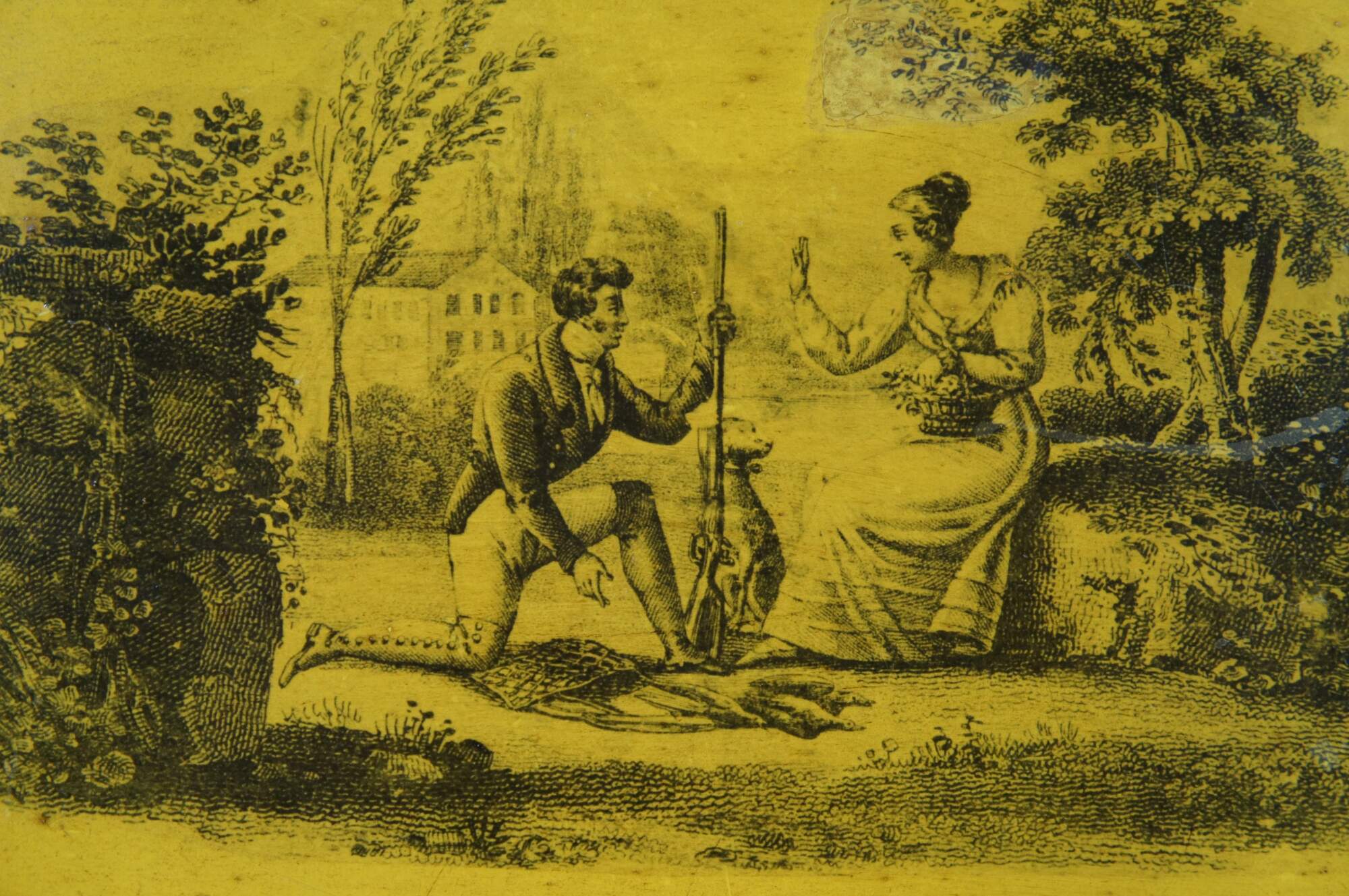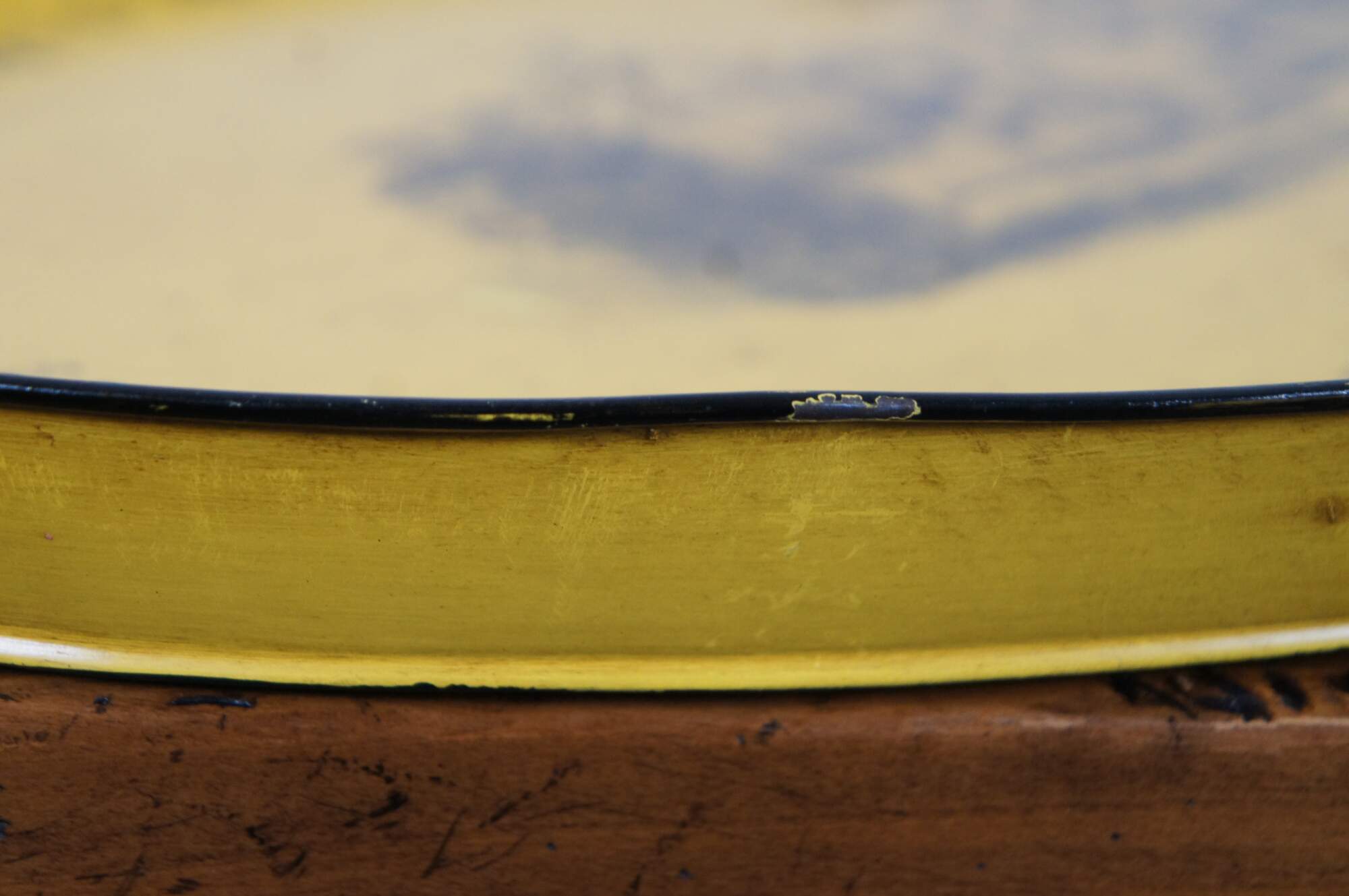 Early 20th century mustard yellow oval toleware serving tray with cut out handles, raised edge with stenciled trim, and French toile style transfer Provincial / Neoclassical scene surrounded by grape vine. Marked on back Italy TF/230.